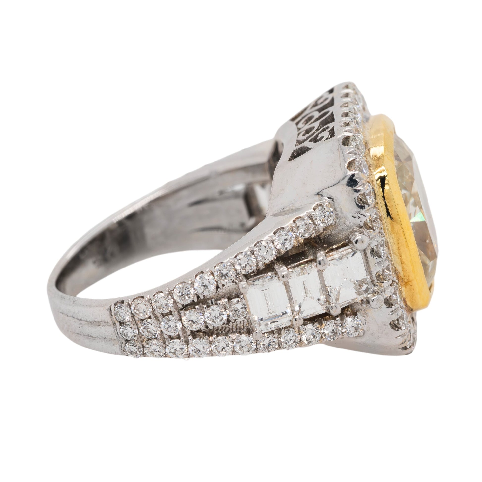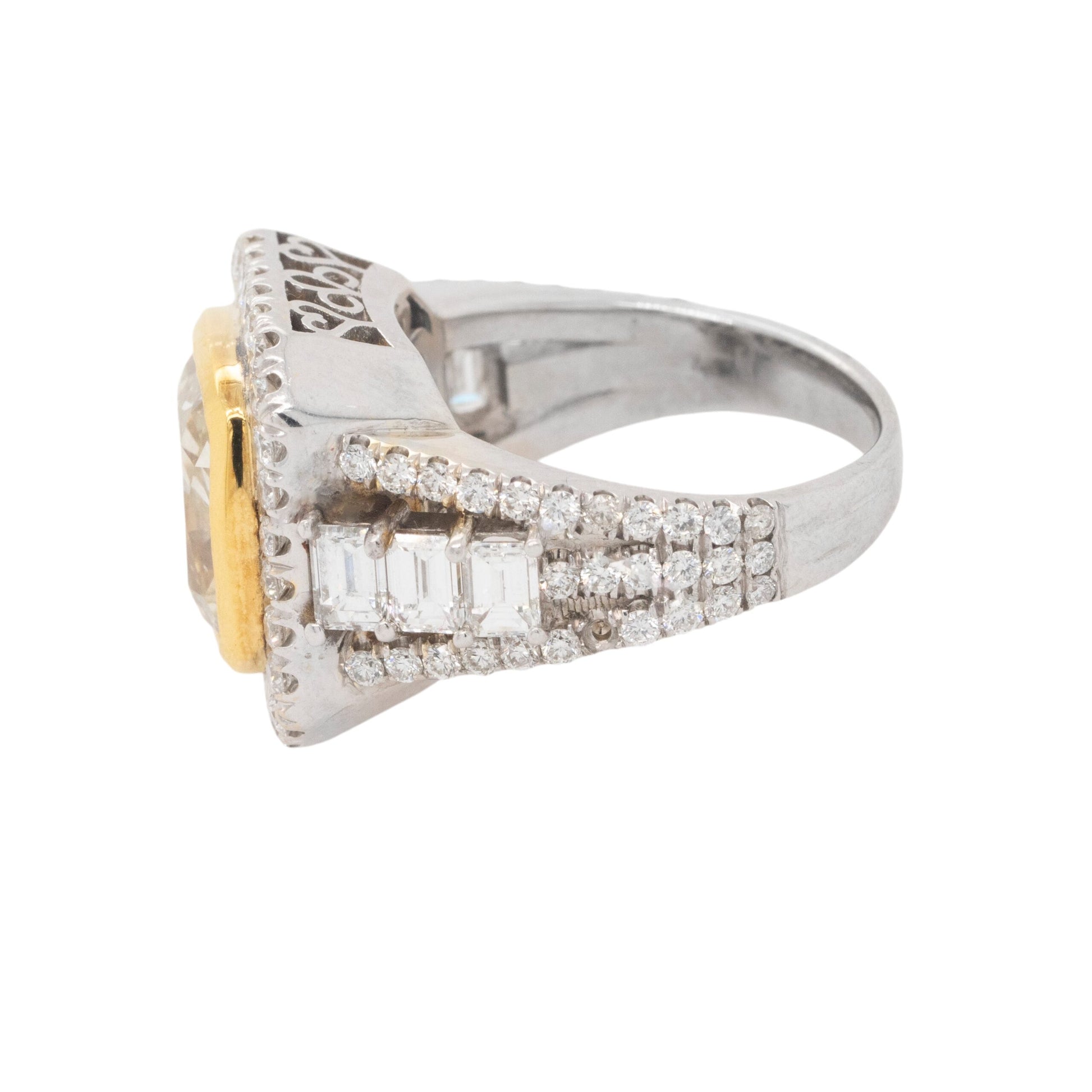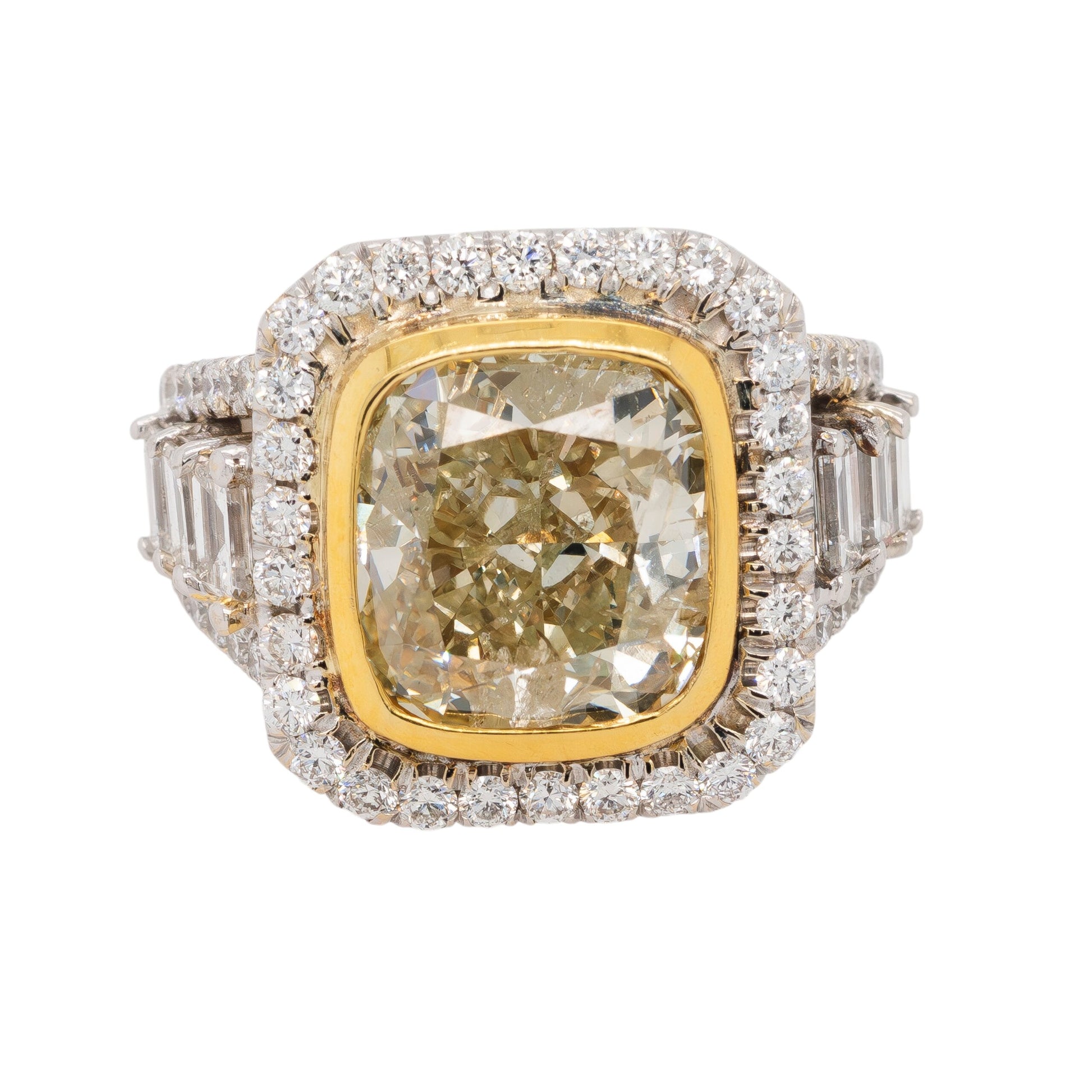 This breathtaking ring features a 5.62 carat fancy yellow cushion-cut diamond, known for its vibrant hue and eye-catching presence. The rich golden tone of the center stone is beautifully framed by approximately 2.00 carats of sparkling white accent diamonds, enhancing its brilliance and depth.