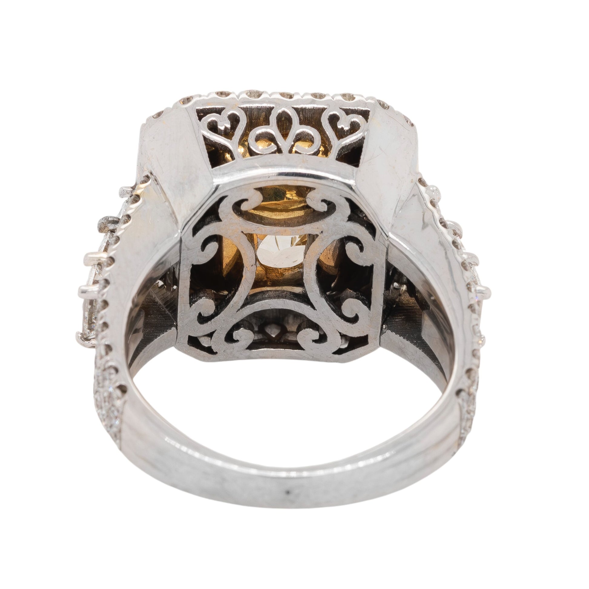 The setting is crafted in 18k white gold, which offers a sleek and modern contrast to the warmth of the yellow diamond. With a total weight of 14.7 grams, this ring has a luxurious feel and a commanding presence on the hand.