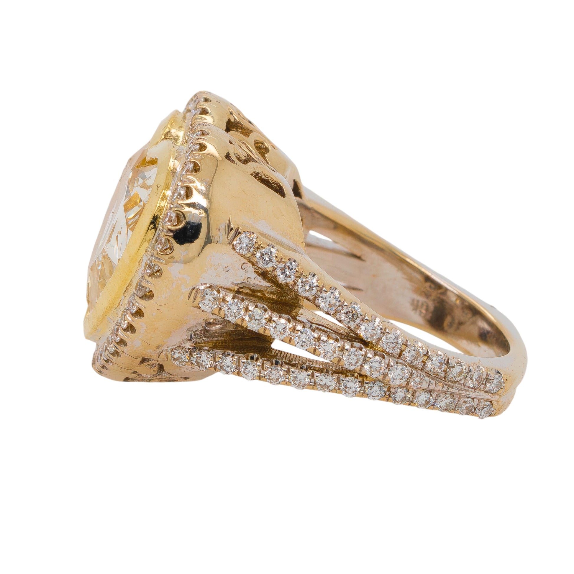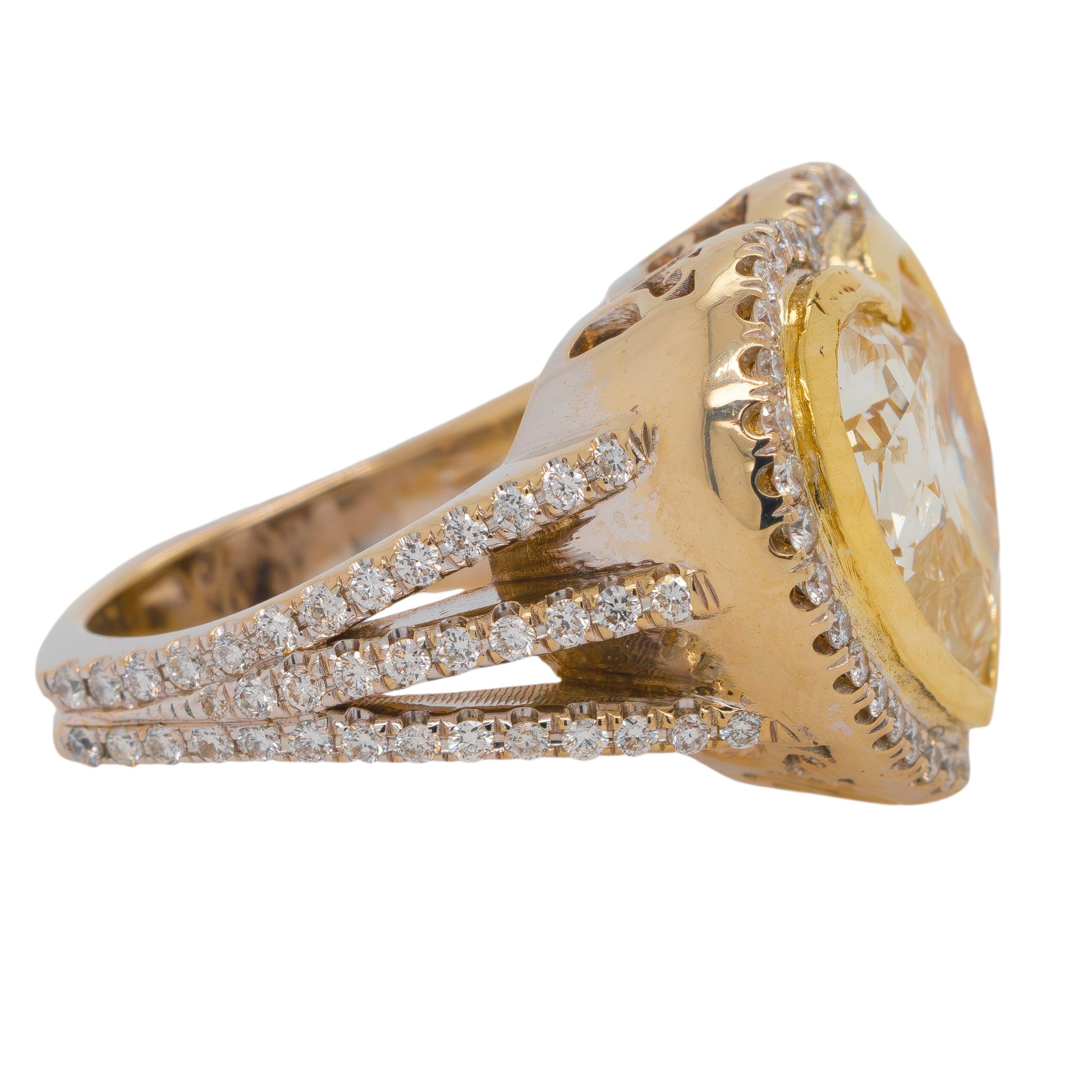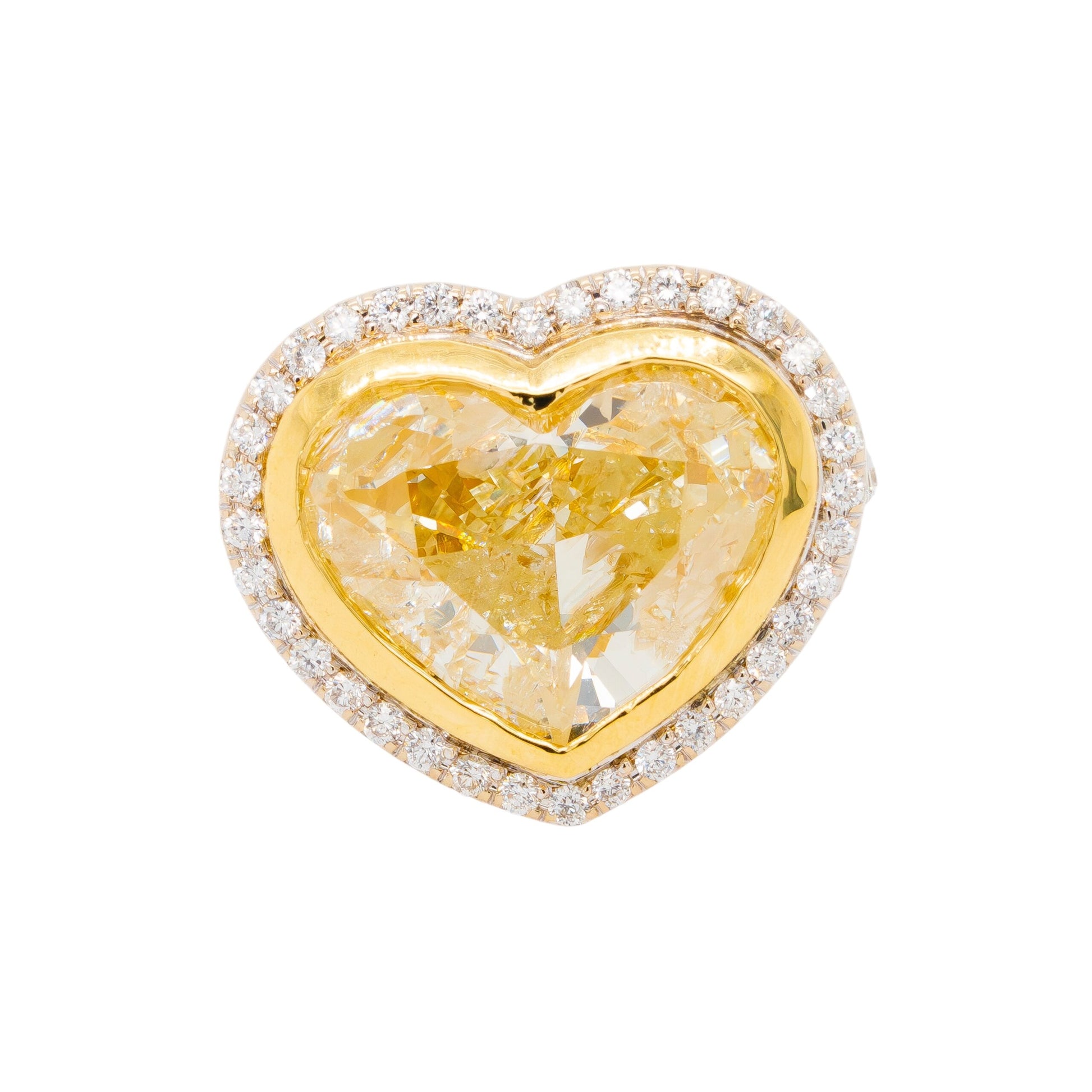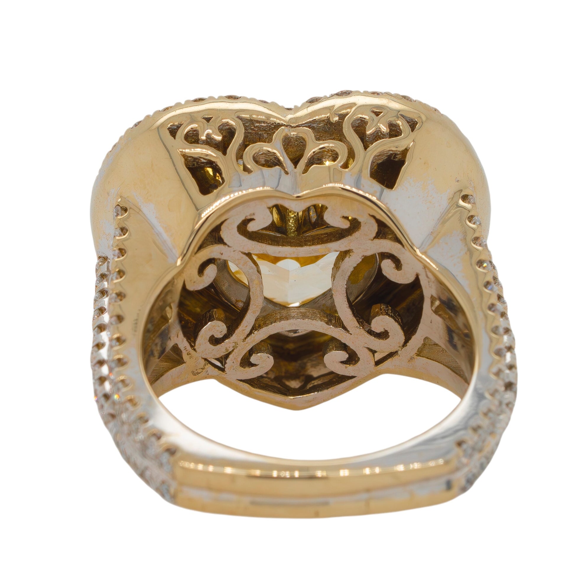 The main Diamond is Heart-Shaped and weighs approximately 8.32 carats and is Fancy Yellow. This ring features approximately 1.98 carats of Accent Diamonds. |