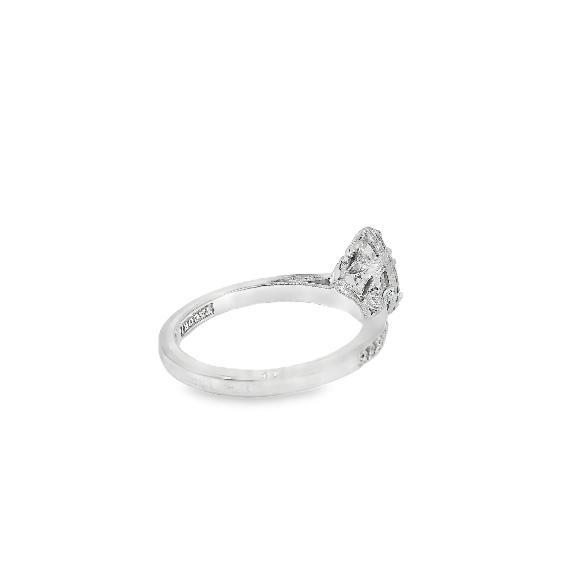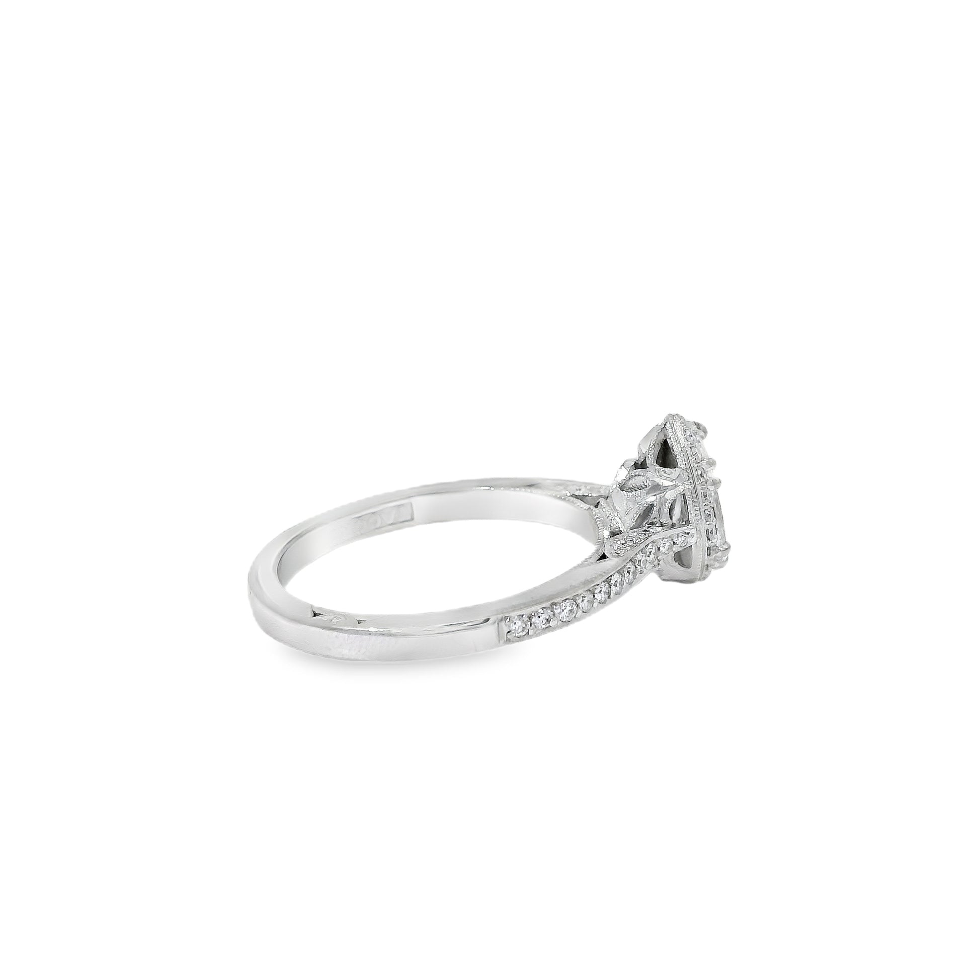 The center diamond weighs approximately 0.55 carats and features a Pear cut set with a 0.26ctw Pave Natural Accent Diamond Band. It is GIA Certified and graded D in color and IF in clarity. |