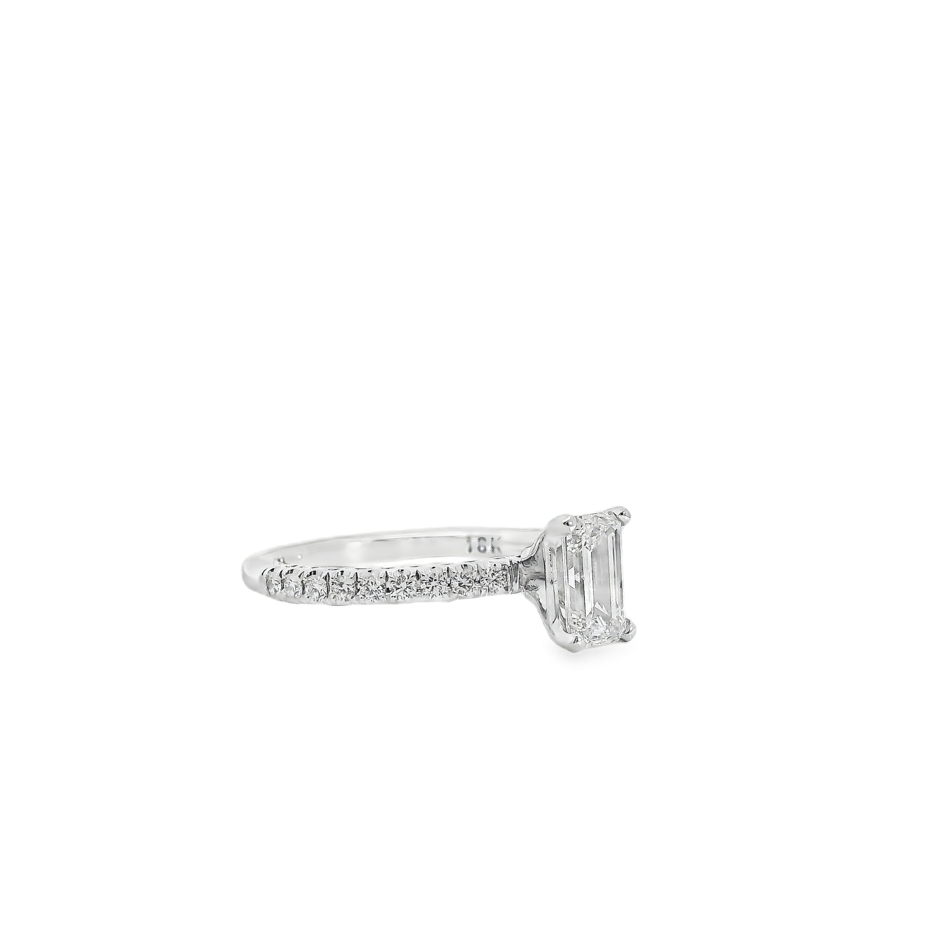 This refined 18k white gold engagement ring features a mesmerizing 0.80-carat emerald-cut natural diamond, beautifully showcased in a timeless, sophisticated setting. Certified by GIA, the diamond is graded K in color and VS2 in clarity—offering crisp transparency, clean facets, and the elegant hall-of-mirrors brilliance that emerald cuts are celebrated for.