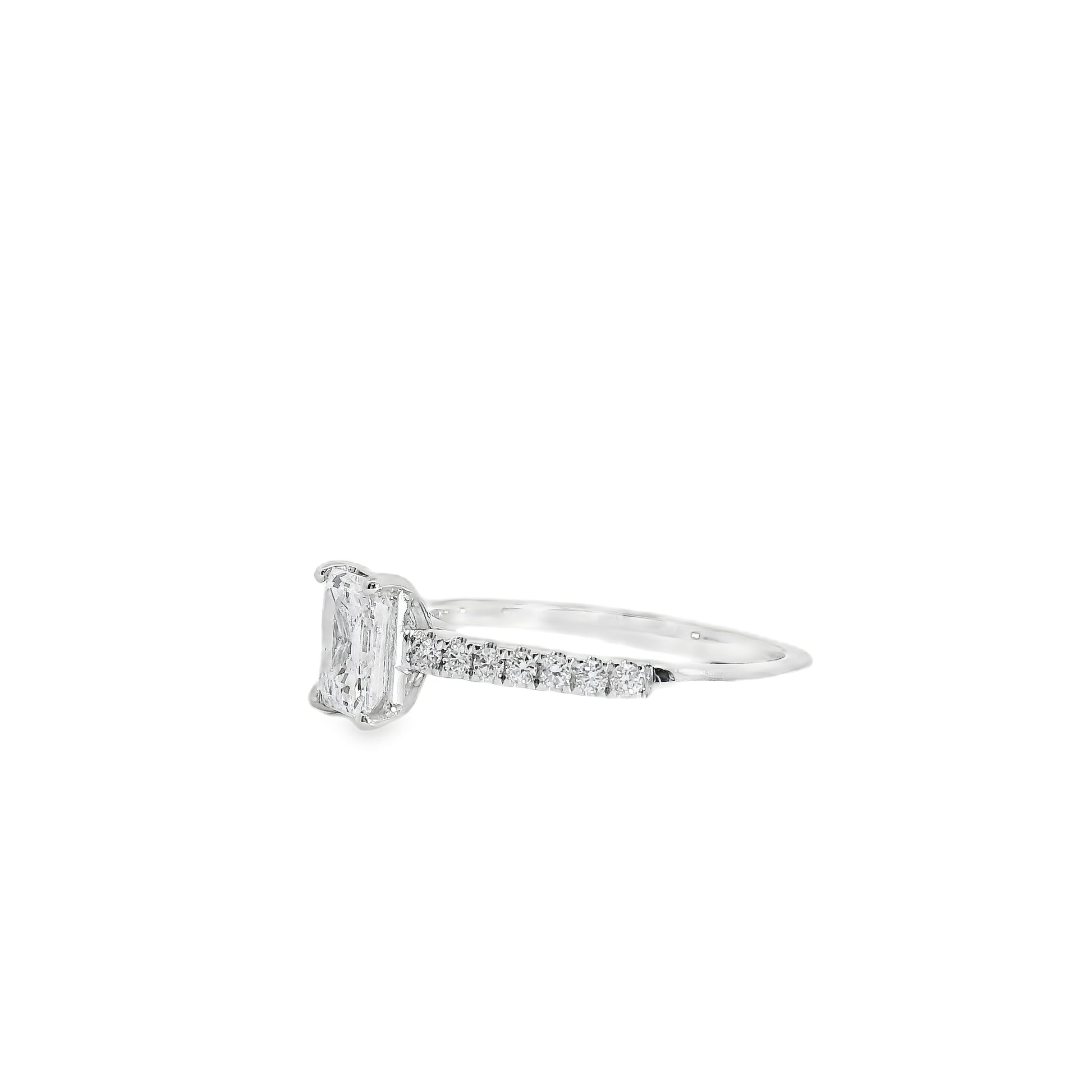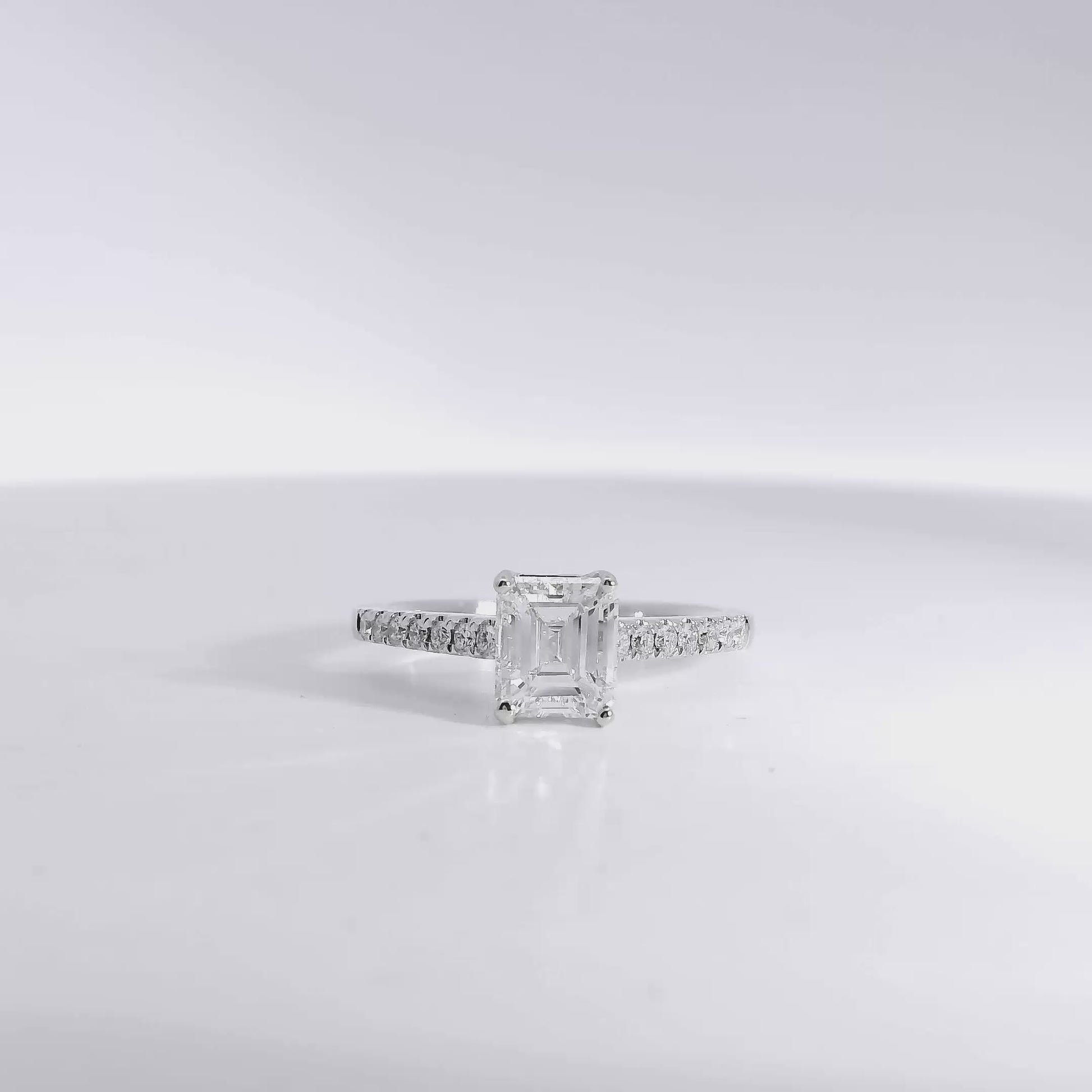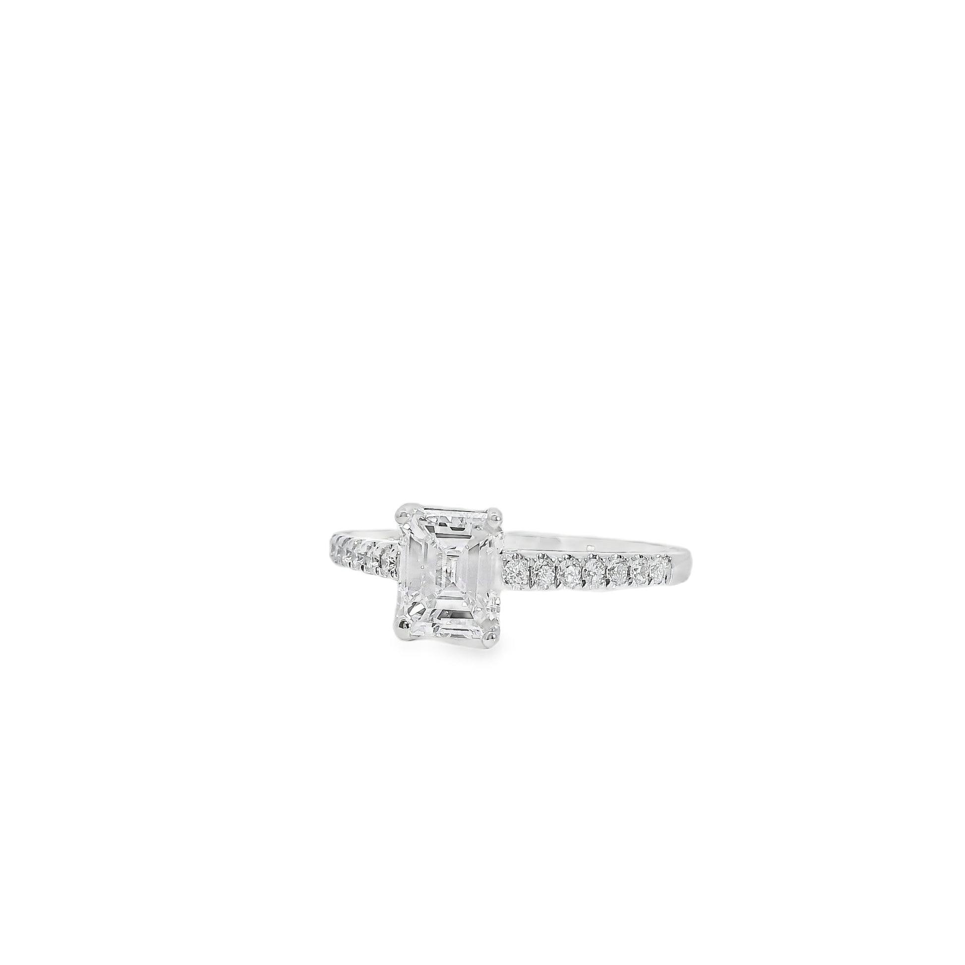 This exquisite 18k white gold engagement ring showcases a breathtaking 1.03-carat emerald-cut natural diamond, certified by GIA for exceptional quality and beauty. Graded F in color and VS1 in clarity, the center stone displays outstanding brilliance and pristine transparency—its crisp facets creating the signature hall-of-mirrors effect that makes emerald cuts so timeless and alluring.