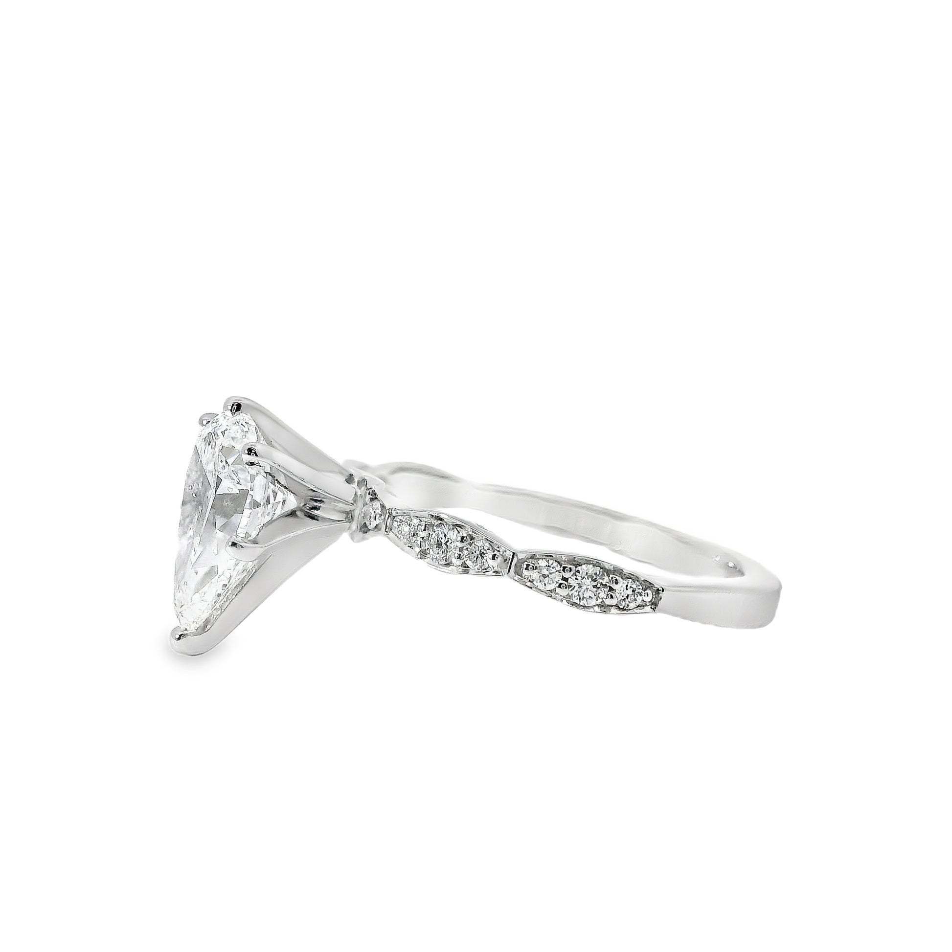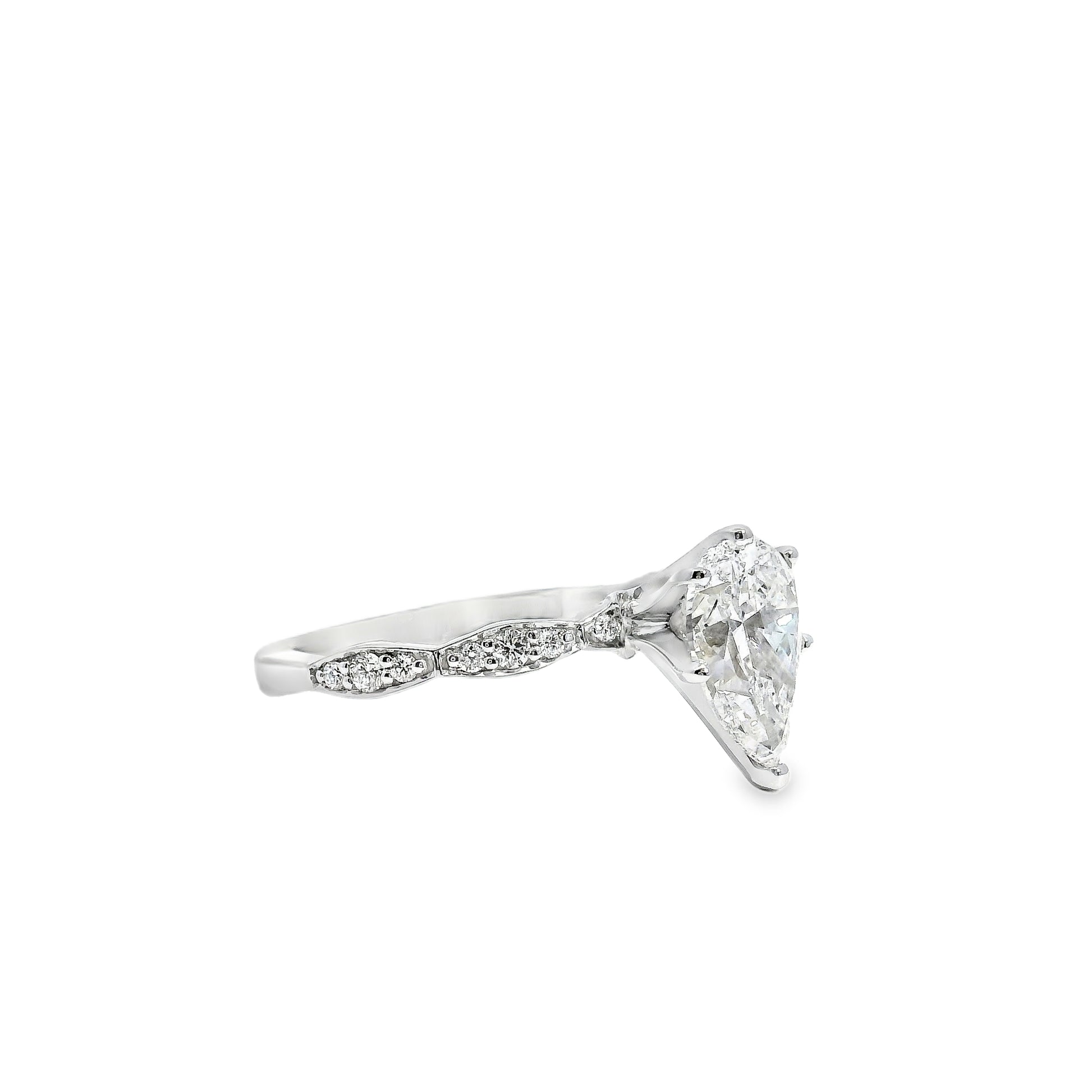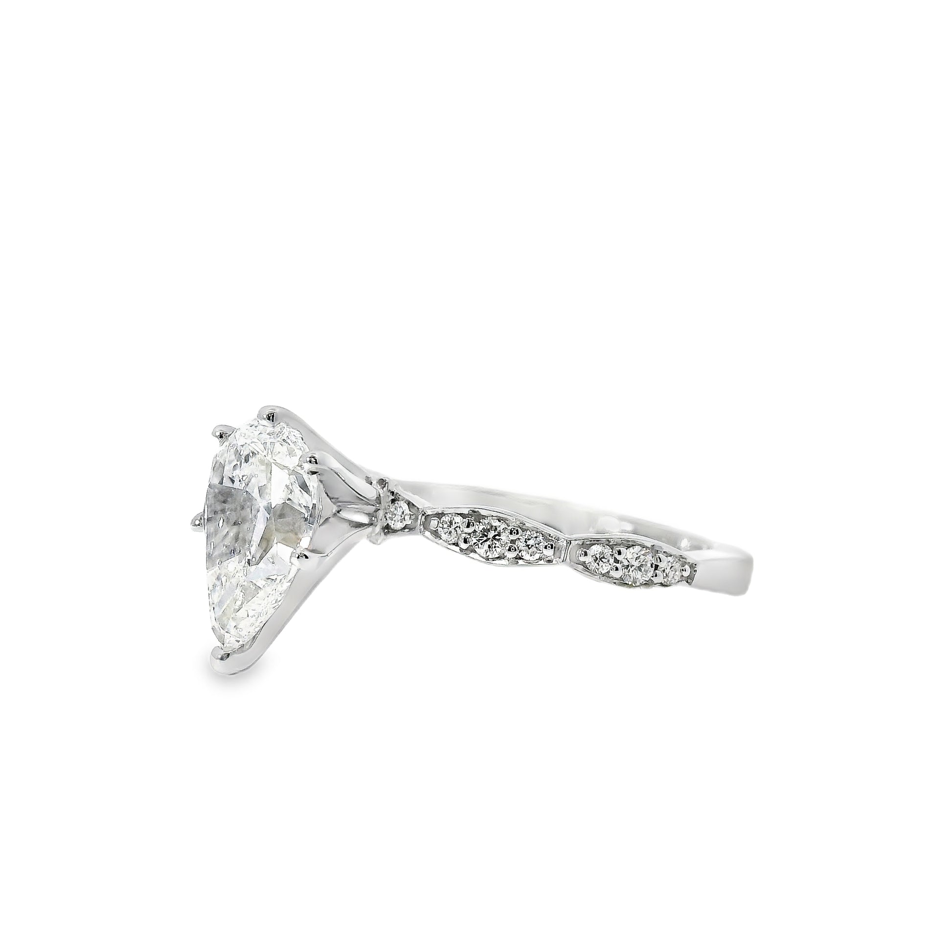This exquisite engagement ring features a 1.71 carat pear-cut diamond at its center, offering a graceful teardrop silhouette that elongates the finger and catches the light with every movement.
