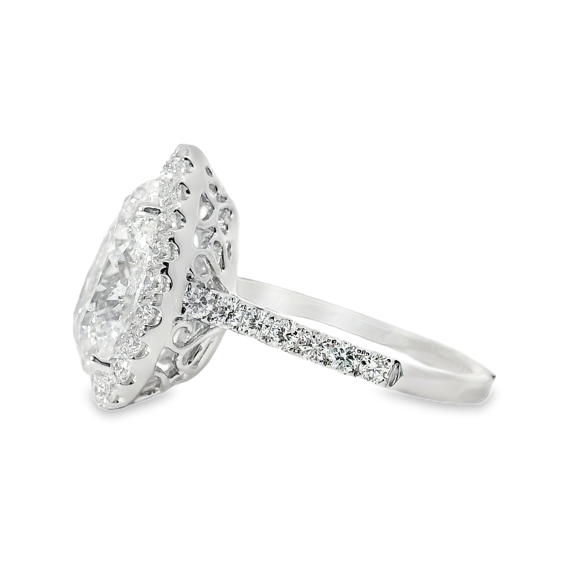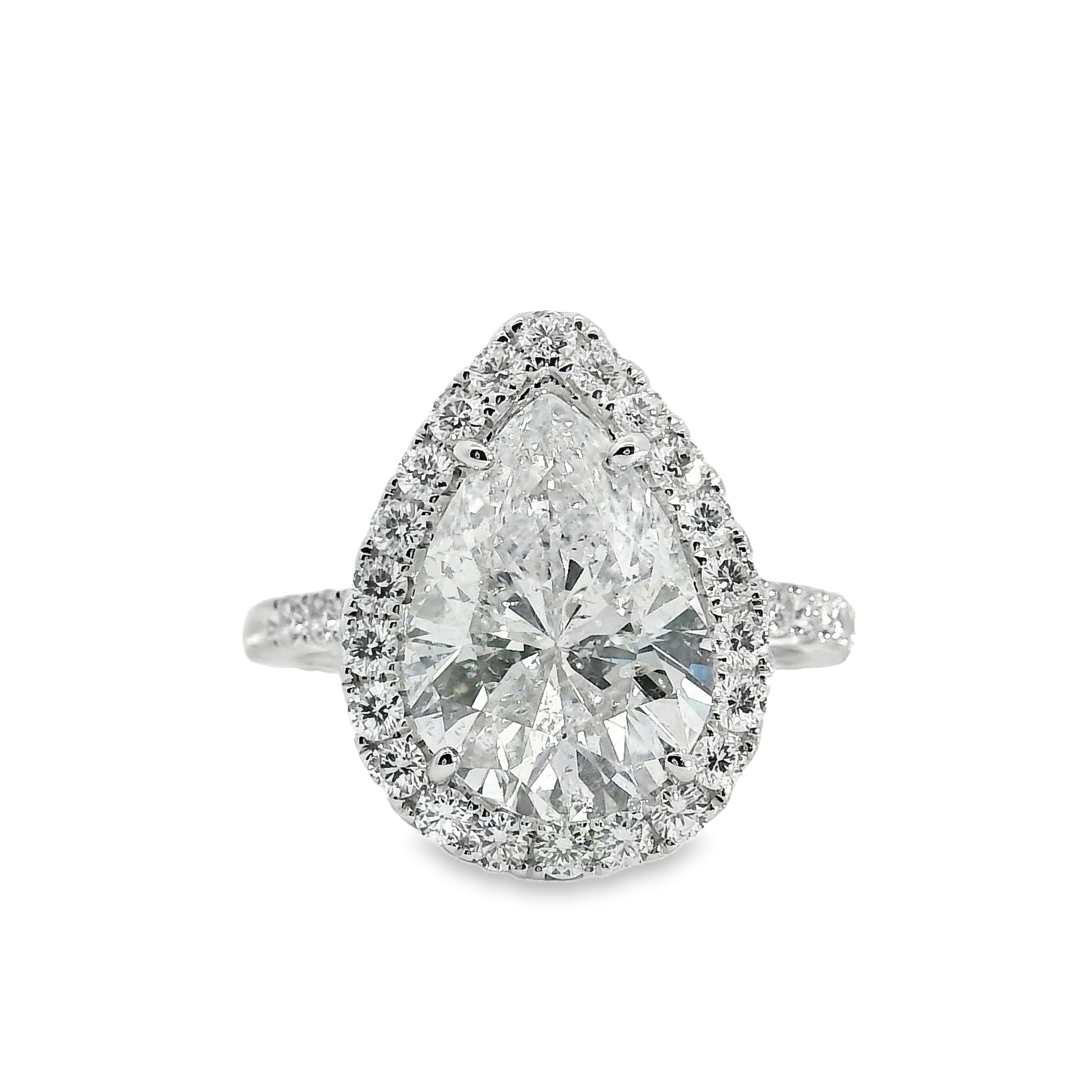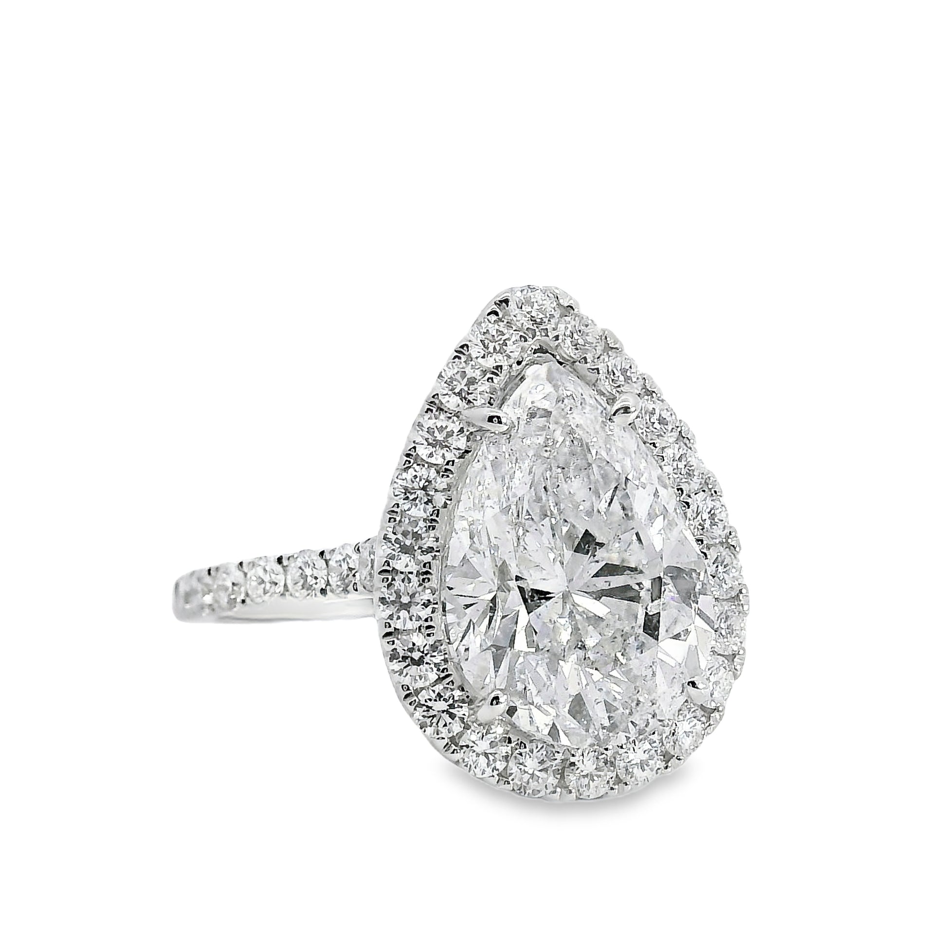This exquisite engagement ring showcases a 4.02 carat pear-cut diamond as its captivating centerpiece, accented by 0.76 carats of round brilliant-cut diamonds that enhance its radiant sparkle and timeless elegance.