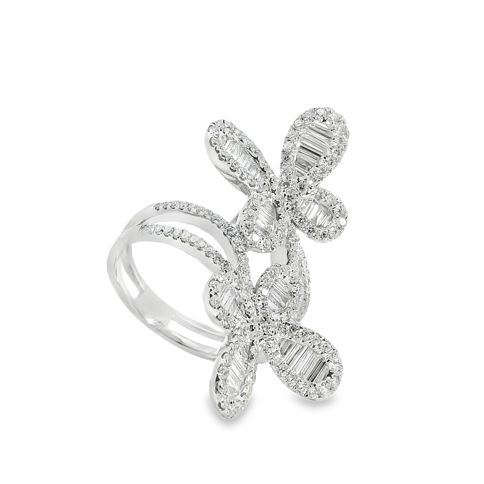 Make a graceful statement with this 18k white gold double butterfly ring, a captivating symbol of elegance and transformation. This exquisite design features approximately 1.67 carats of natural mixed-shape diamonds, meticulously arranged to form two shimmering butterflies that appear to flutter with brilliance.