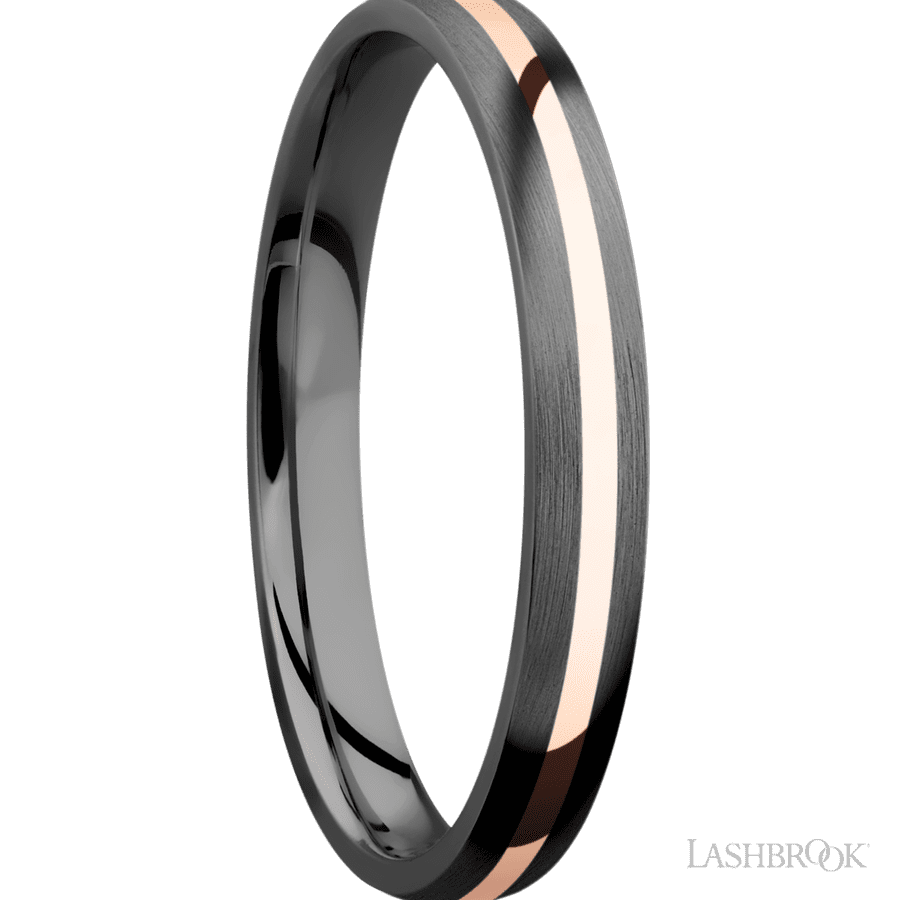 3 mm wide/Domed/Zirconium band with one 1 mm Centered inlay of 14K Rose Gold.
