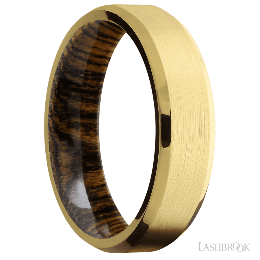 6 mm wide Beveled 18K Yellow Gold band featuring a Bocote sleeve.