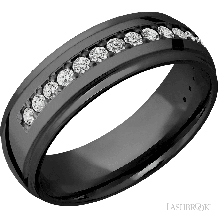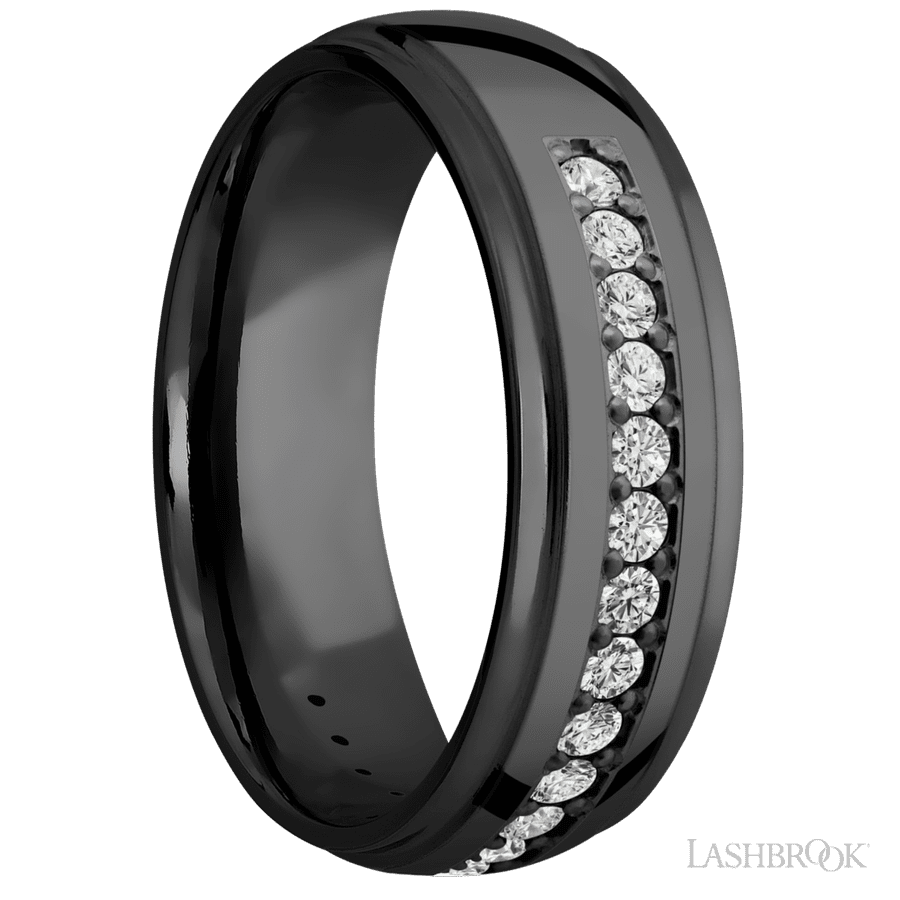 7 mm wide/Domed Stepped Down Edges/Zirconium band with a Half Eternity arrangement of .03 carat Round Diamond stones in a Bead setting.