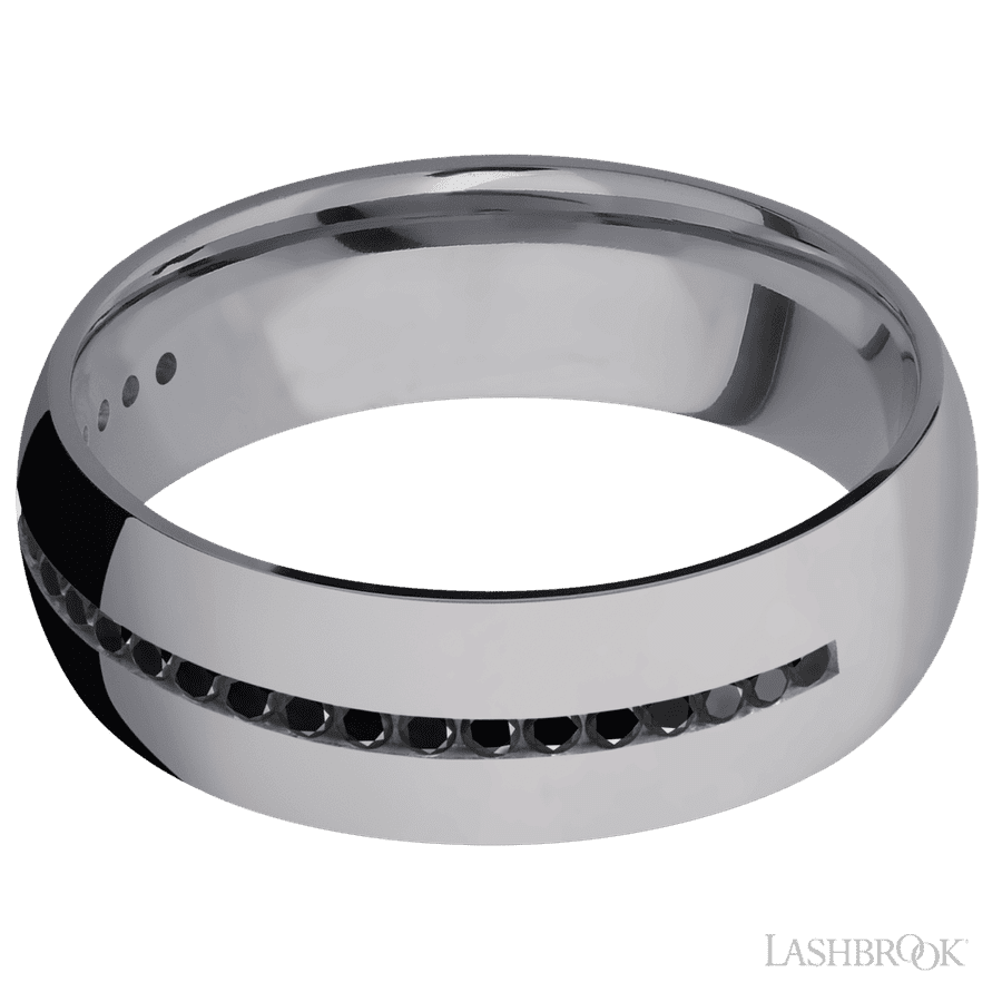 7 mm wide/Domed/Tantalum band with a Half Eternity arrangement of .015 carat Round Black Diamond stones in a Channel setting.