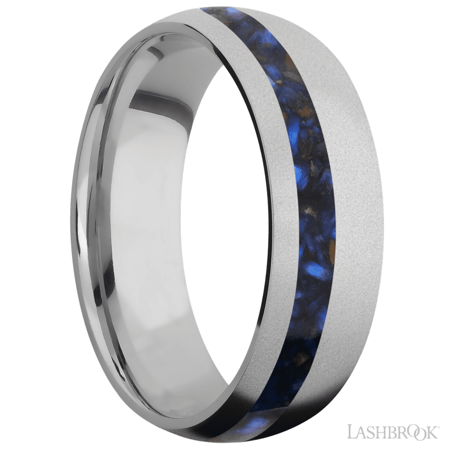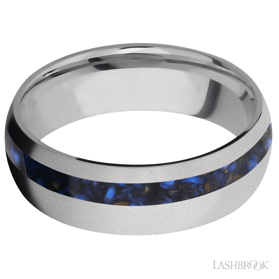 7 mm wide/Domed/Titanium band with one 2 mm Off Center inlay of Blue Tiger Eye.