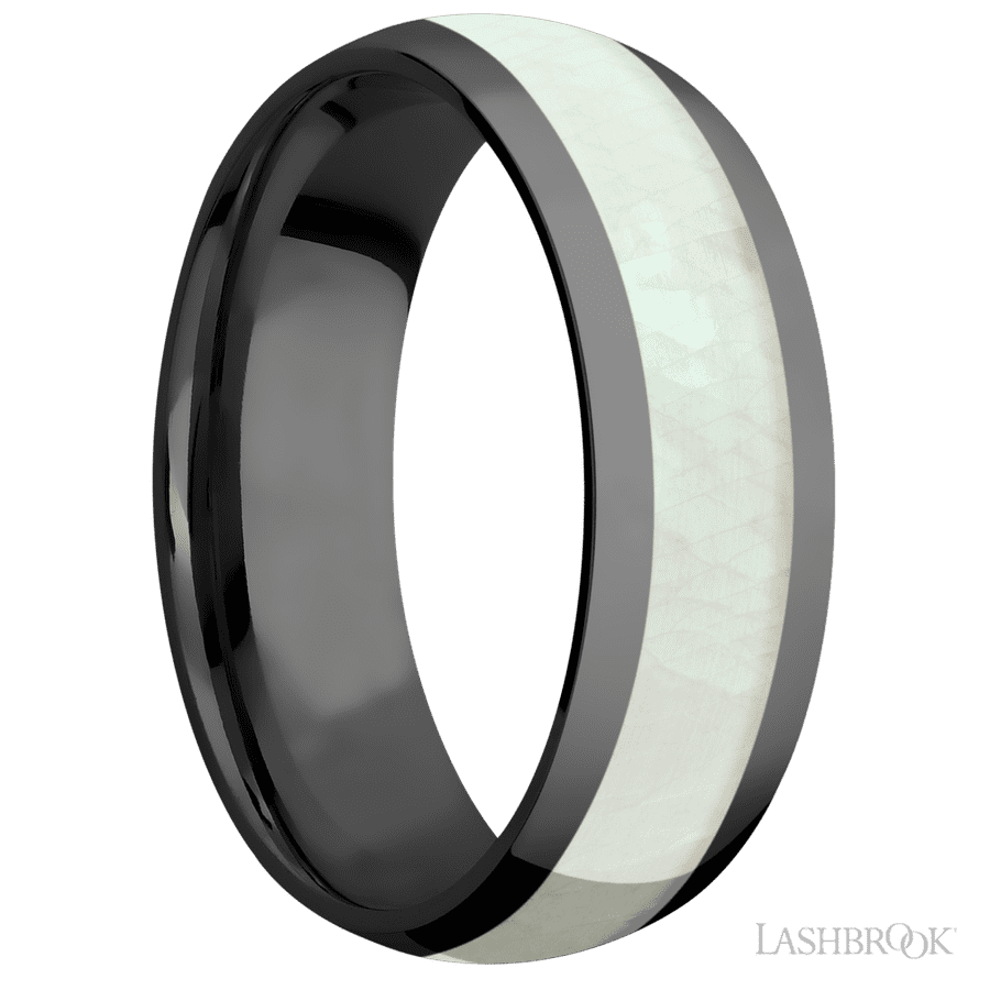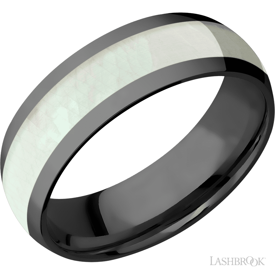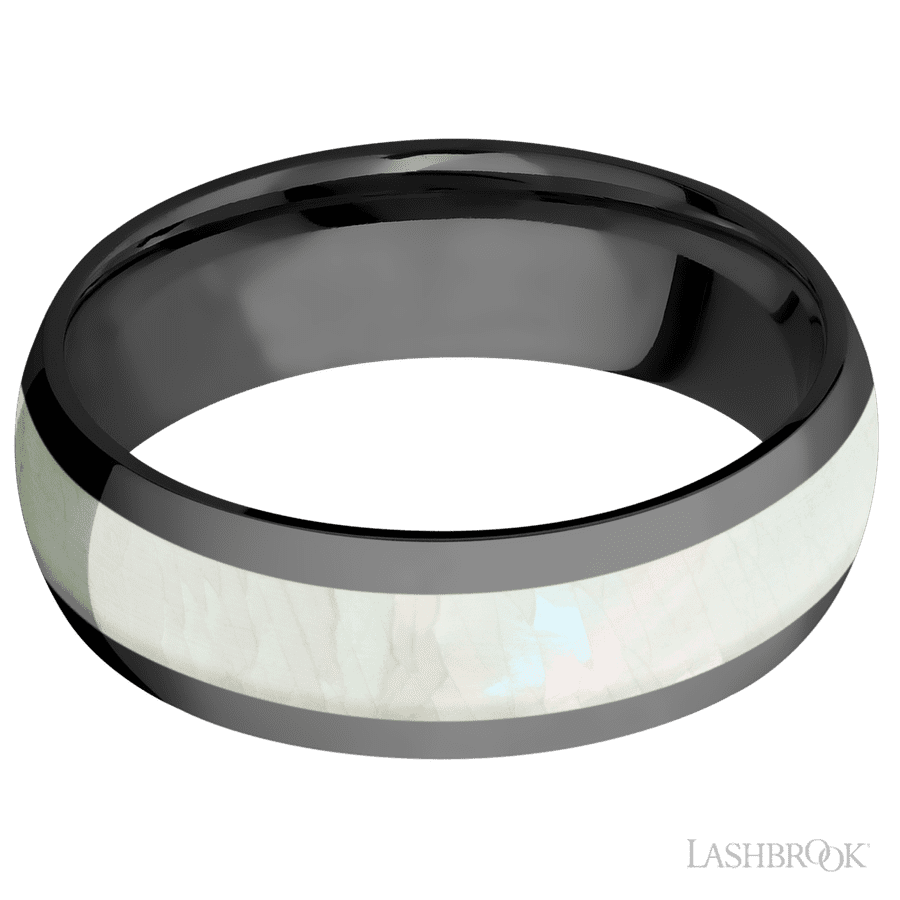 7 mm wide/Domed/Zirconium band with one 4 mm Centered inlay of Freshwater Mother of Pearl.