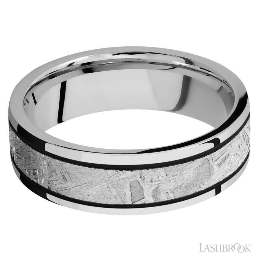 7 mm wide/Flat/Cobalt Chrome band with one 4 mm Centered inlay of Meteorite.
