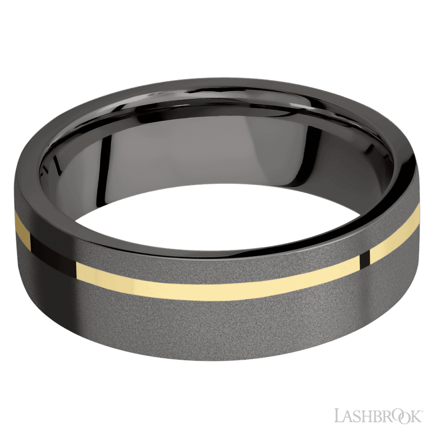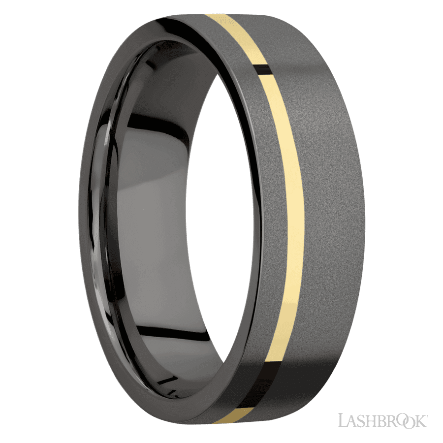7 mm wide/Flat/Tantalum Noir band with one 1 mm Off Center inlay of 14K Yellow Gold.