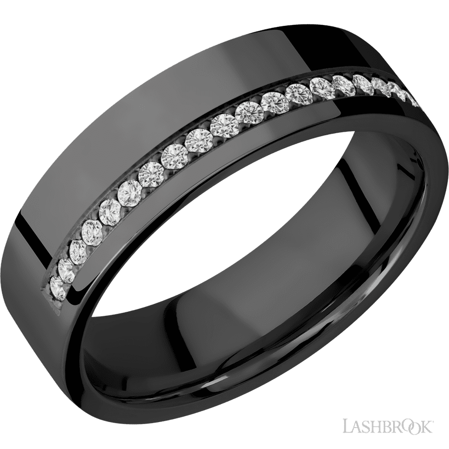 7 mm wide/Flat/Zirconium band with a Off Center Half Eternity arrangement of .015 carat Round Diamond stones in a Bead setting.