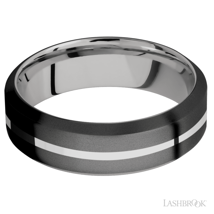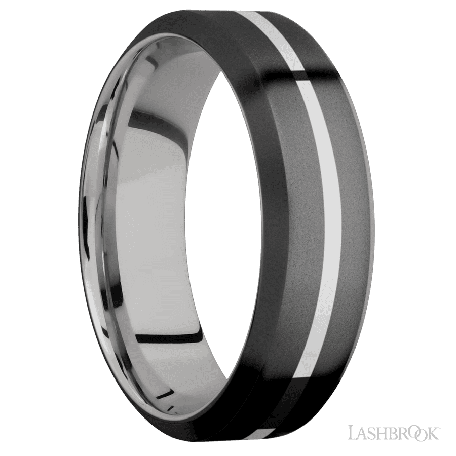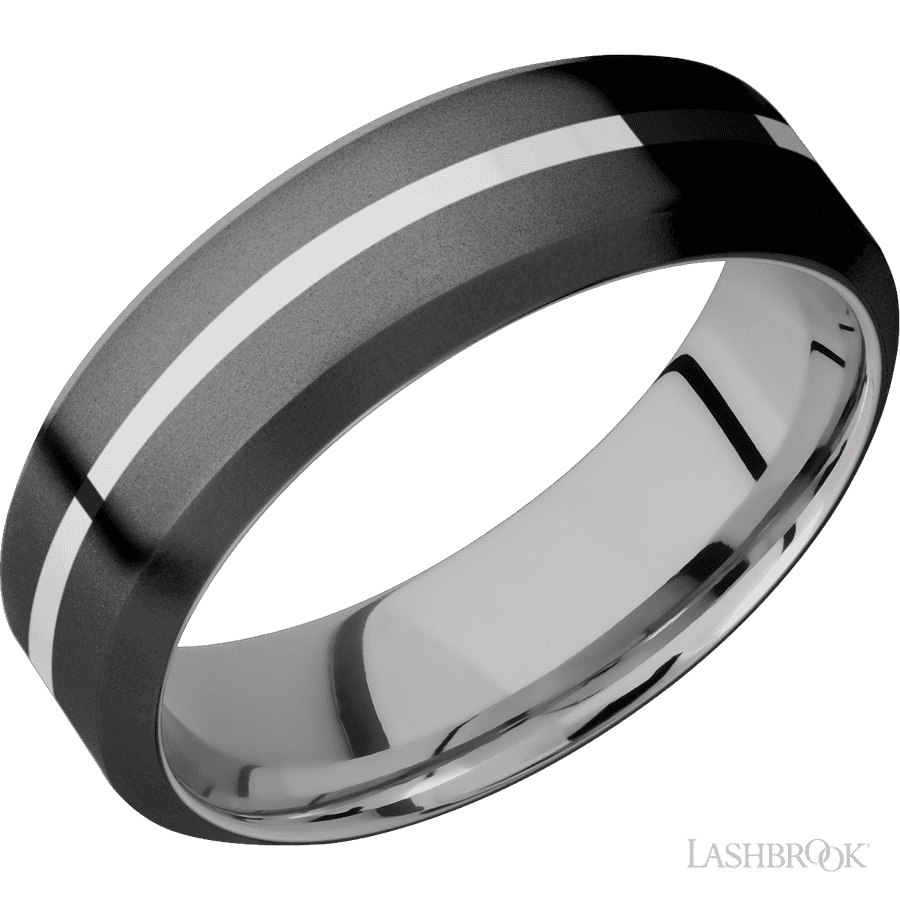 7 mm wide/High Bevel/Zirconium band with one 1 mm Centered inlay of Palladium Silver also featuring a Palladium Silver sleeve.