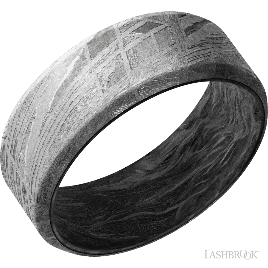 8 mm wide Beveled Meteorite band featuring a Forged Carbon Fiber sleeve.