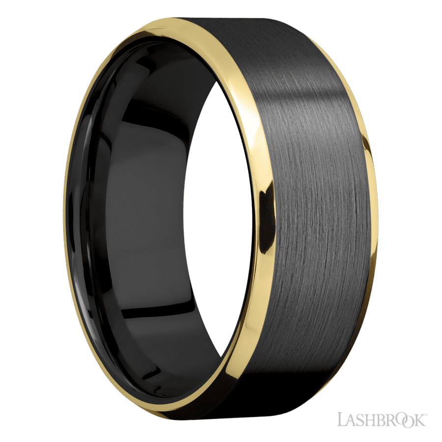 Z8B21EDGE(NS)/14KY 8 mm wide/Beveled/Zirconium band with two 1 mm Edge inlays of 14K Yellow Gold.
