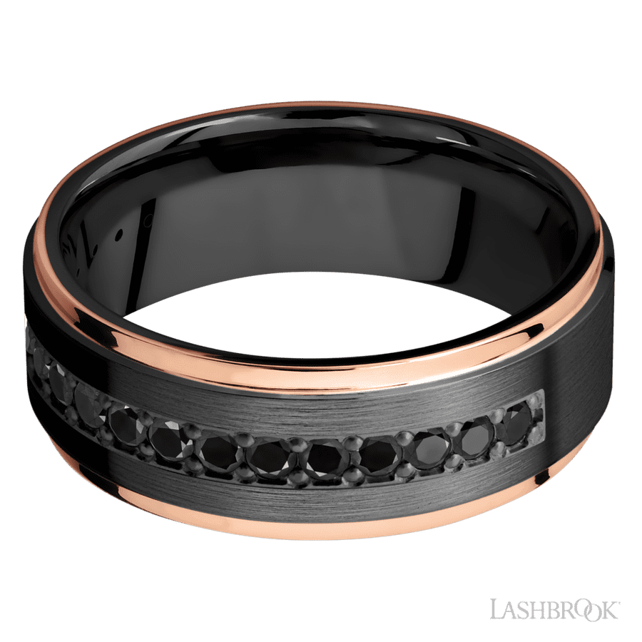 8 mm wide/Flat Grooved Edges/Zirconium band with a Half Eternity arrangement of .03 carat Round Black Diamond stones in a Bead setting and featuring two 1 mm Edge inlays of 14K Rose Gold