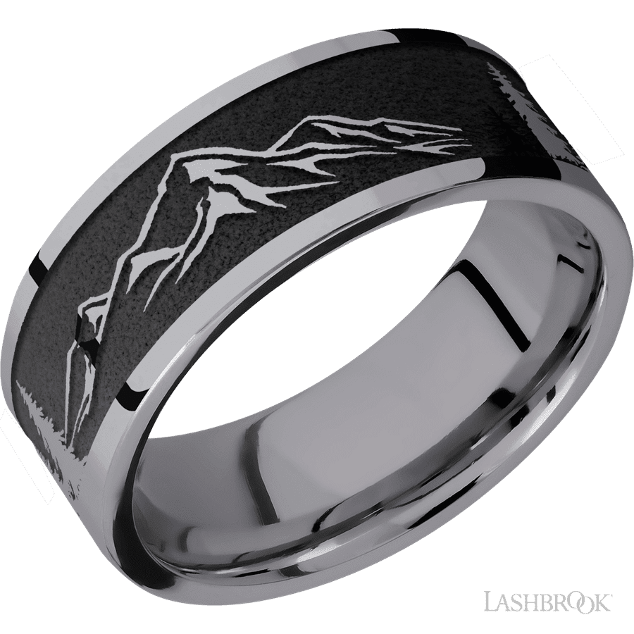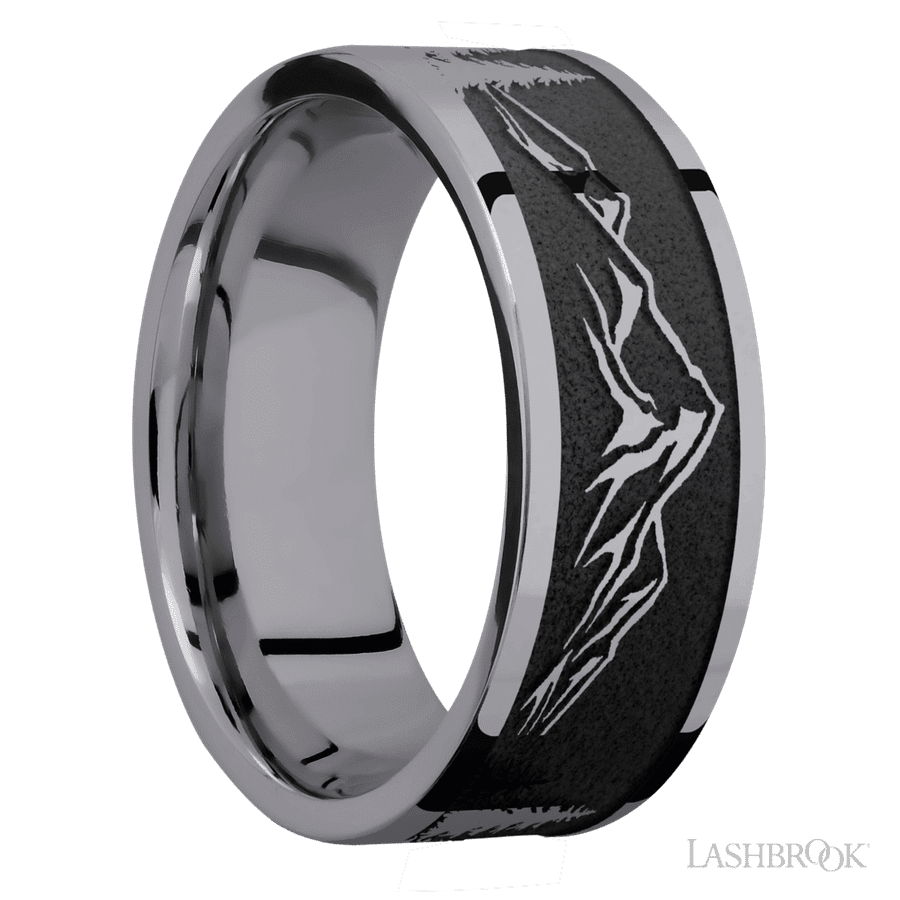 8 mm wide/Flat/Tantalum band with a laser carved Mountain 2 pattern.