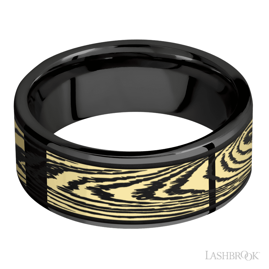8 mm wide/Flat/Zirconium band with one 6 mm Centered inlay of 14K Yellow Gold with a laser carved Woodgrain pattern.