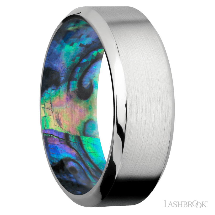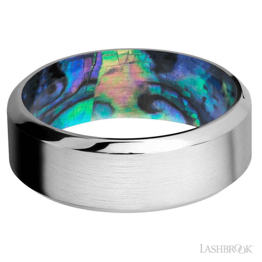 8 mm wide High Bevel Cobalt Chrome band featuring a Abalone sleeve.