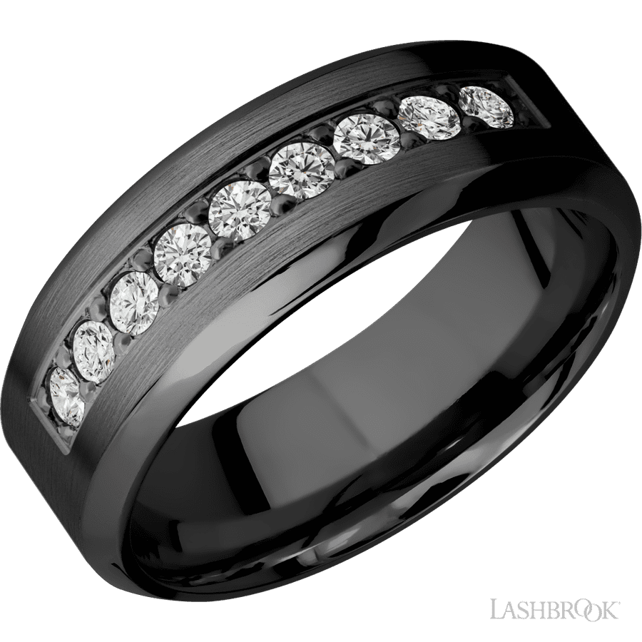Z8HBDIA9X.05BEAD 8 mm wide/High Bevel/Zirconium band with an arrangement of 9, .05 carat Round Diamond stones in a Bead setting.