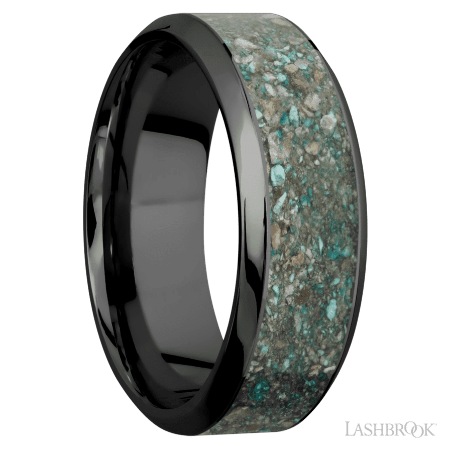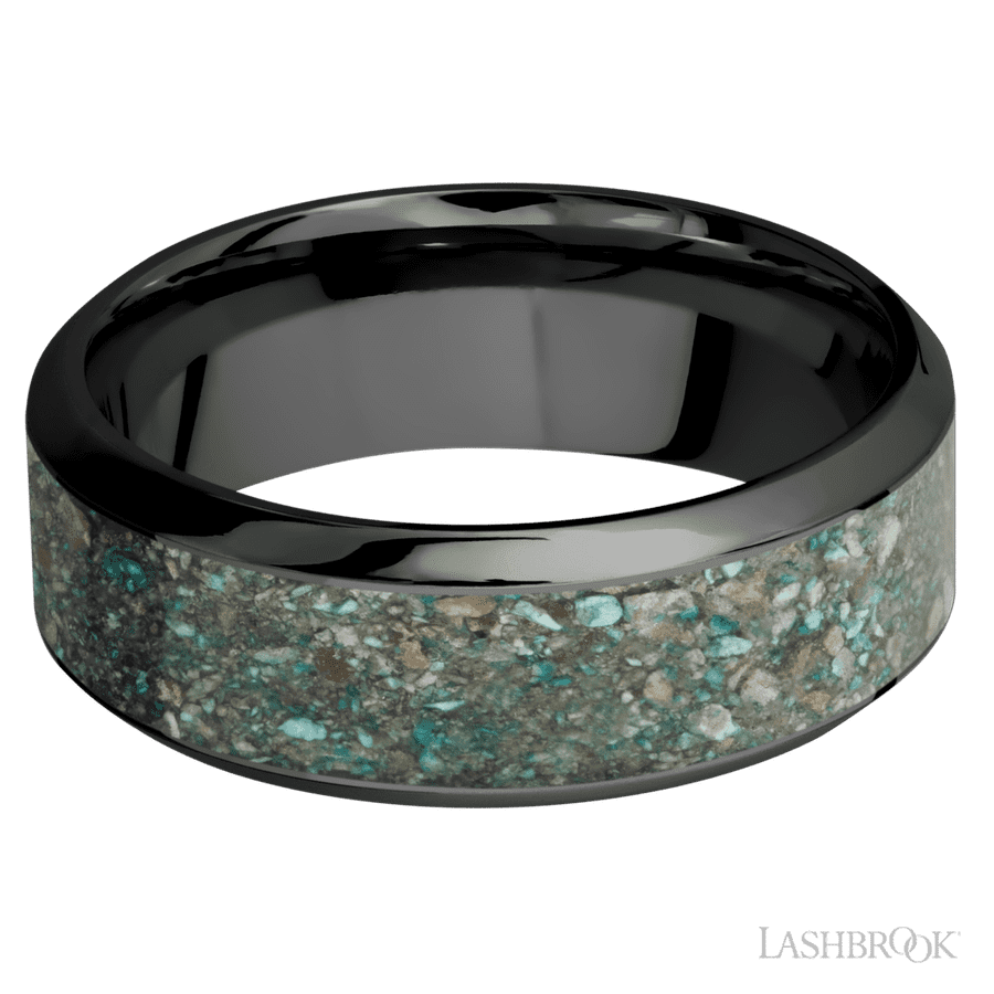 8 mm wide/High Bevel/Zirconium band with one 5 mm Centered inlay of Ocean Jasper.