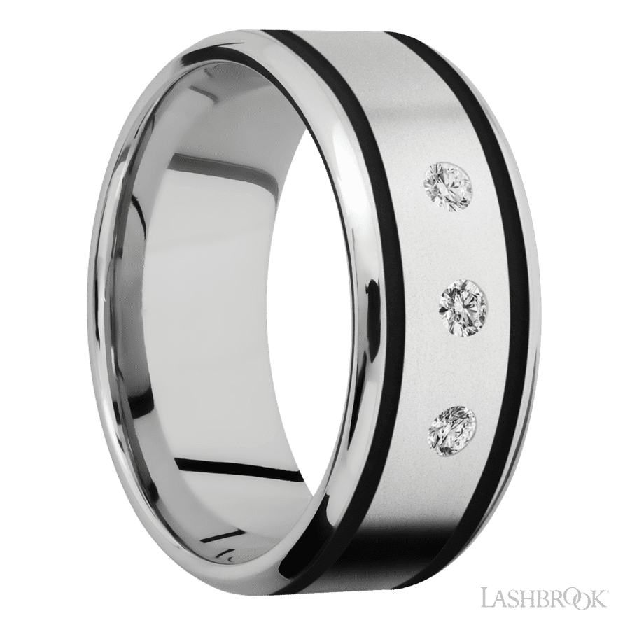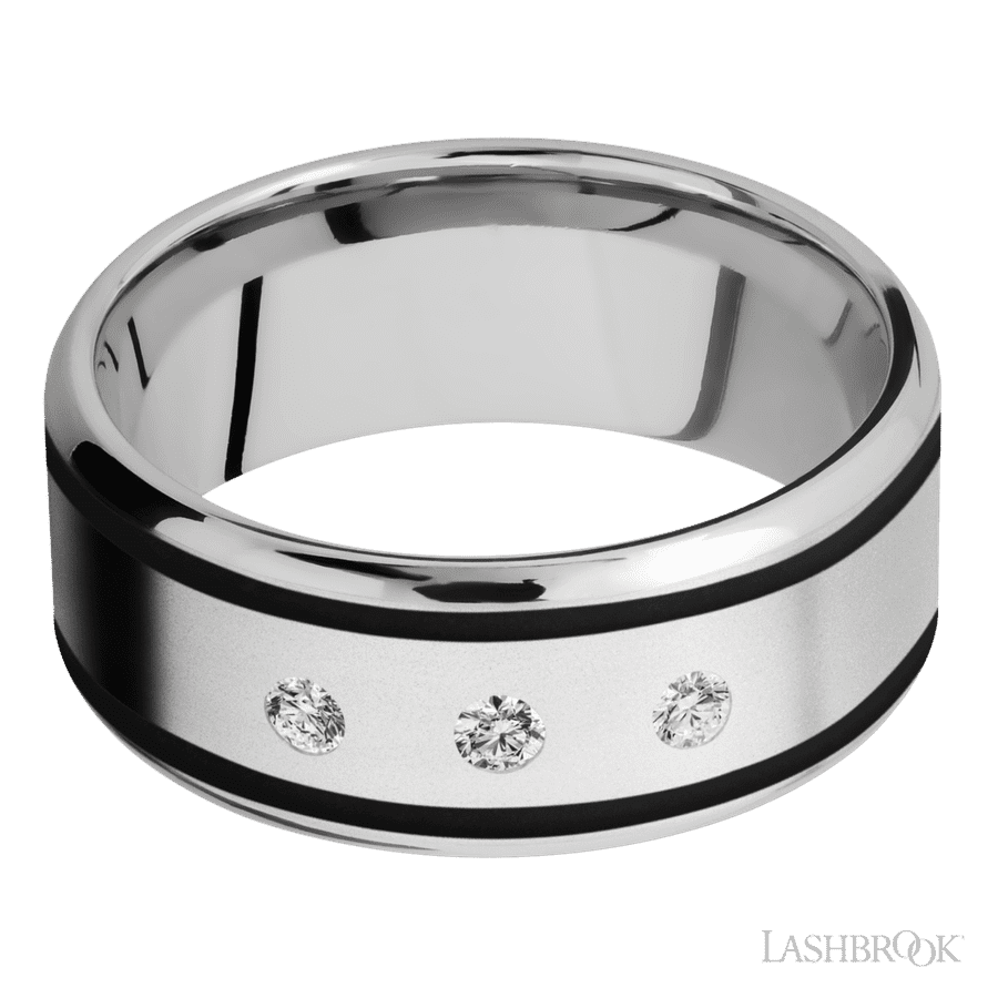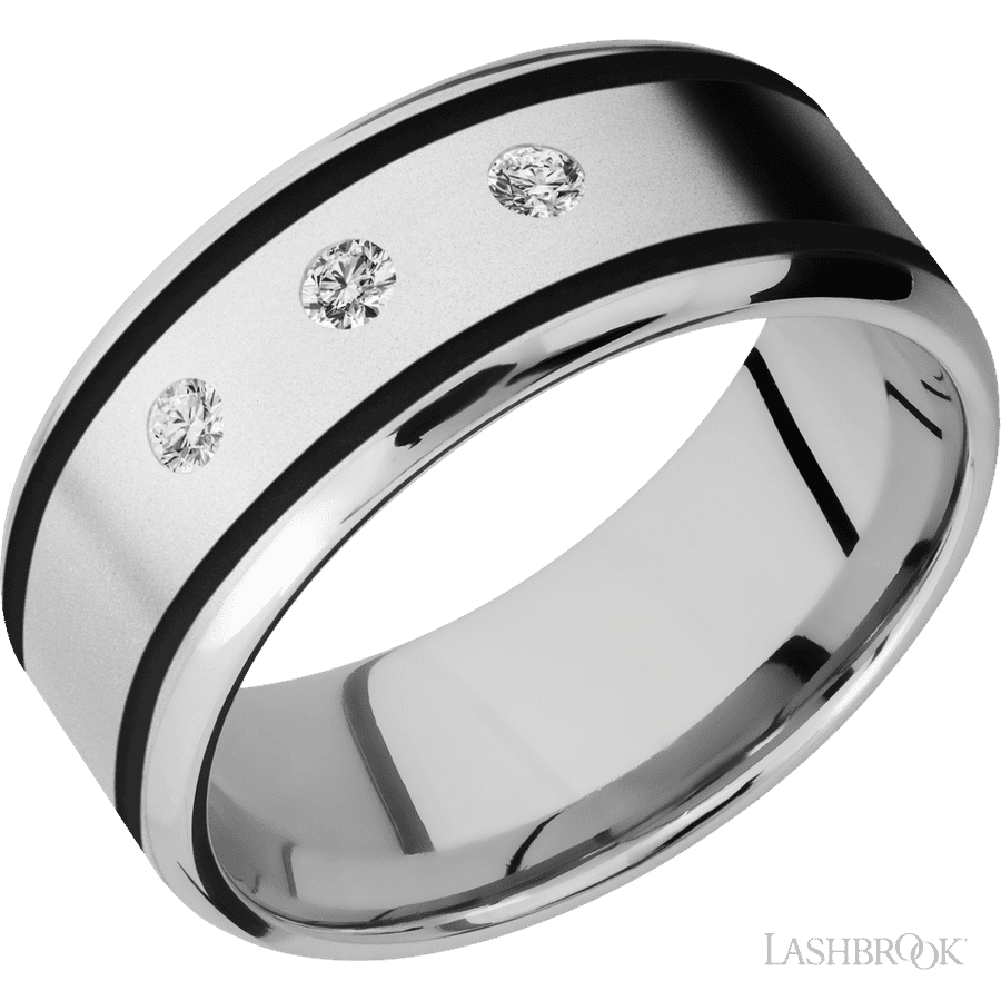 9 mm wide/Beveled/Cobalt Chrome band with two 1 mm Wide inlays of Black and featuring an arrangement of 3, .05 carat Round Diamond stones in a Flush setting