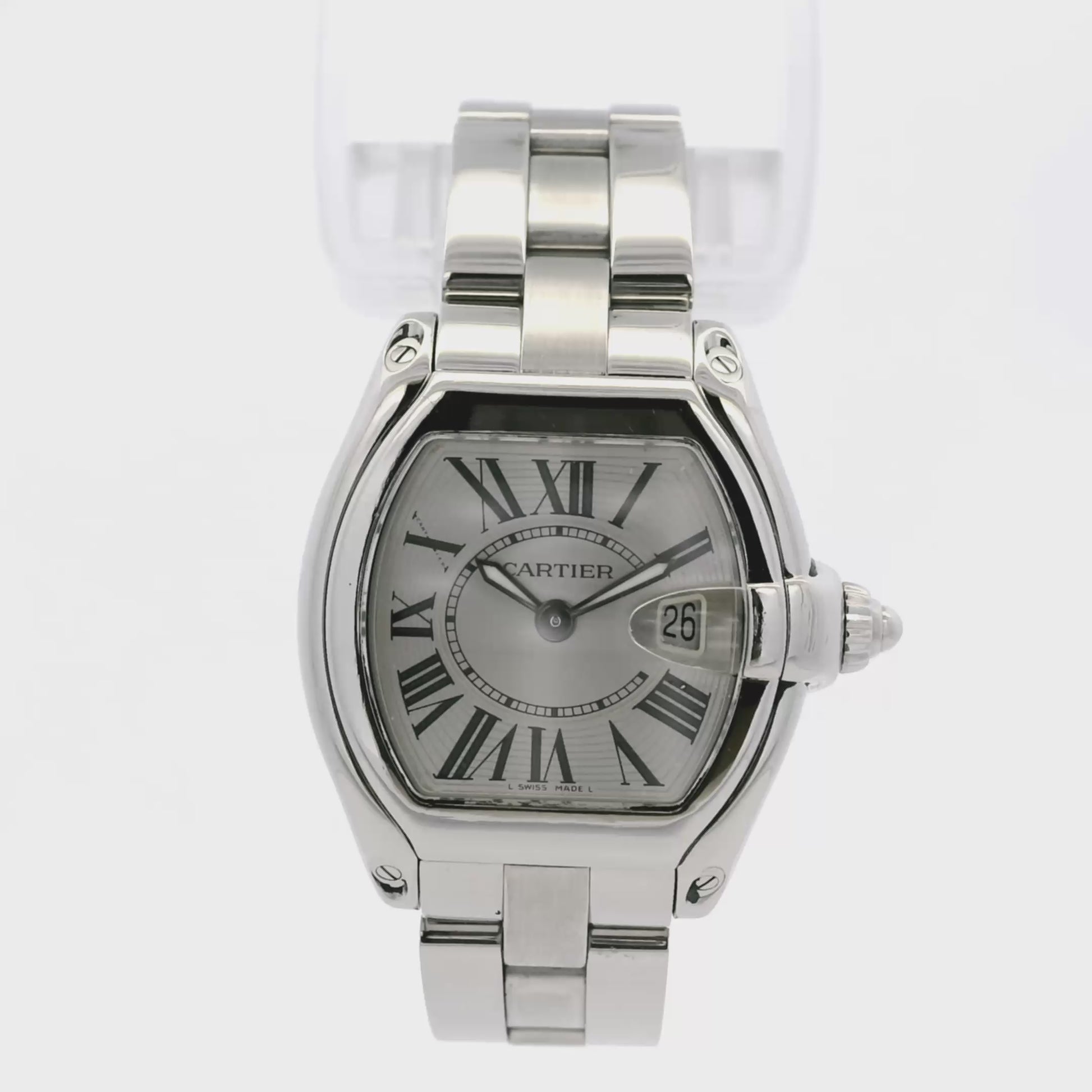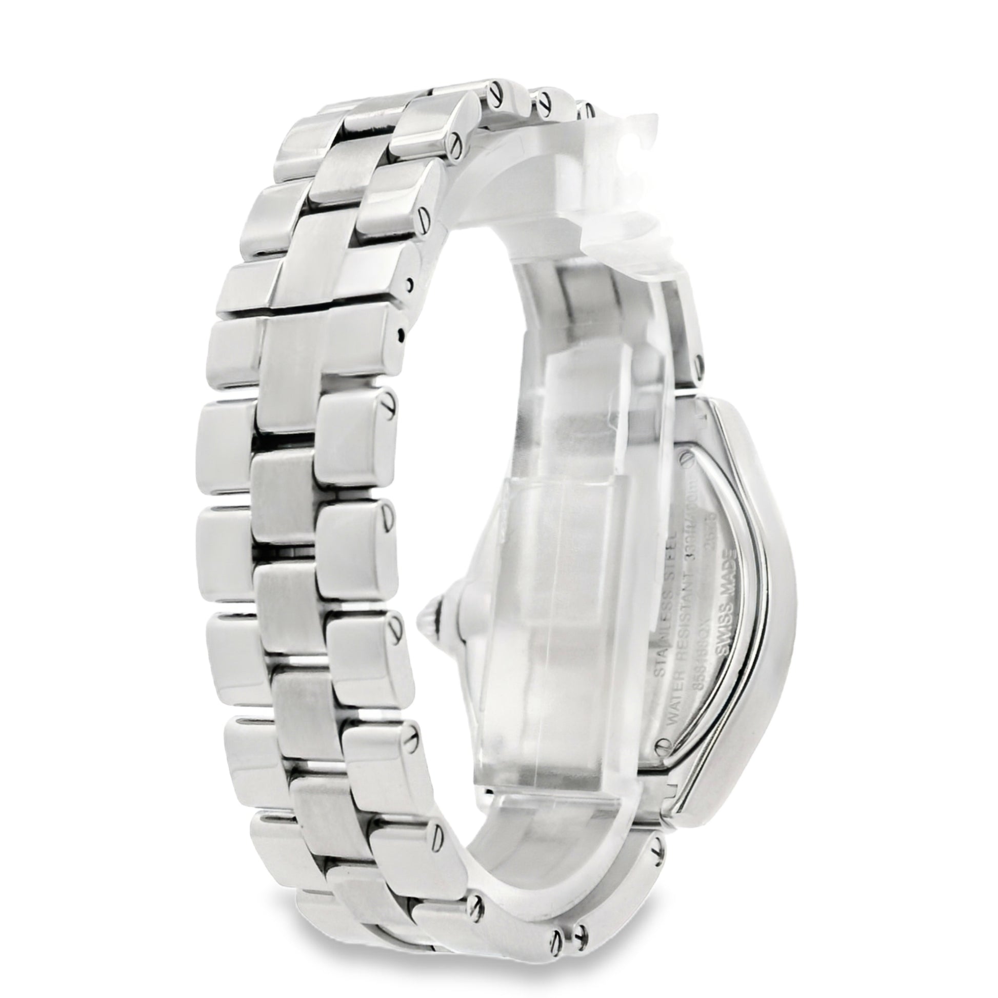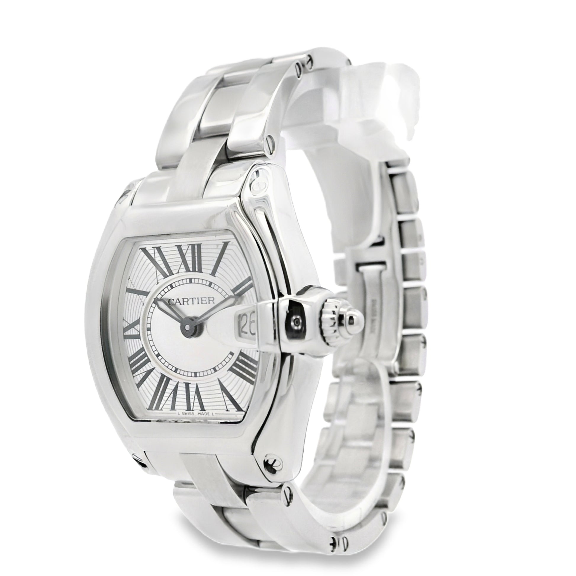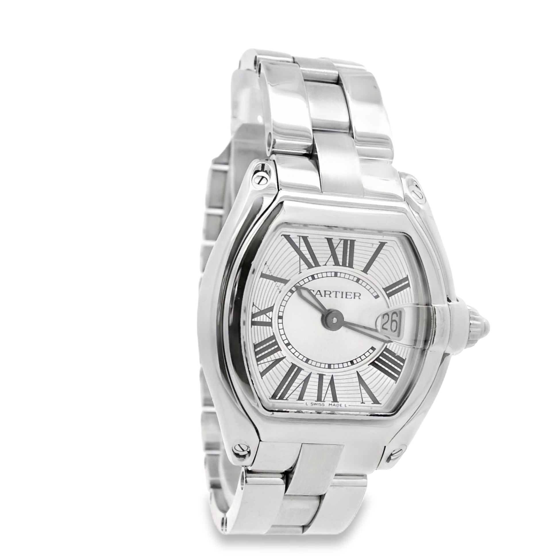 This elegant Cartier Roadster reference 2675 is a striking example of the Maison’s distinctive design and craftsmanship. Crafted in polished stainless steel, the 31mm by 37mm case features a smooth bezel that frames a silver dial with black Roman numerals and luminous hands, offering both readability and classic Cartier style. The Roadster’s signature tonneau-inspired shape and refined detailing make it a timeless and versatile luxury timepiece.