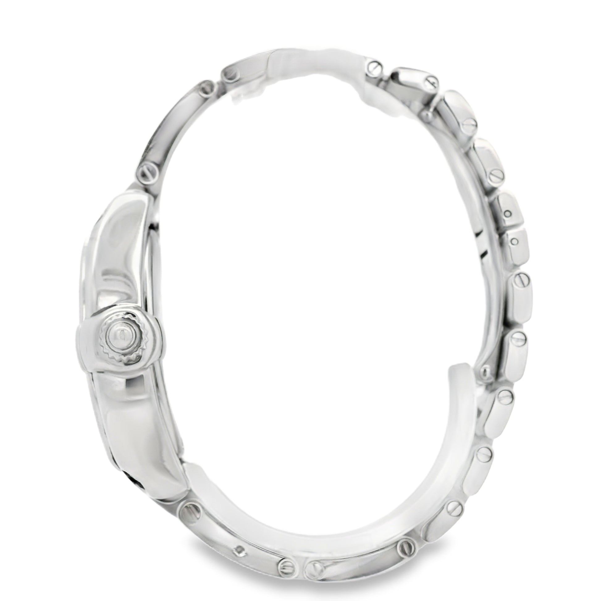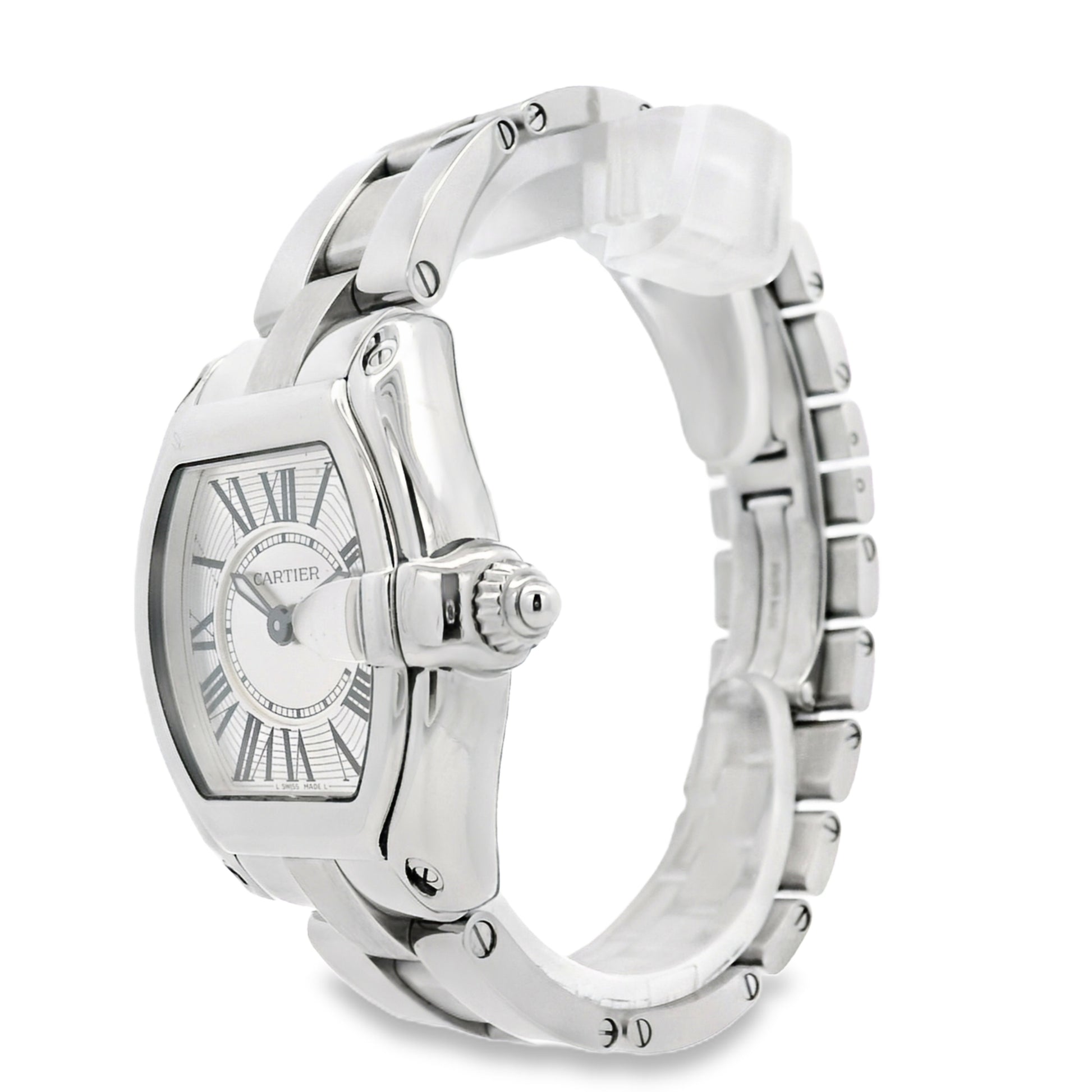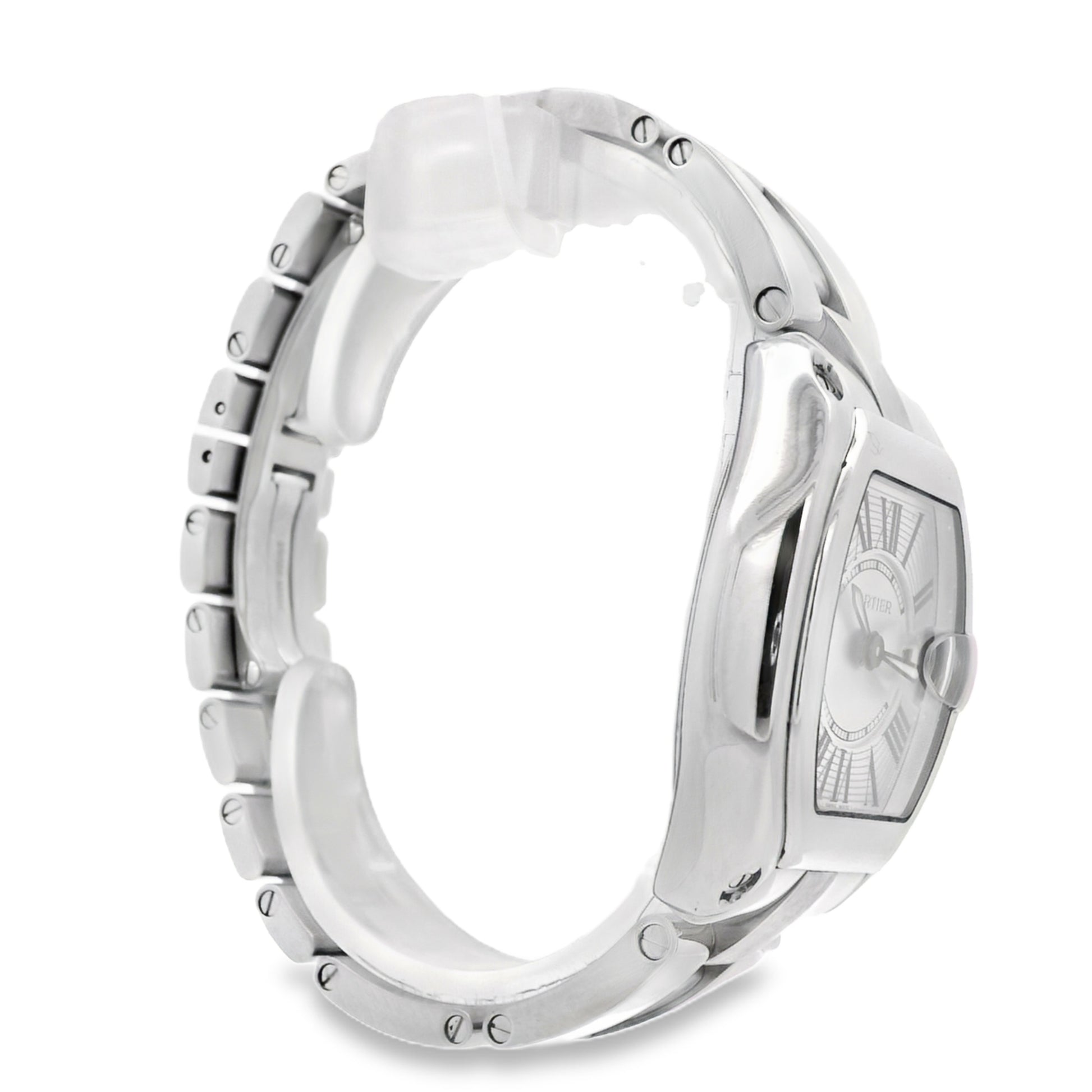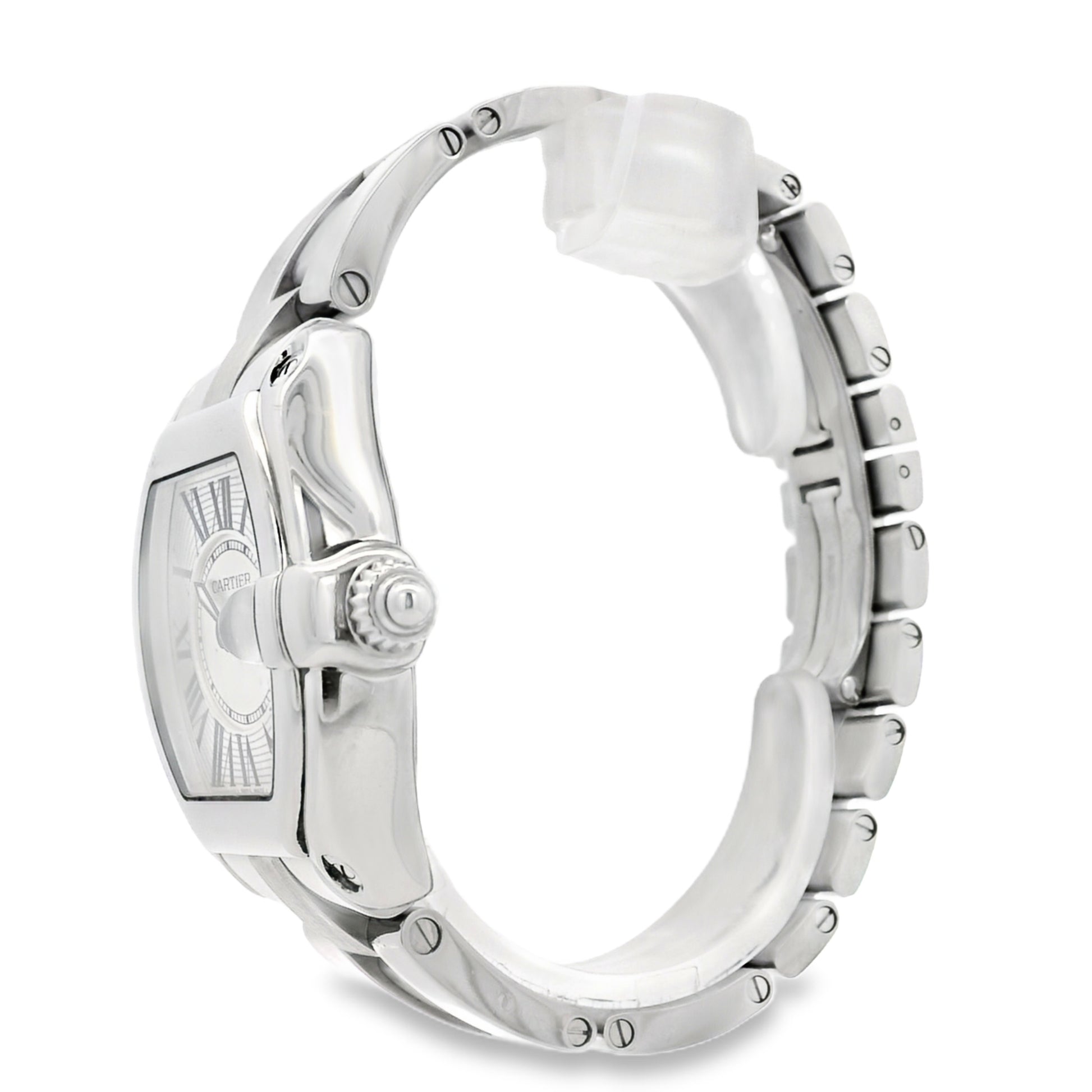 This elegant Cartier Roadster reference 2675 is a striking example of the Maison’s distinctive design and craftsmanship. Crafted in polished stainless steel, the 31mm by 37mm case features a smooth bezel that frames a silver dial with black Roman numerals and luminous hands, offering both readability and classic Cartier style. The Roadster’s signature tonneau-inspired shape and refined detailing make it a timeless and versatile luxury timepiece.