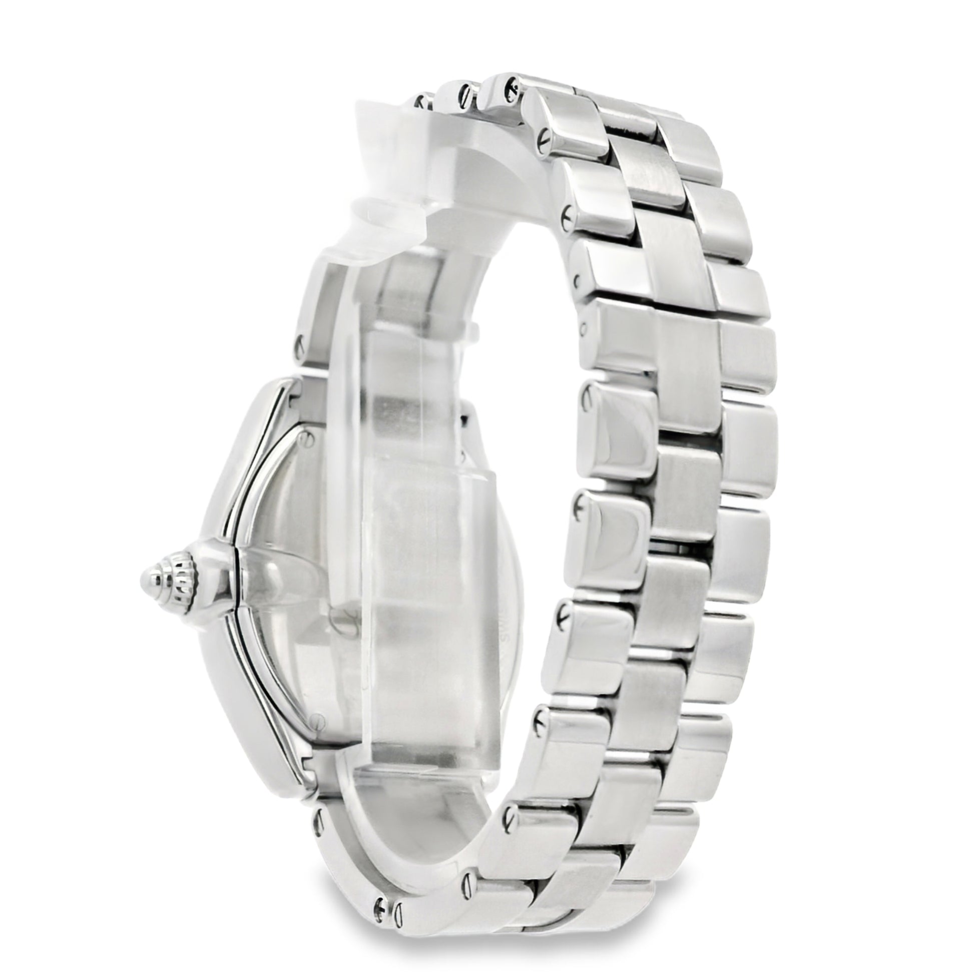 The watch is fitted with a stainless steel link bracelet that accommodates up to a 5 inch wrist and secures with a double fold-over clasp. Powered by a reliable automatic movement and protected by a sapphire crystal, this Cartier Roadster is in excellent condition and ready to ship. It comes complete with the original Cartier box and papers, making it an ideal piece for collectors or as a distinguished gift.