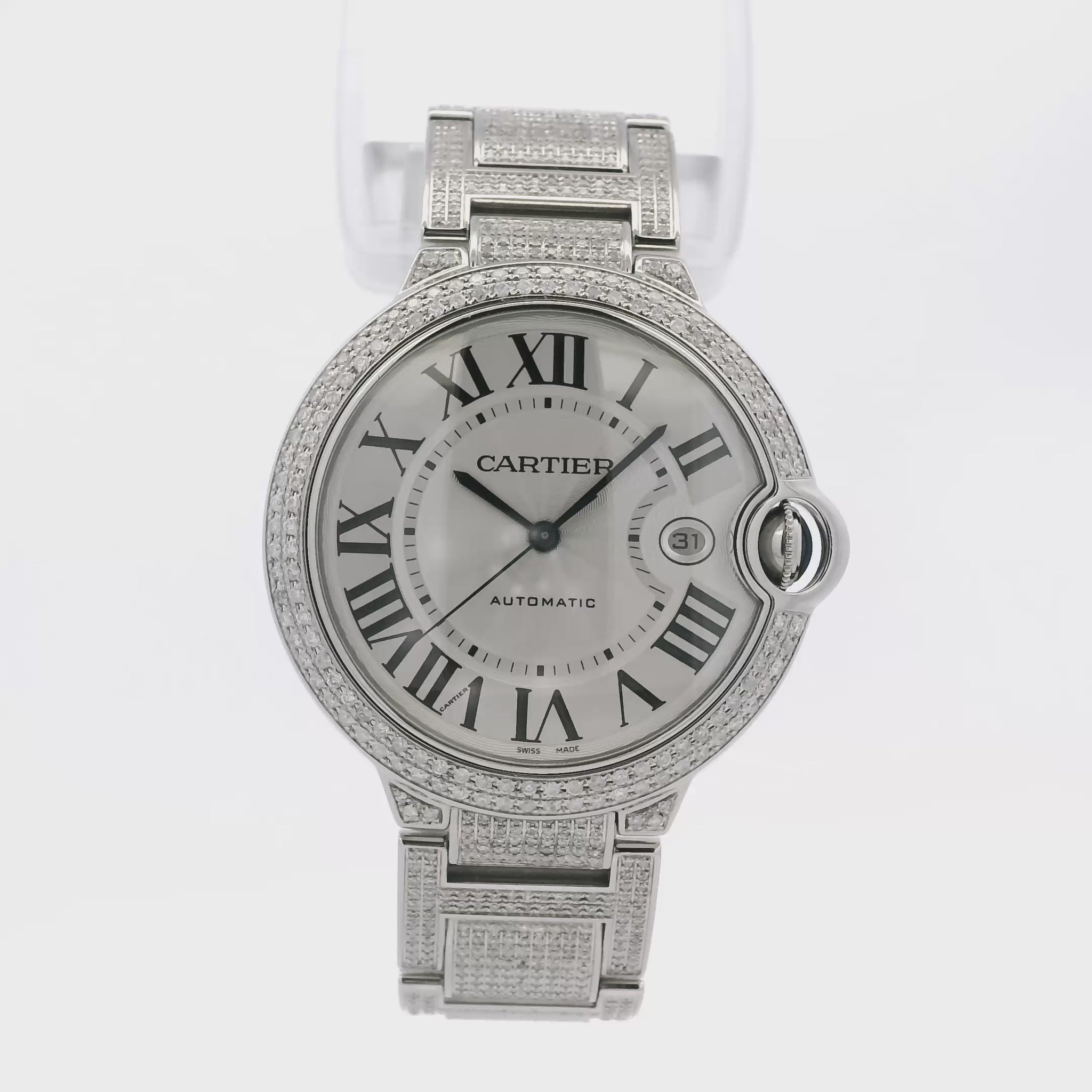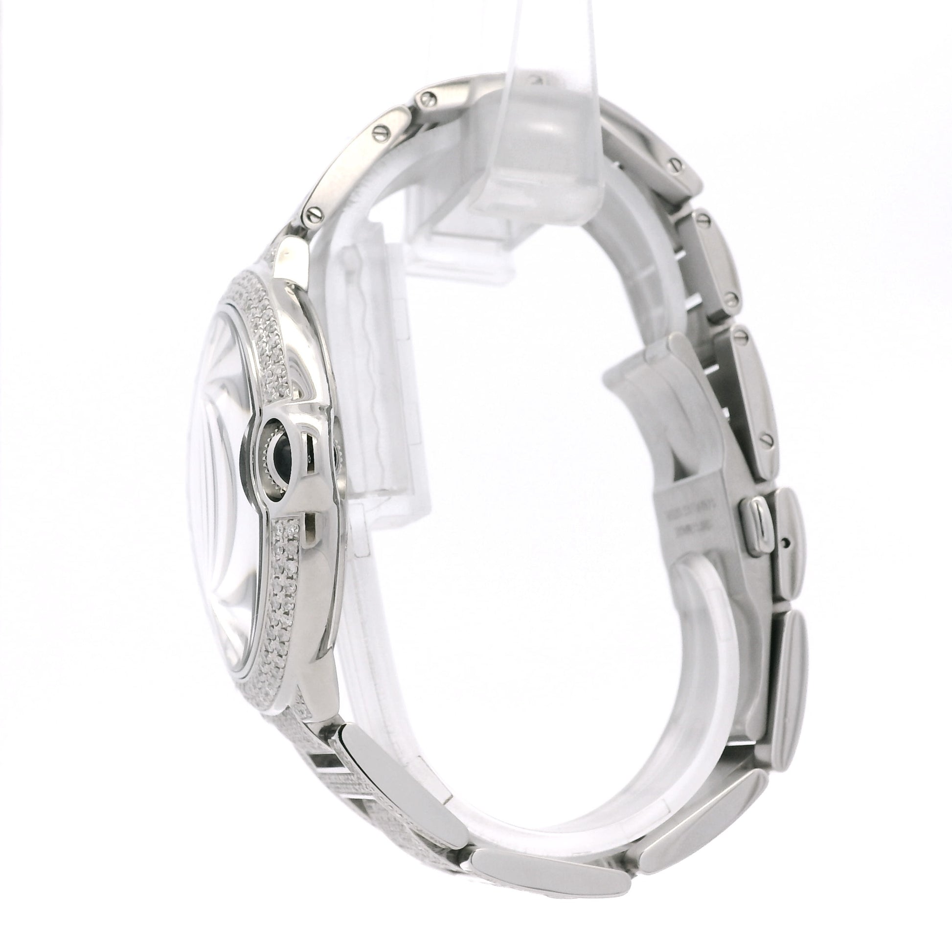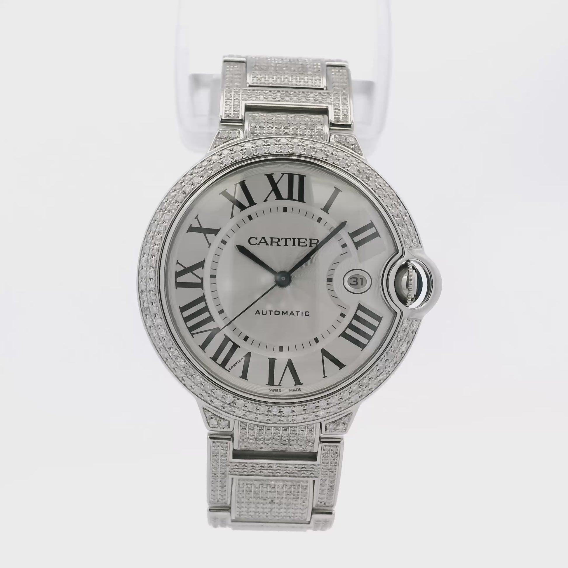 The watch showcases a classic silver Roman numeral dial, complete with Cartier’s signature blued steel hands and elegant layout, all protected by a durable sapphire crystal. Enhancing its luxury appeal, this timepiece is fitted with an aftermarket diamond bezel, adding exceptional brilliance while maintaining the Ballon Bleu’s sophisticated profile.