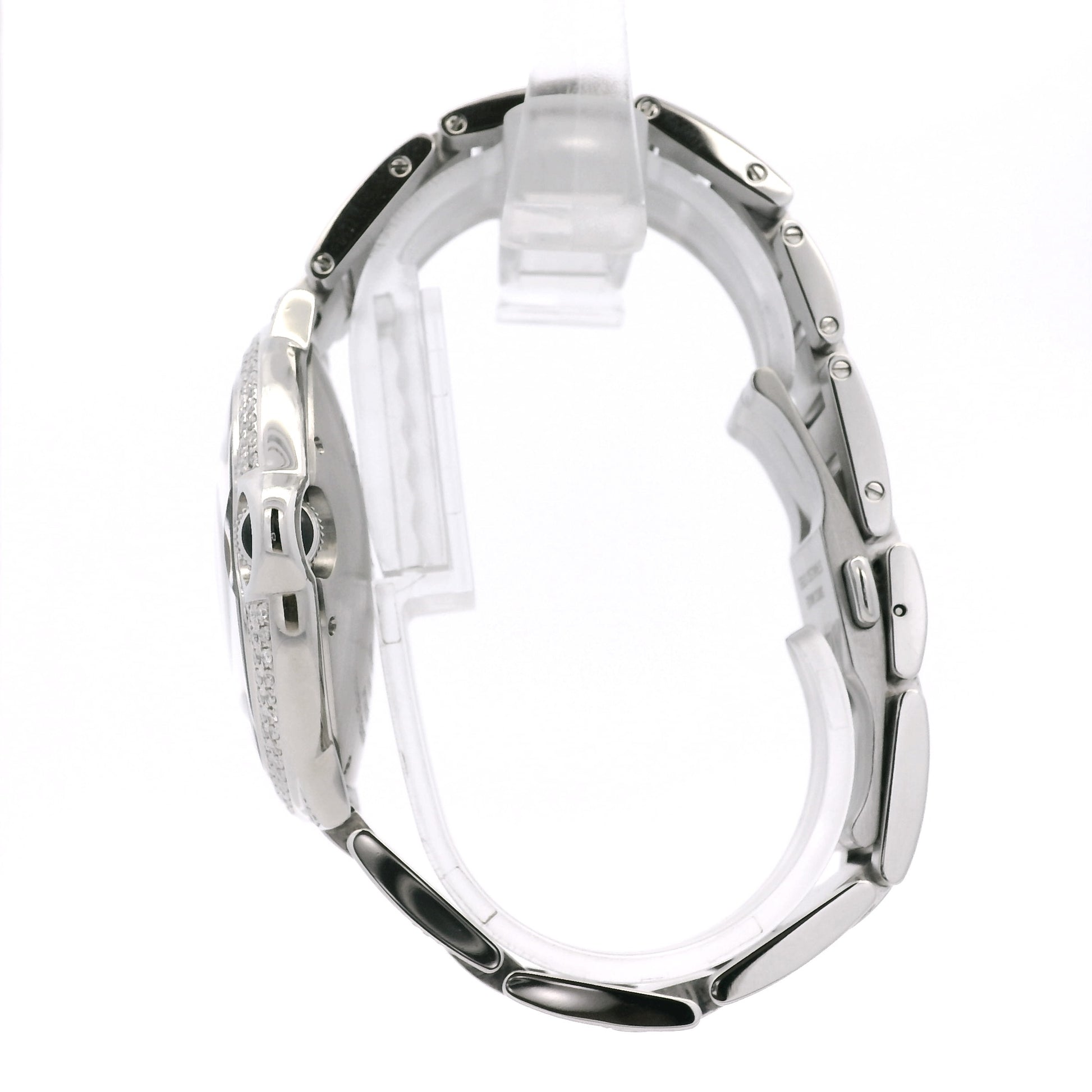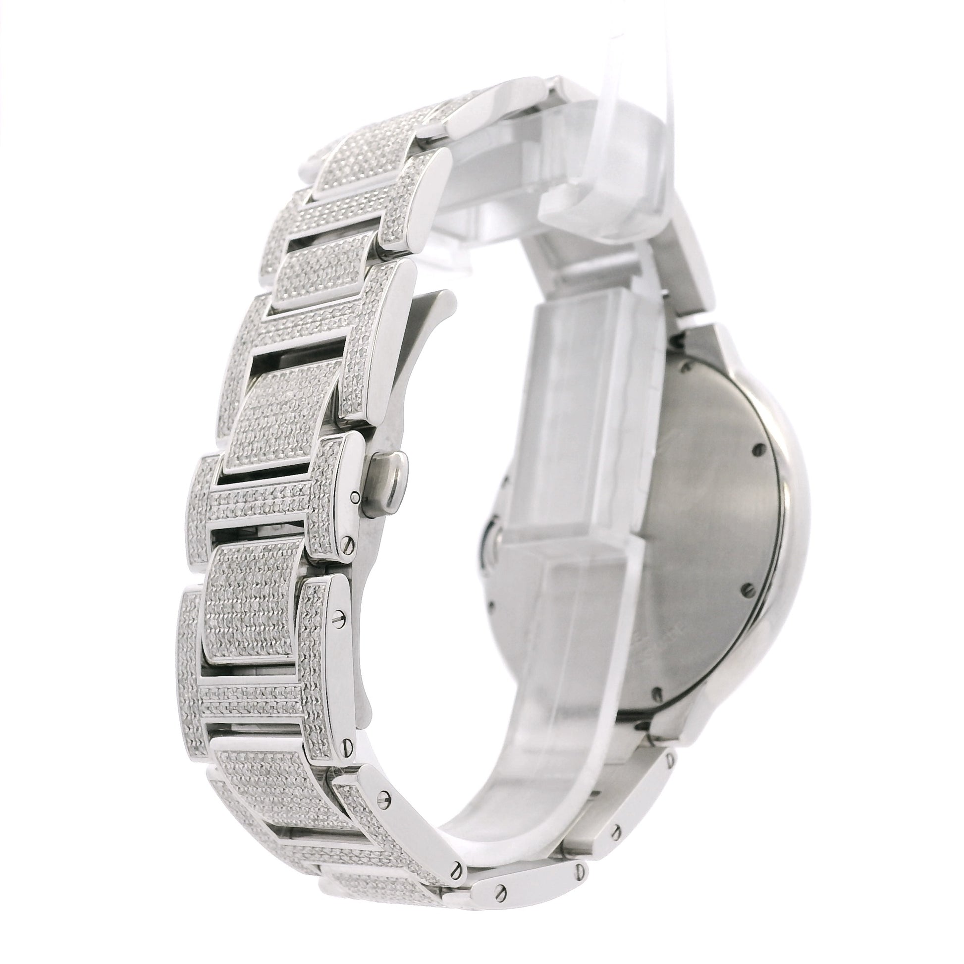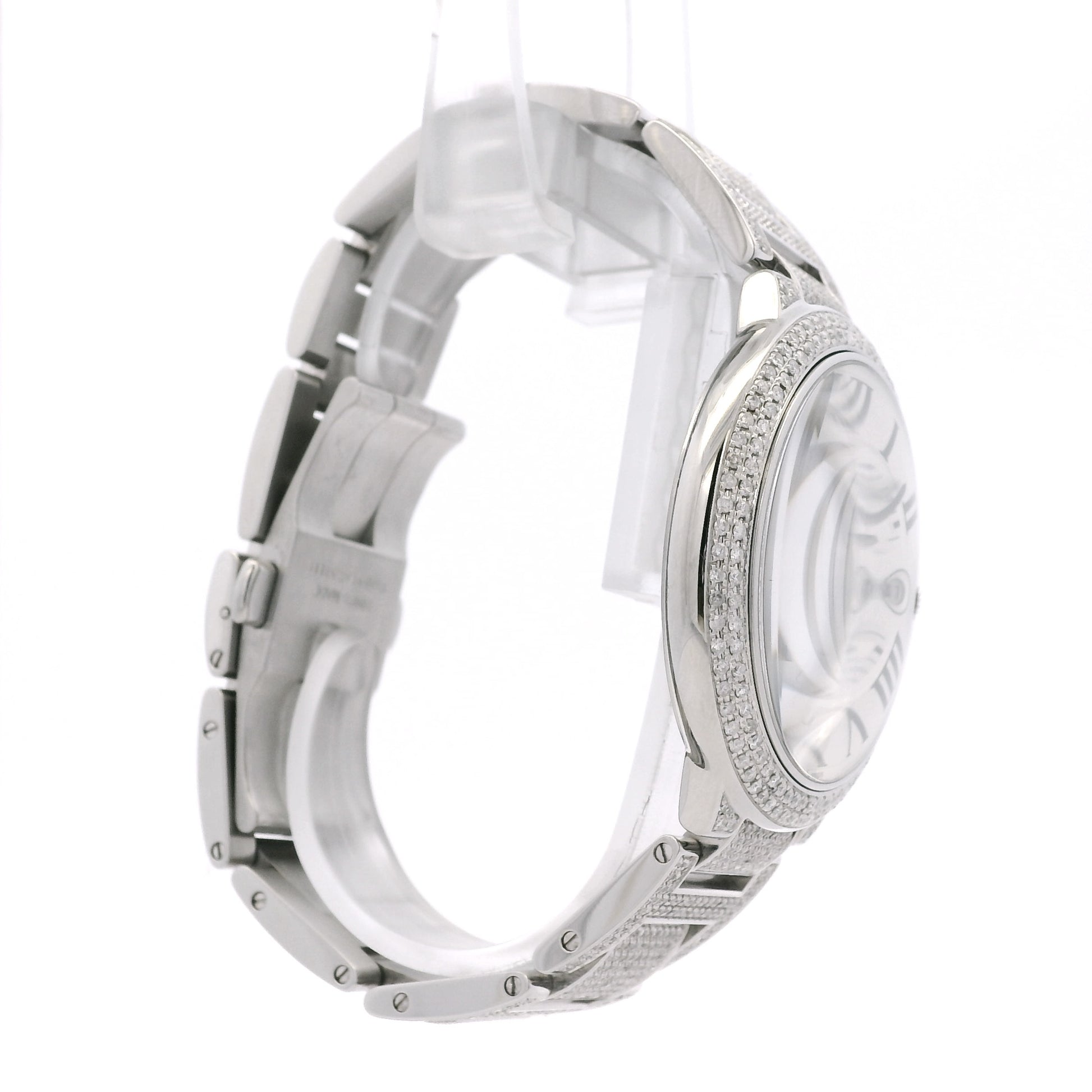 The watch showcases a classic silver Roman numeral dial, complete with Cartier’s signature blued steel hands and elegant layout, all protected by a durable sapphire crystal. Enhancing its luxury appeal, this timepiece is fitted with an aftermarket diamond bezel, adding exceptional brilliance while maintaining the Ballon Bleu’s sophisticated profile.