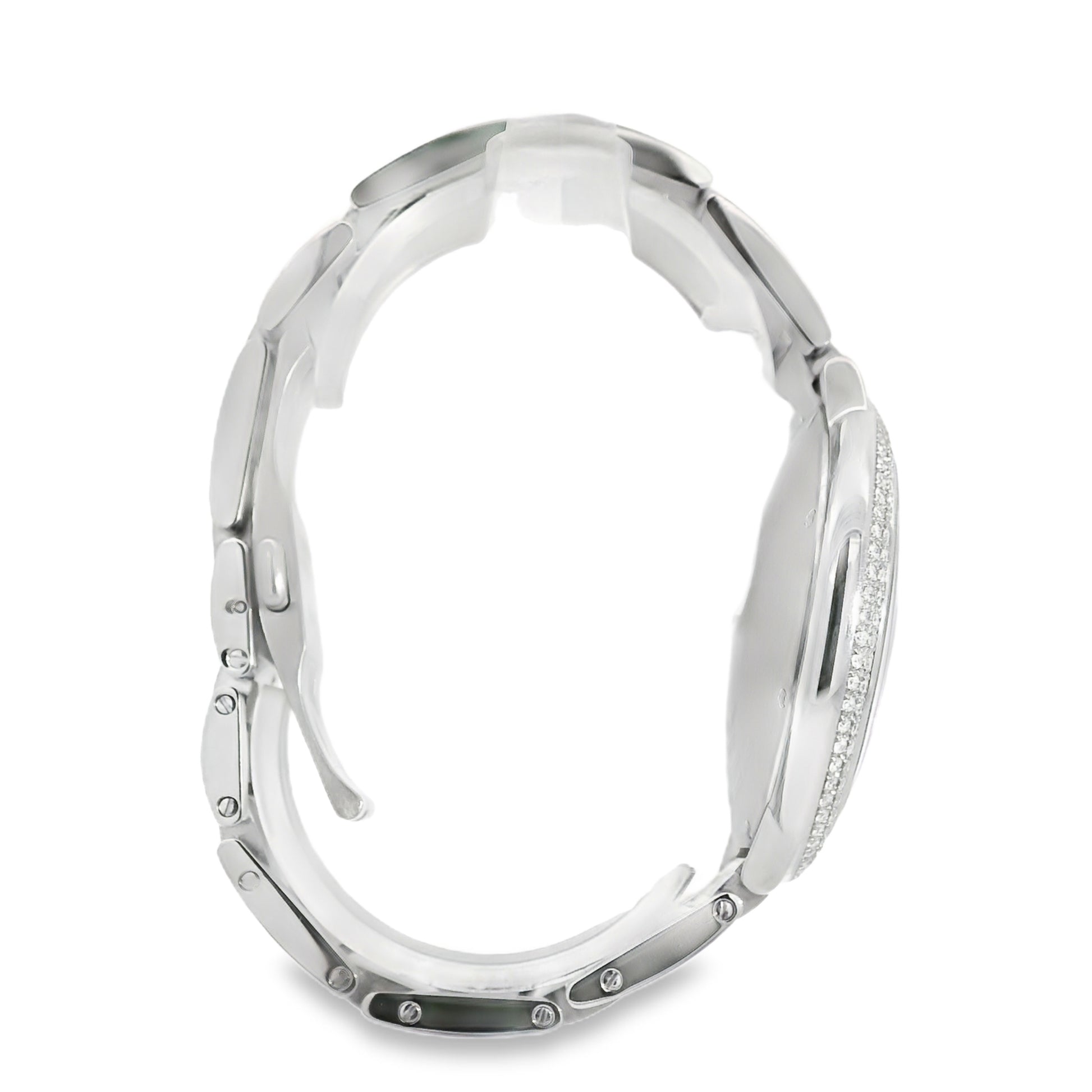 The Cartier Ballon Bleu 3001 in 42mm embodies timeless luxury and unmistakable elegance. This distinguished timepiece features Cartier’s signature rounded case, gracefully encircling a radiant diamond dial set with brilliant-cut stones that shimmer with every movement. The aftermarket diamond bezel enhances its bold presence, adding a refined touch of opulence without compromising the integrity of Cartier’s original design.