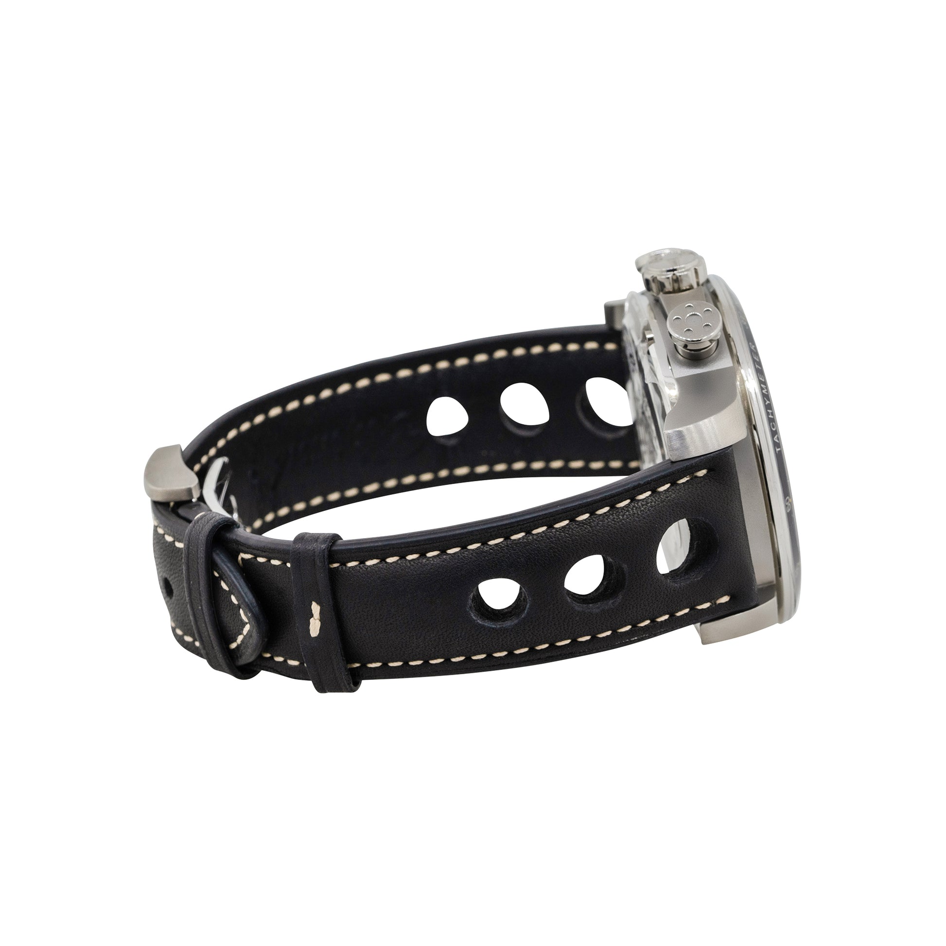 Powered by the COSC-certified Caliber 03.05-M automatic chronograph movement, this timepiece is a celebration of style and performance. A black leather strap with titanium folding clasp ensures comfort and durability, while the scratch-resistant sapphire crystal maintains flawless visibility.