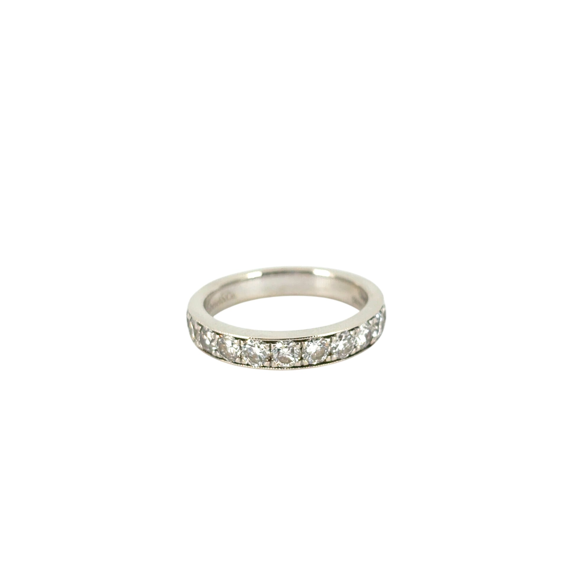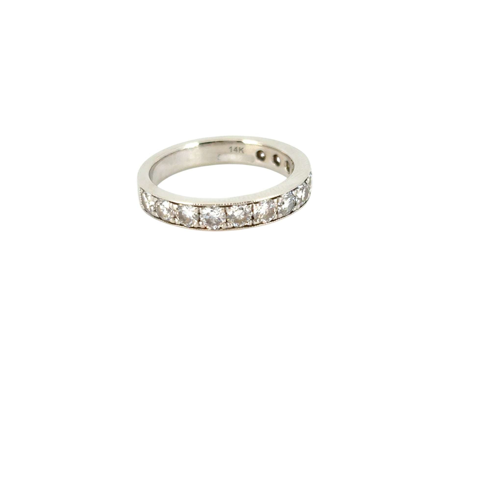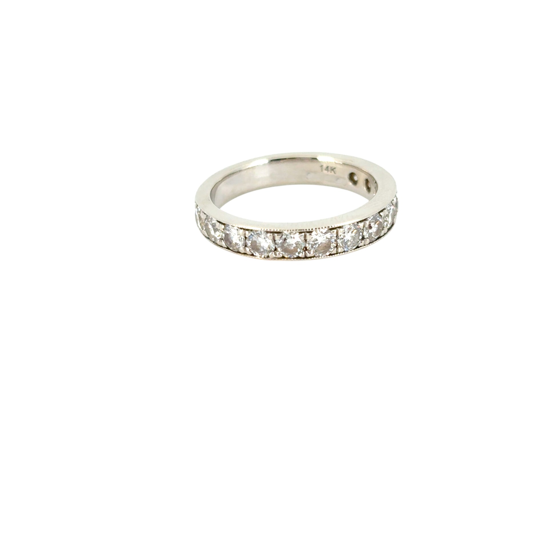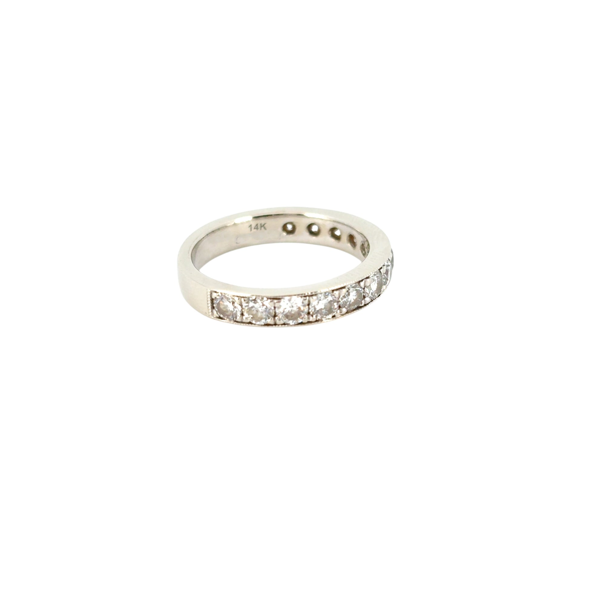 A delicate milgrain edge frames the diamonds, adding antique-inspired charm and intricate texture. The diamonds do not fully encircle the ring, allowing for comfortable resizing and a secure fit.