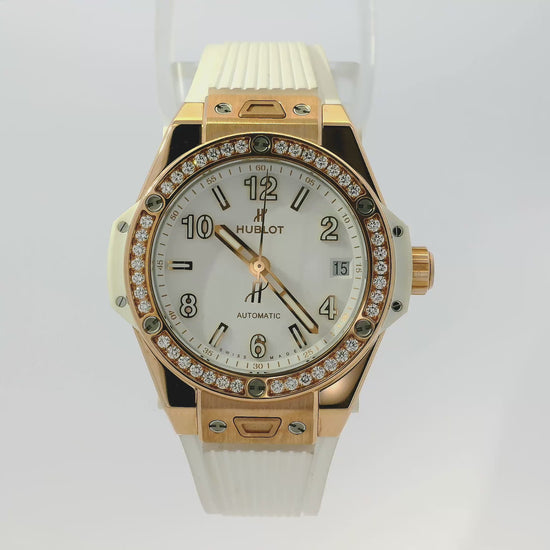 Experience the fusion of innovation and elegance with this Hublot Big Bang One Click 33mm crafted in 18k King Gold — Hublot’s proprietary gold alloy known for its rich, warm hue and superior durability. The white dial provides a refined contrast to the radiant factory diamond bezel, creating a look that is both bold and feminine.