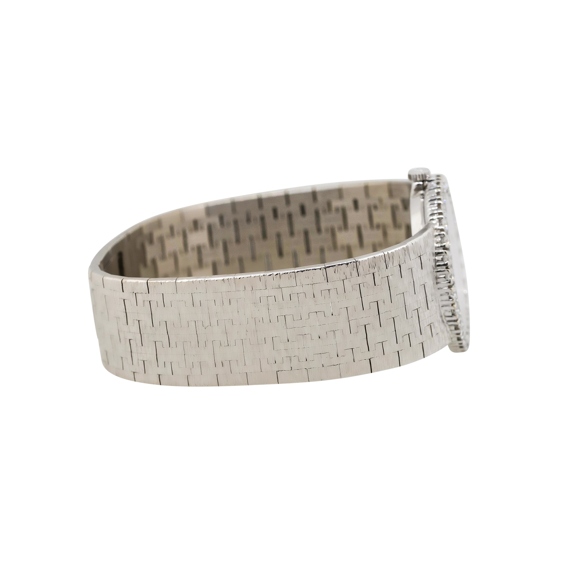 The matching 18k white gold bracelet is designed to comfortably fit a 5-inch wrist and is secured with a white gold clasp. Powered by a manual winding movement, this watch combines enduring elegance with traditional Swiss horology.