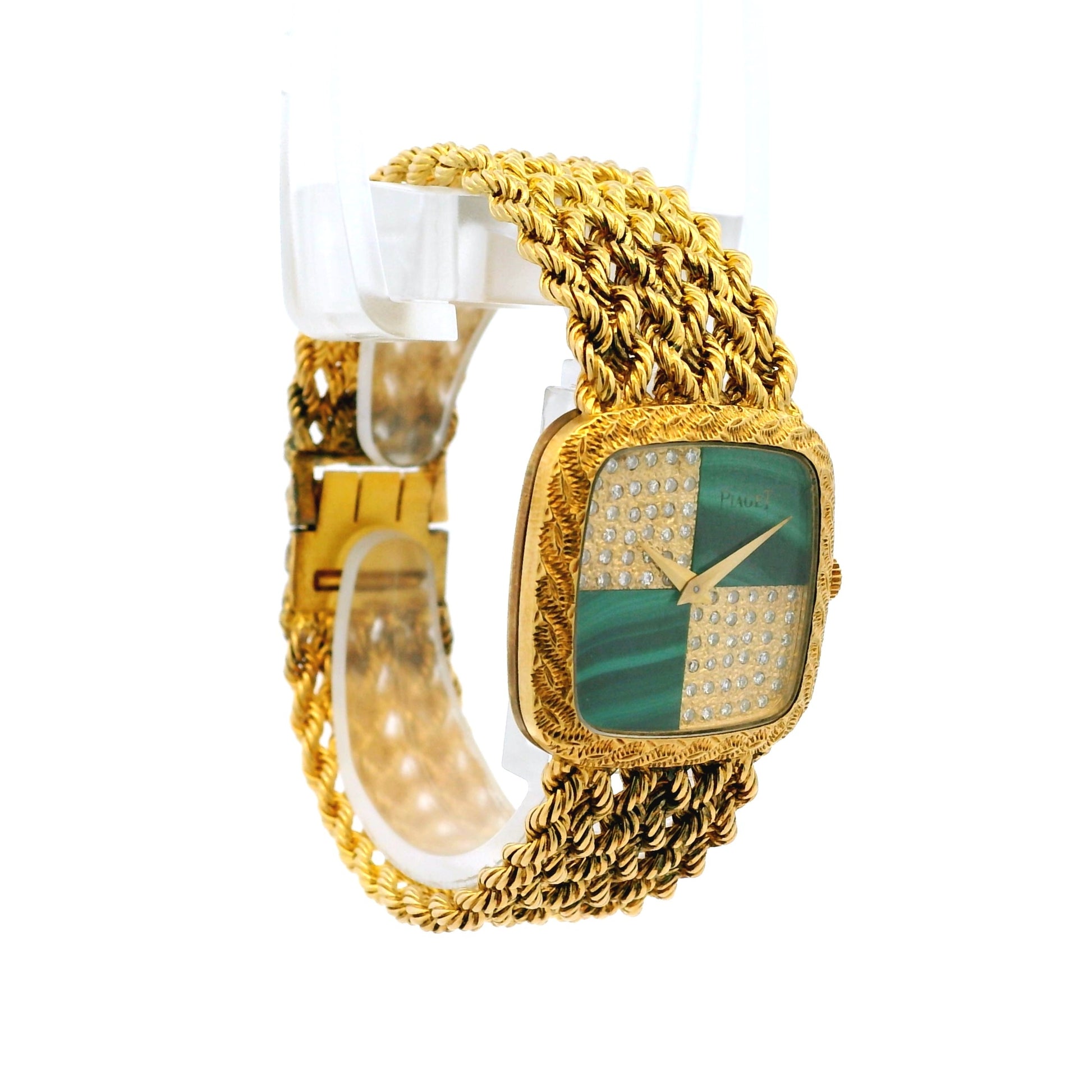 Crafted in luxurious 18k yellow gold, this elegant 23mm case features a stunning diamond-set bezel that frames one of Piaget’s most iconic design elements — a rich green malachite and diamond dial. The dial’s striking contrast between natural malachite stone and brilliant-cut diamonds creates a captivating checkerboard aesthetic that embodies the glamour of the 1970s high-jewelry era.