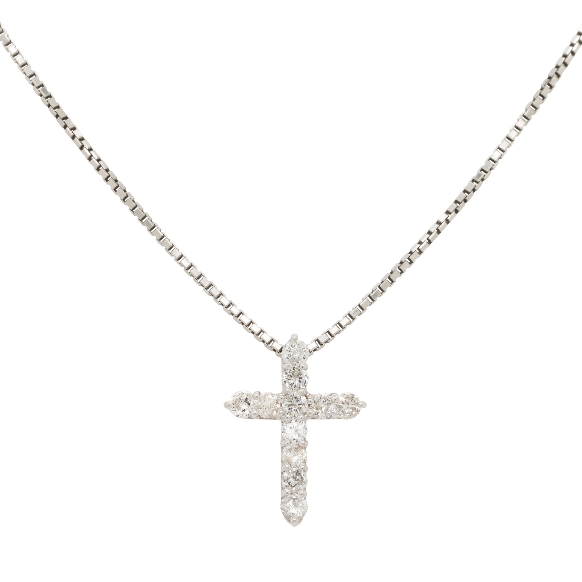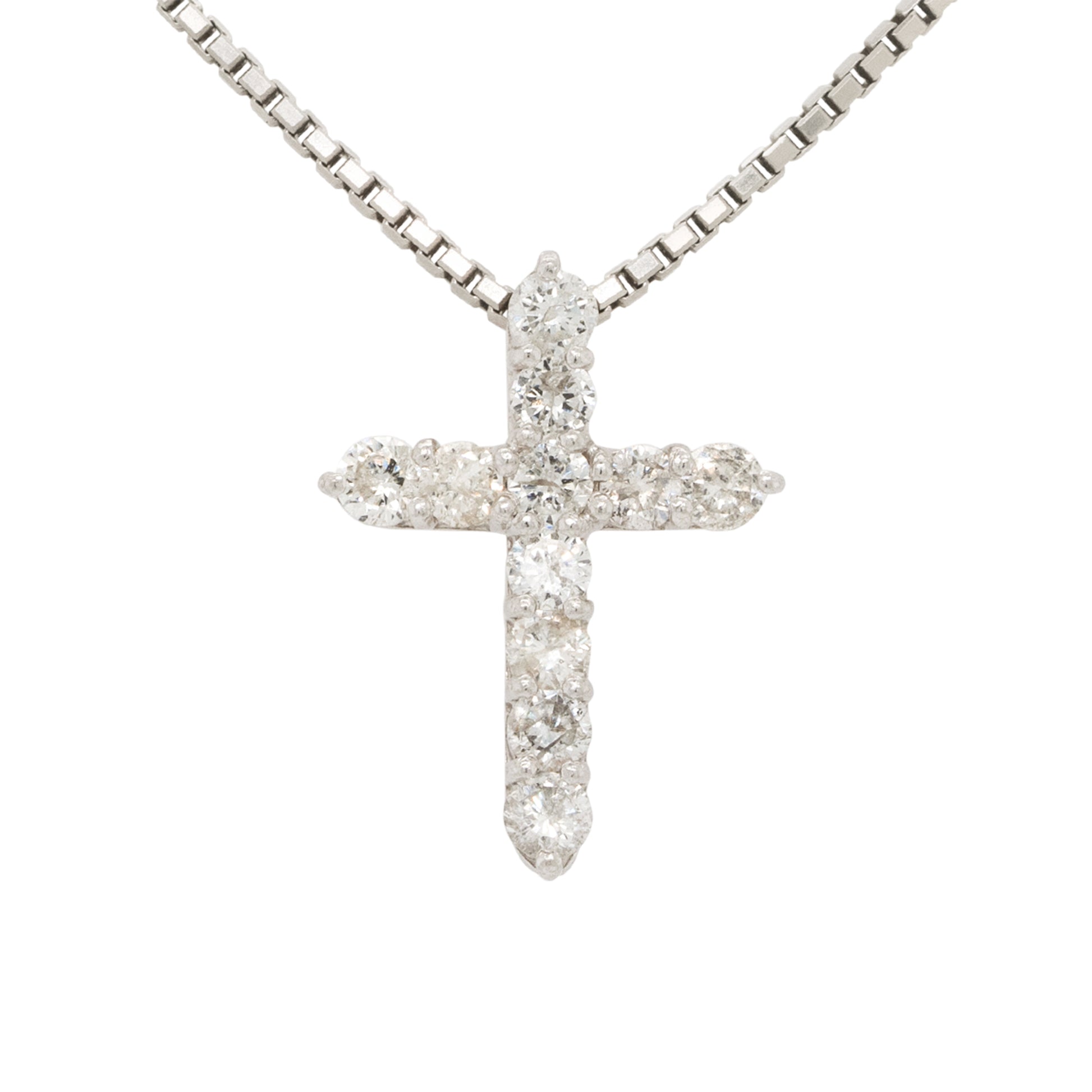 Set with 0.50 carats of brilliant round diamonds in G/H color and VS clarity, the petite cross pendant offers brilliant sparkle in a refined silhouette. Crafted in gleaming 18k white gold, this necklace measures 16 inches long—ideal for layering or wearing solo as a daily signature piece.