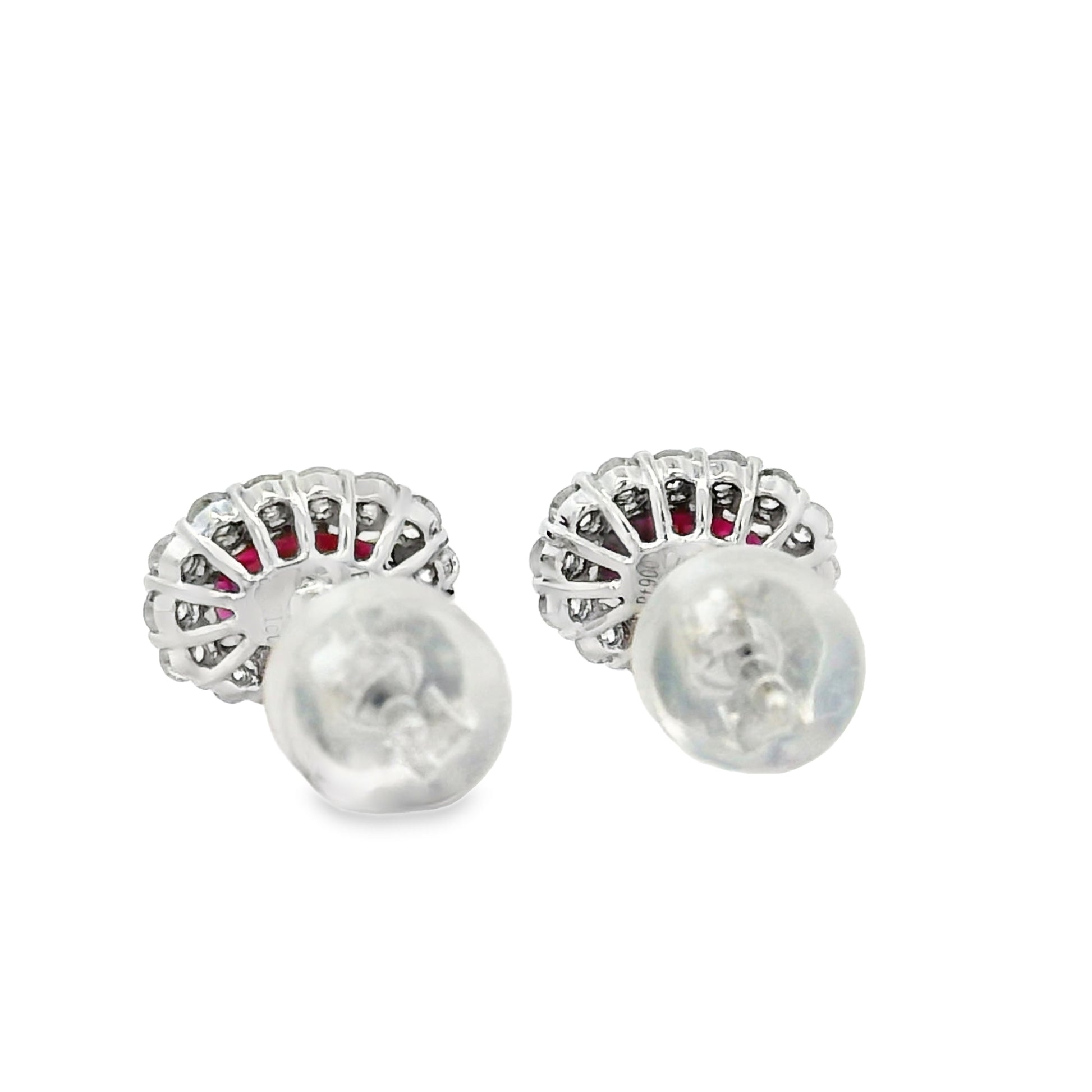 These refined platinum ruby and diamond earrings showcase classic elegance in a compact and sophisticated design. Set at the center are vivid ruby gemstones with a combined total weight of approximately 1.24 carats, displaying rich red color and beautiful natural brilliance.
