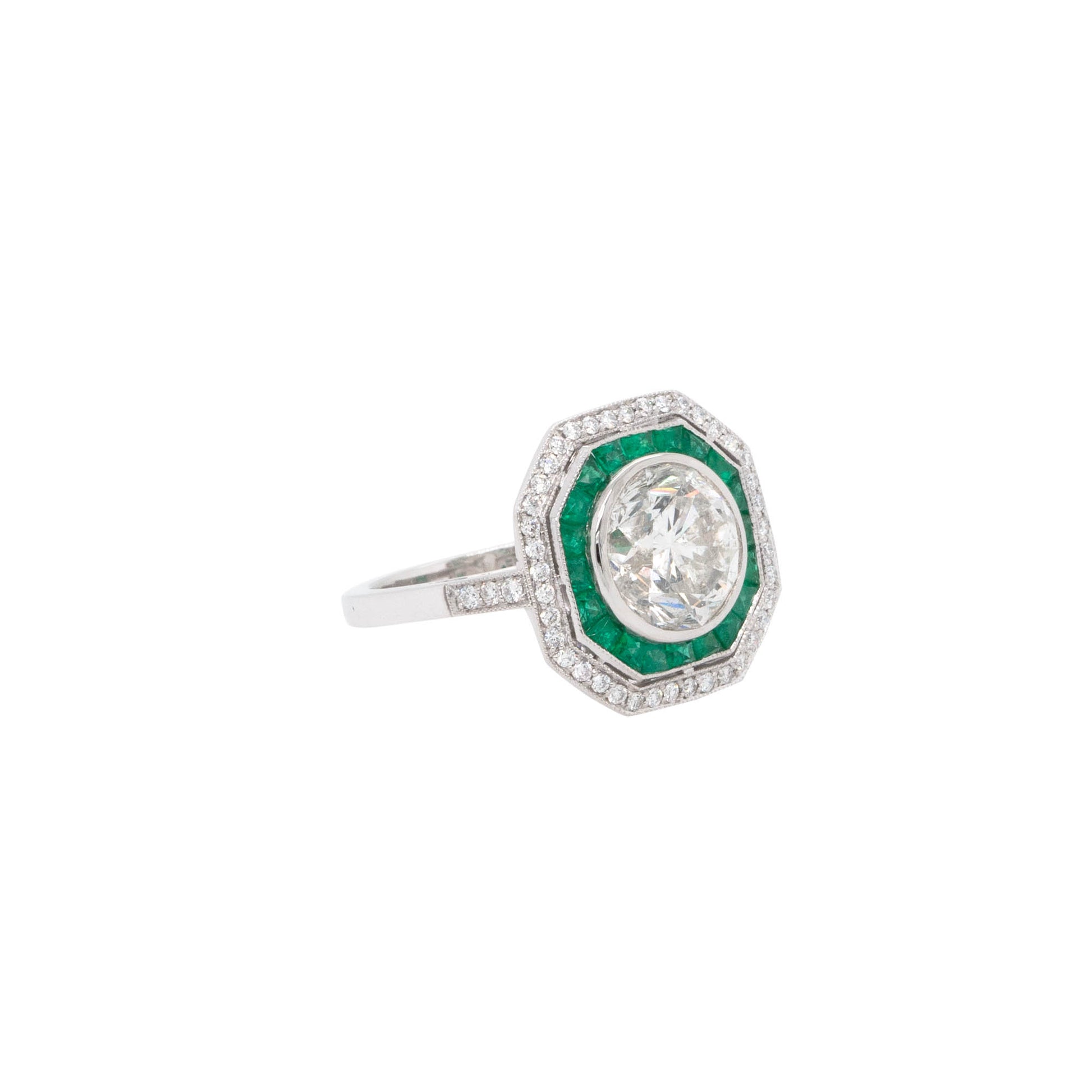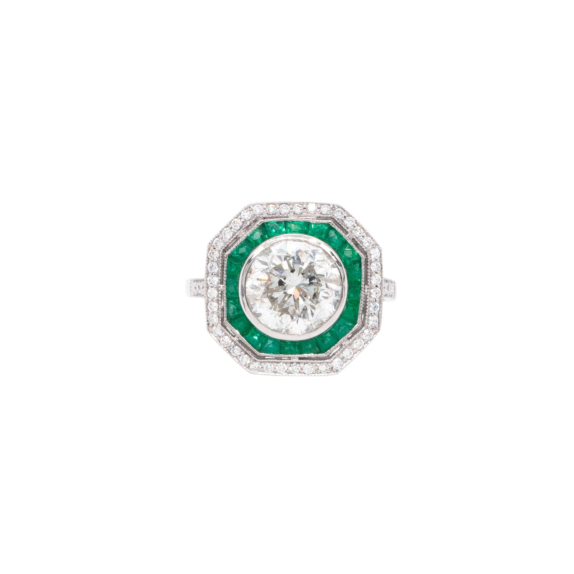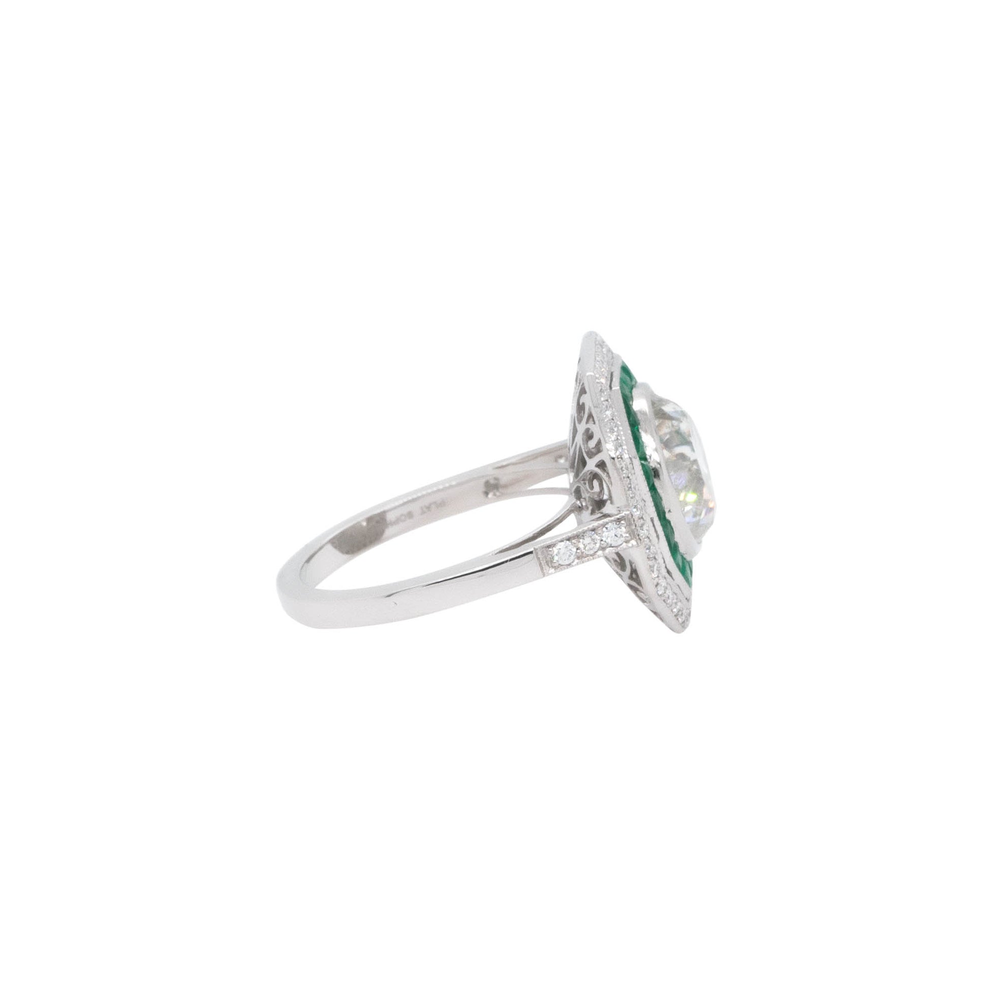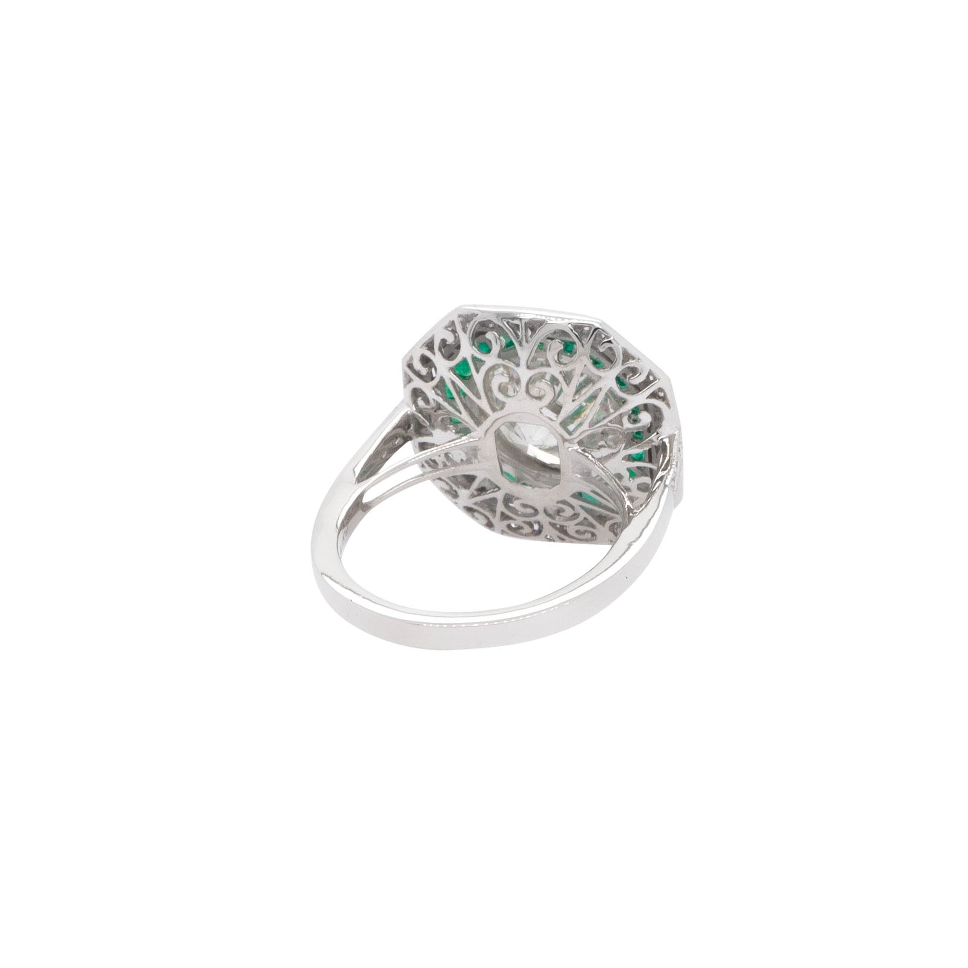 Platinum 3.66ct Natural Round Brilliant Diamond and Emerald Ring