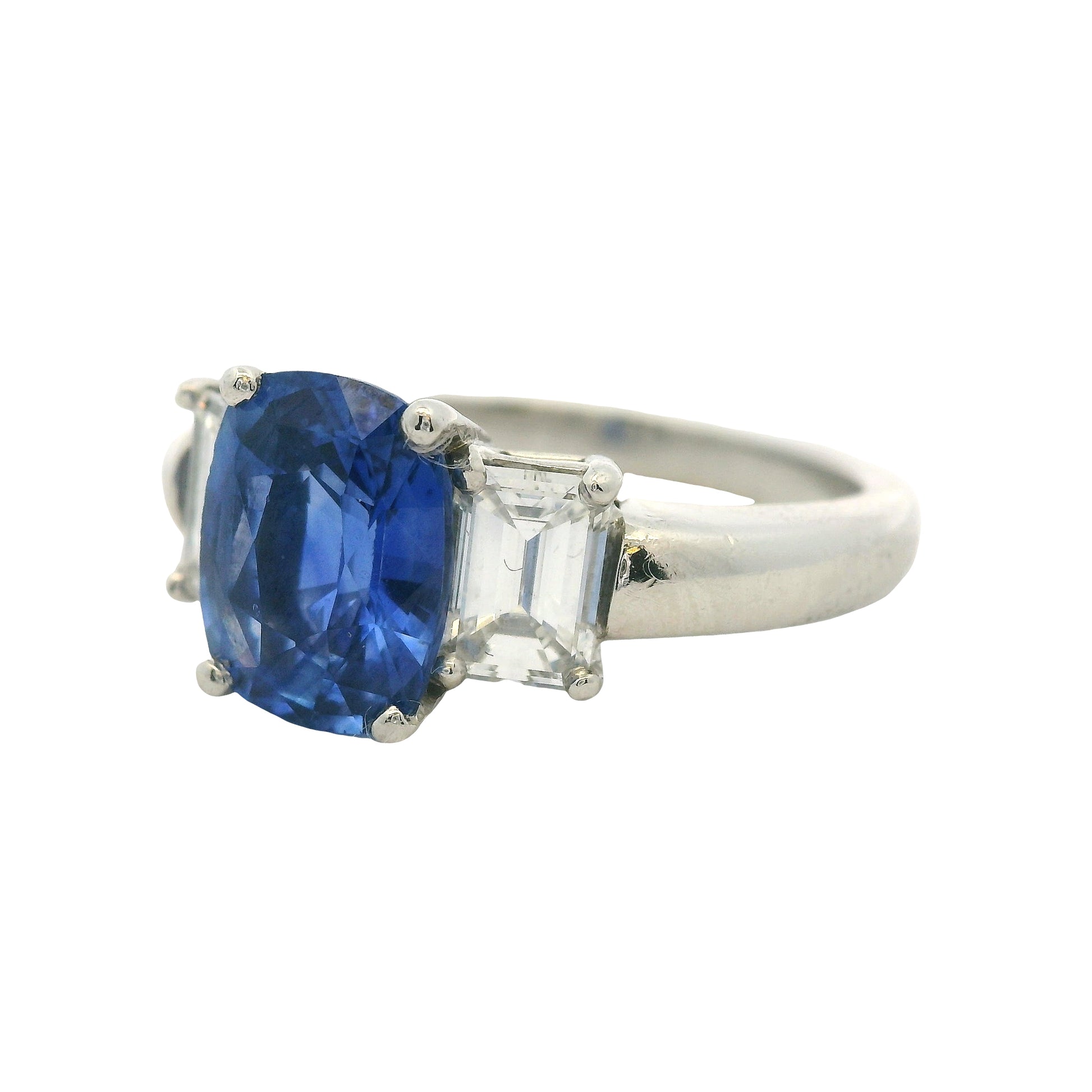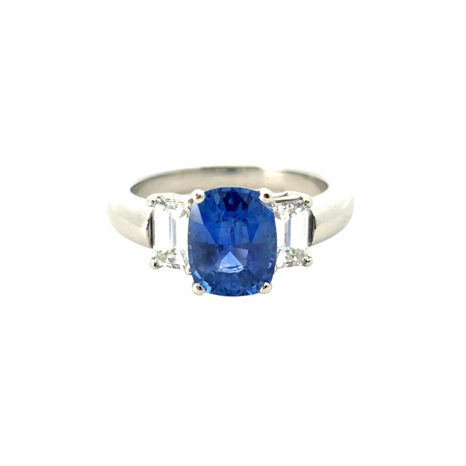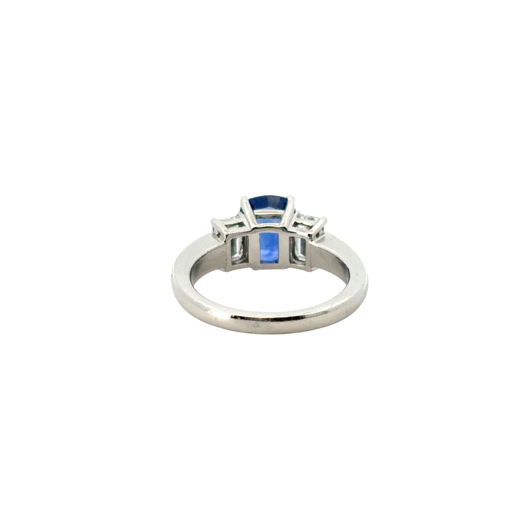 Platinum 3 Stone Ring set with Natural Cushion Blue Sapphire and Emerald Cut Diamond Side Stones
