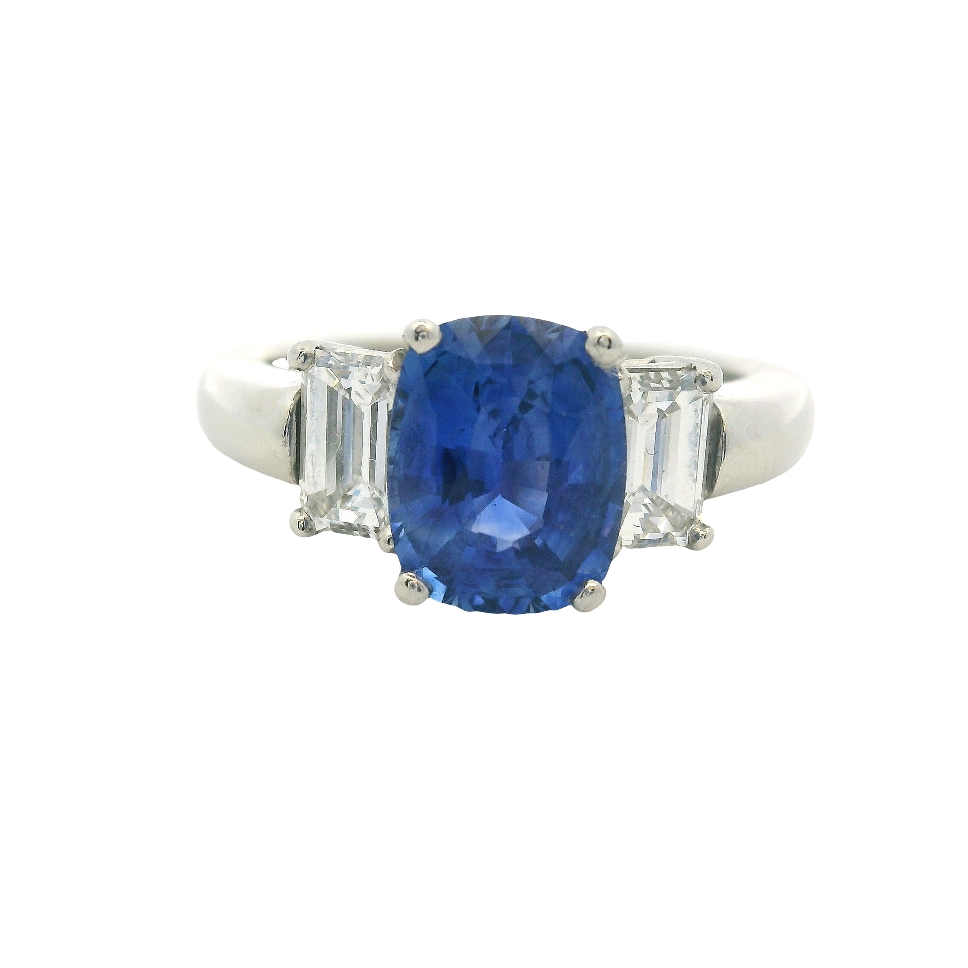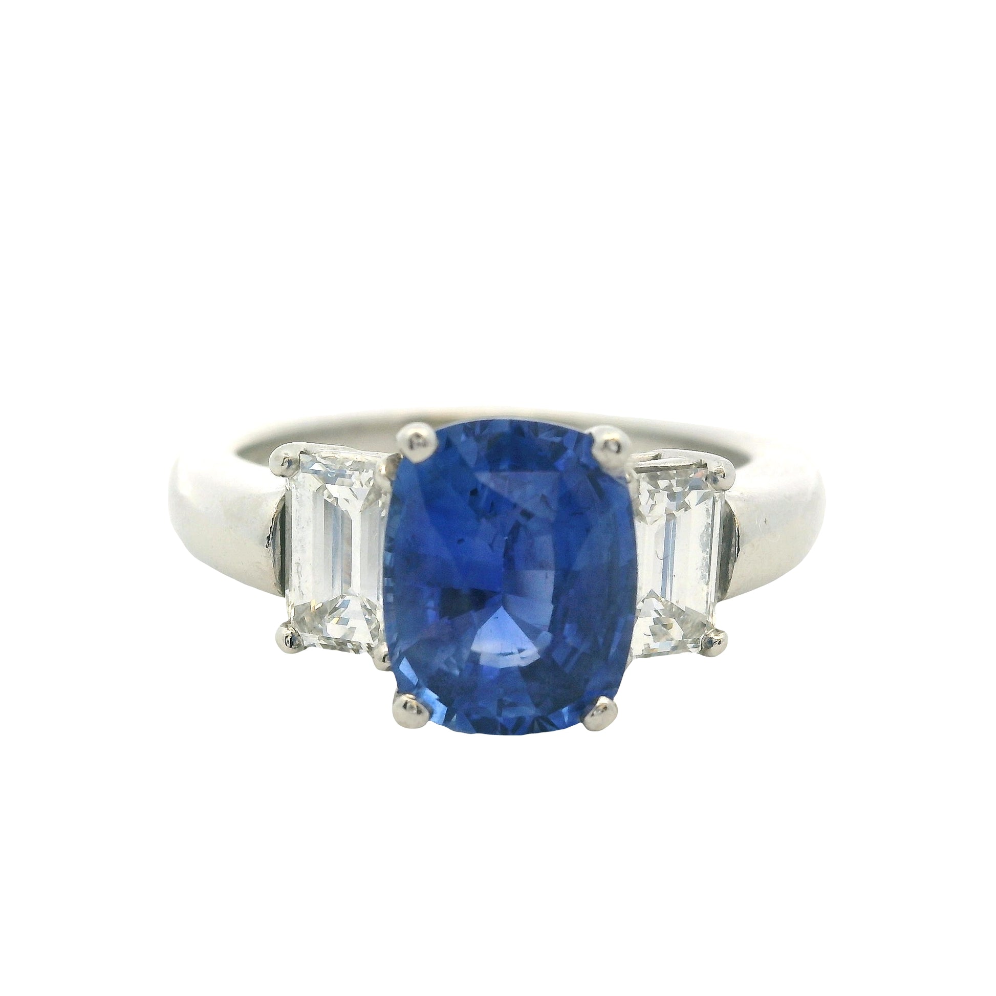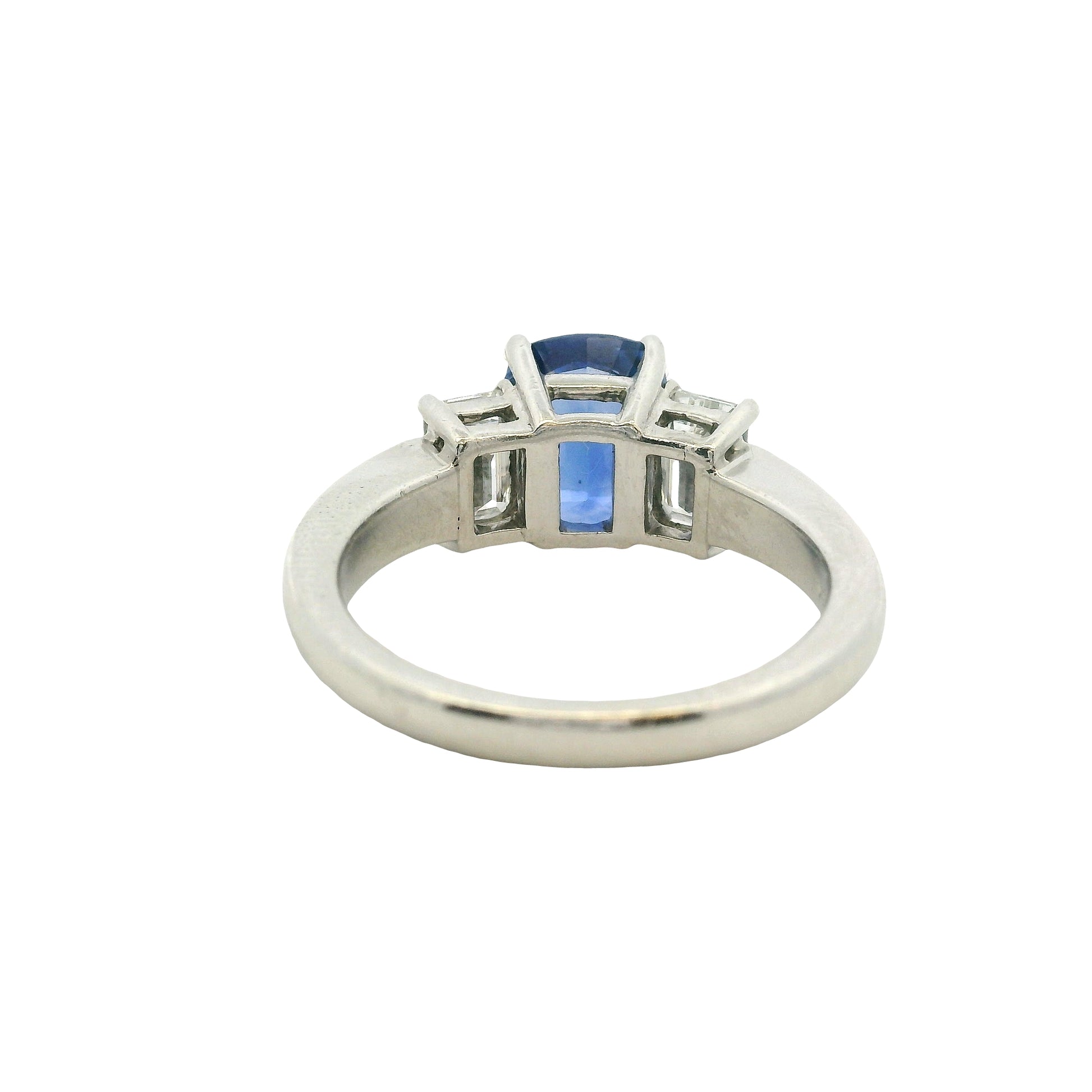 Platinum 3 Stone Ring set with Natural Cushion Blue Sapphire and Emerald Cut Diamond Side Stones
