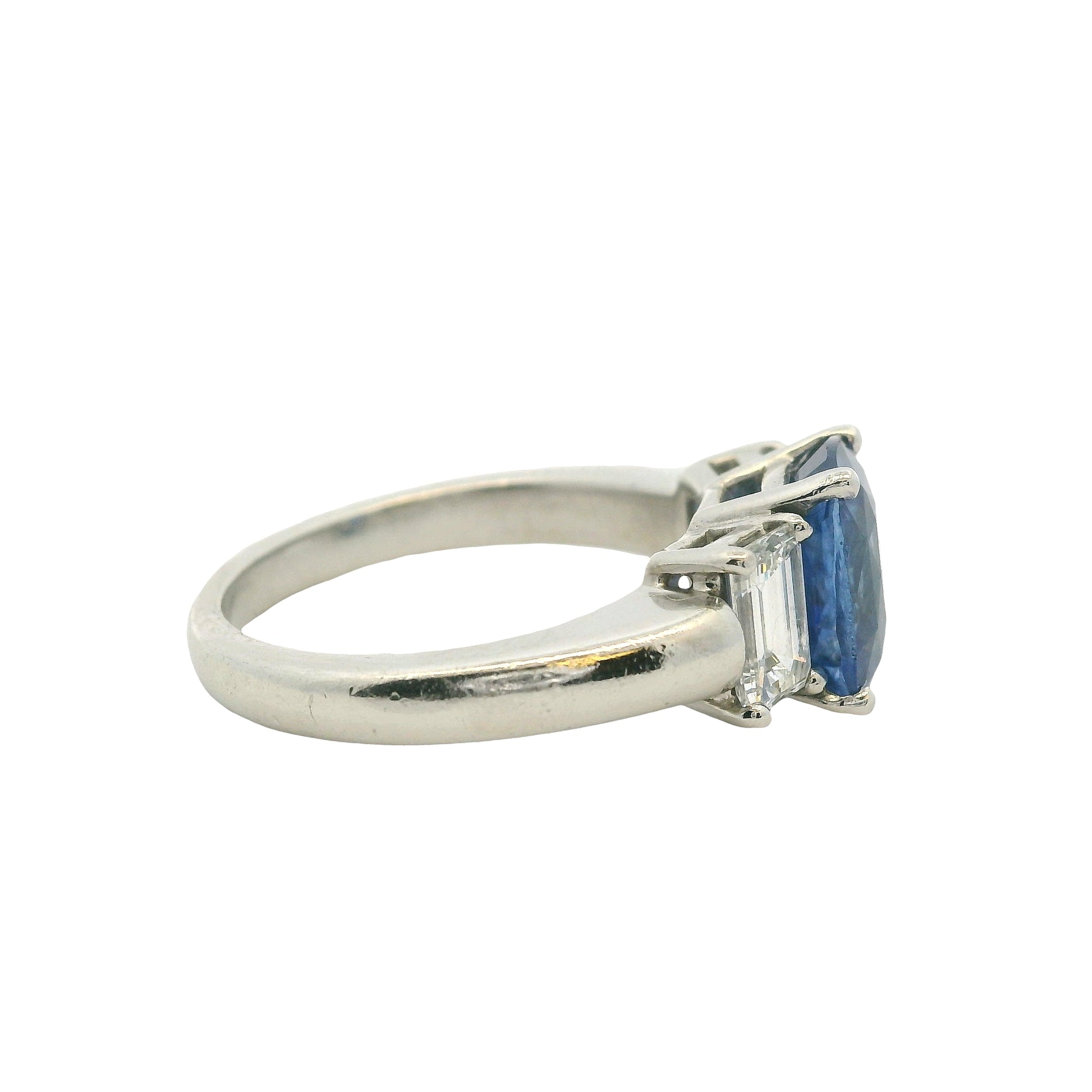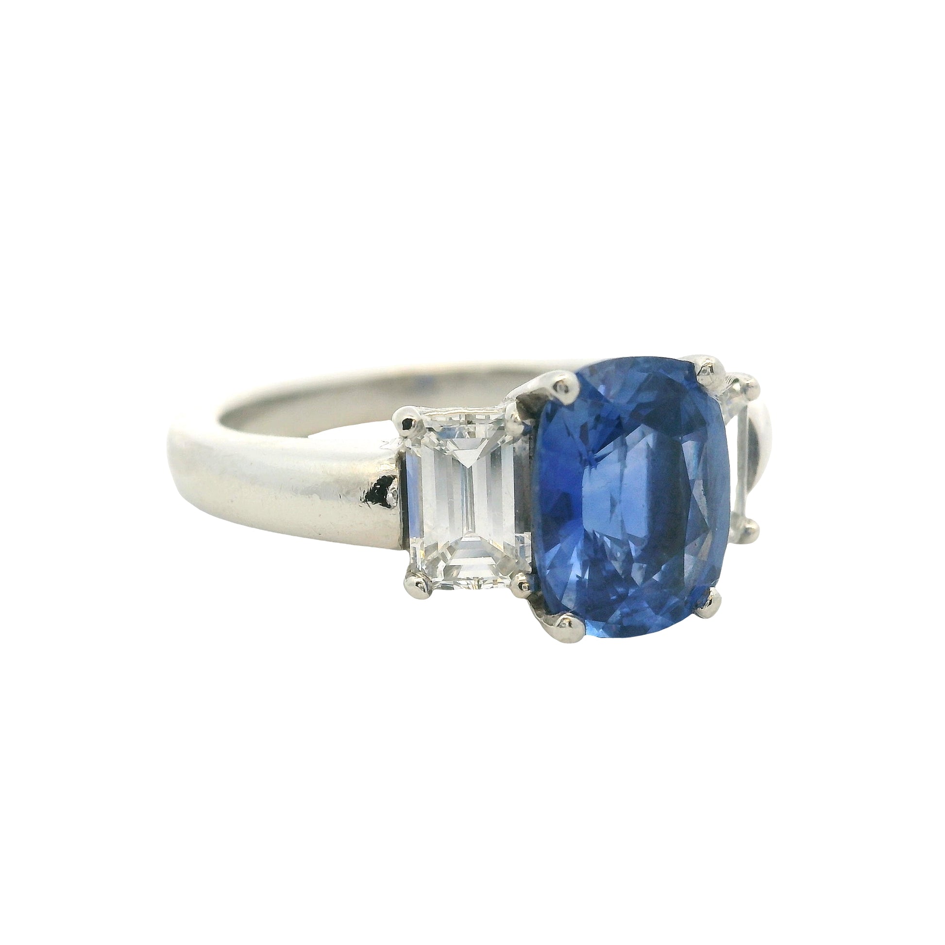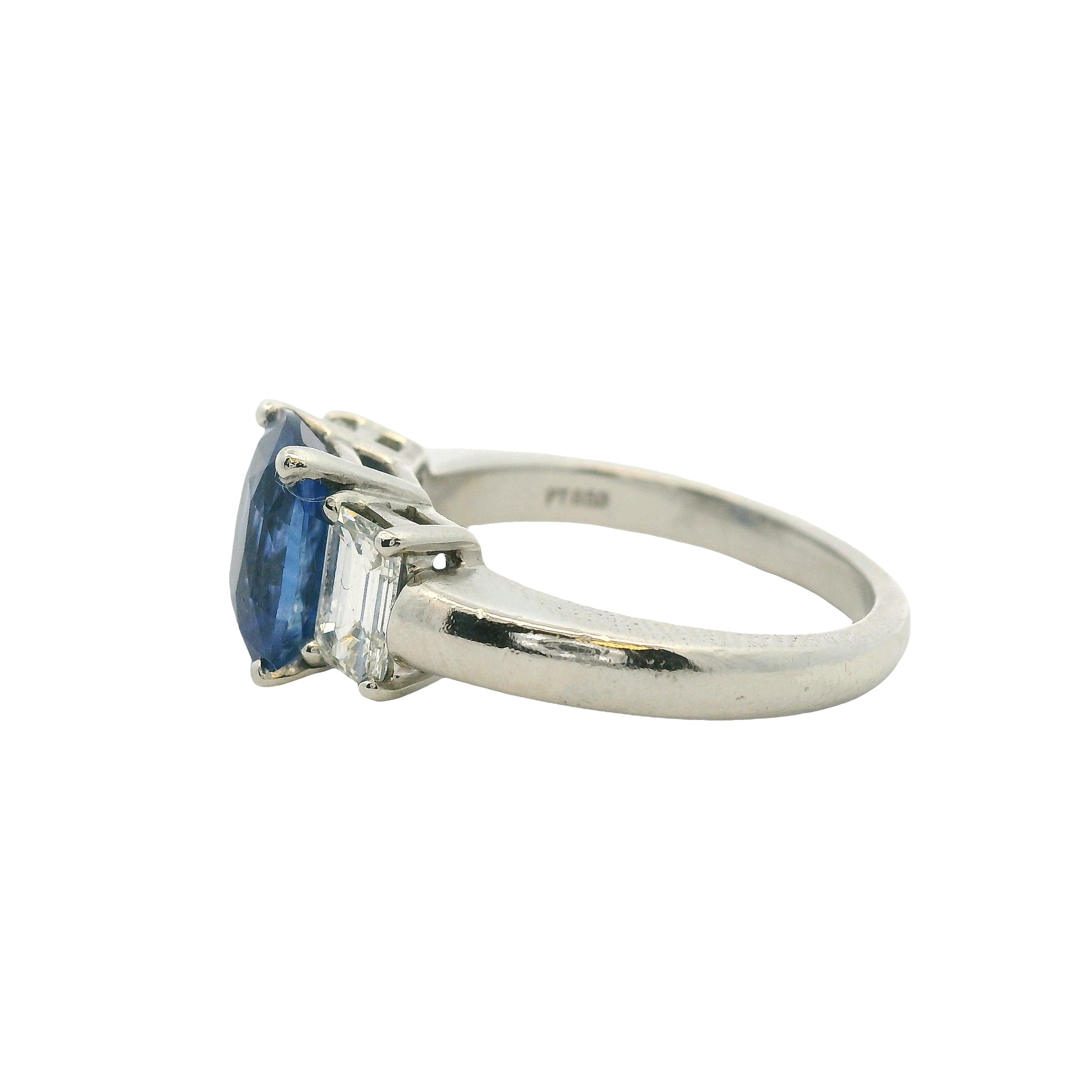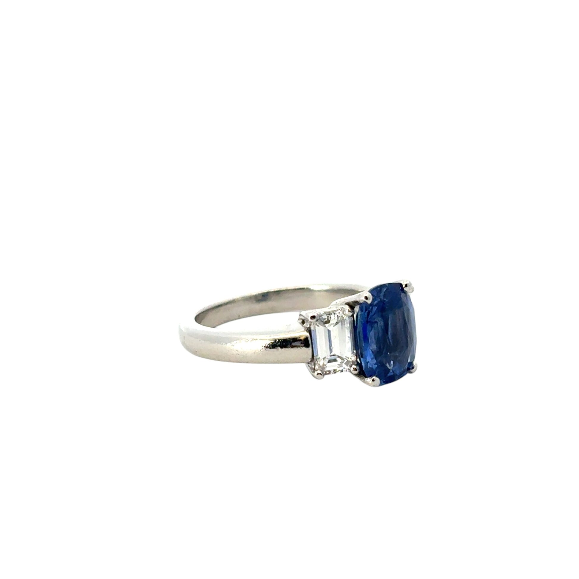 It showcases a mesmerizing Natural Cushion cut Sapphire stone surrounded by two emerald cut diamonds.