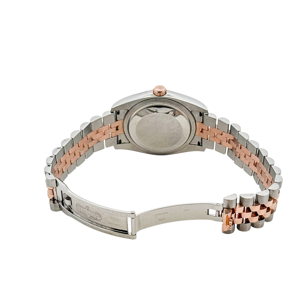 Elevate your wrist game with this extraordinary Rolex Datejust 116231, a statement of elegance that merges classic craftsmanship with contemporary charm. This scrambled serial two-tone stunner features a 36 mm case crafted from stainless steel and 18k rose gold, highlighted by a signature fixed fluted bezel in radiant rose gold.