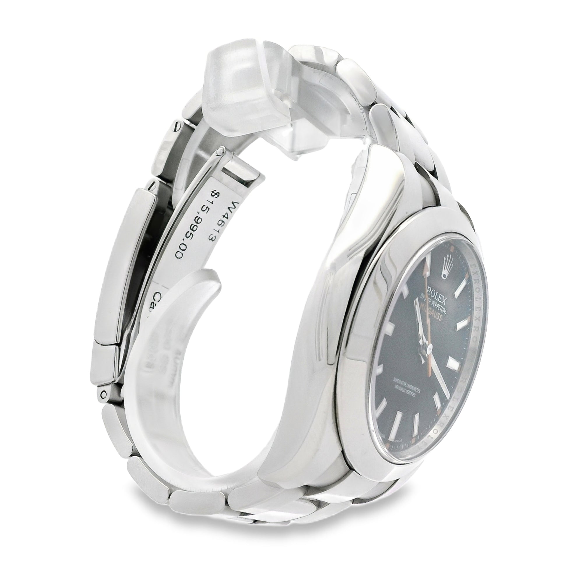 The black dial is accented with white and orange hands and hour markers, offering a bold and modern look, while the Oyster bracelet with fold-over clasp ensures comfort and a secure fit. Powered by a reliable automatic movement, the Milgauss is engineered for precision and resilience, making it a standout piece in any collection.