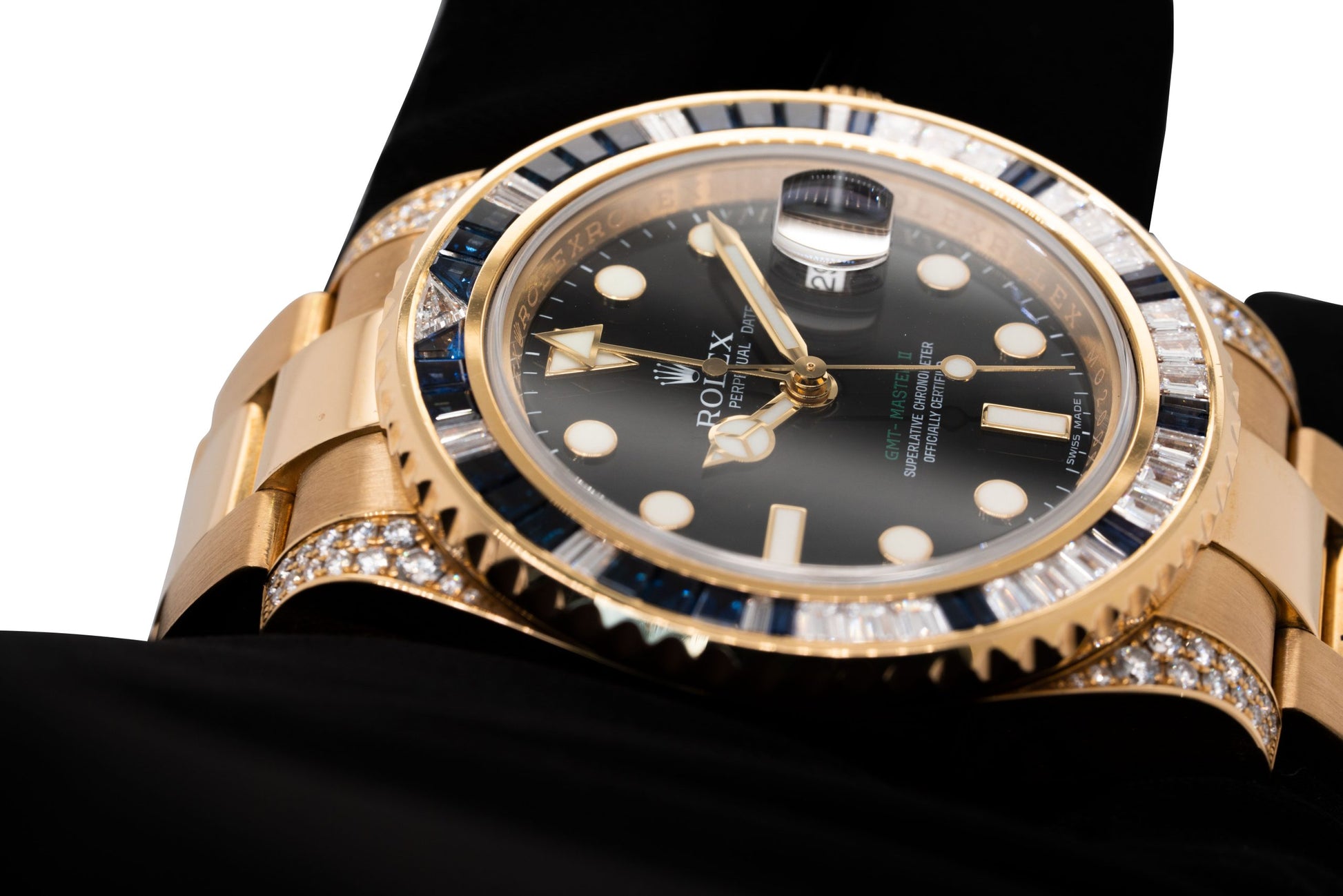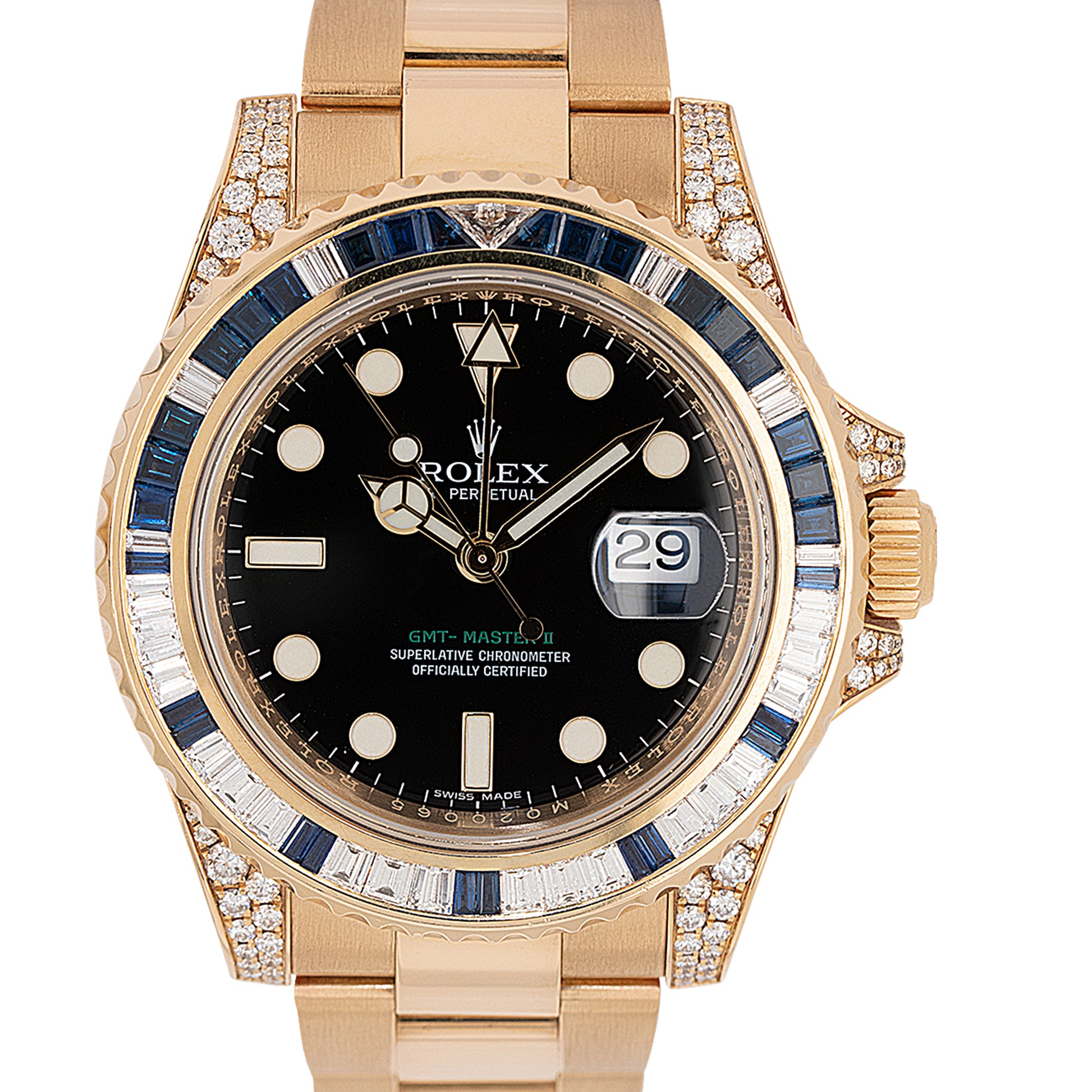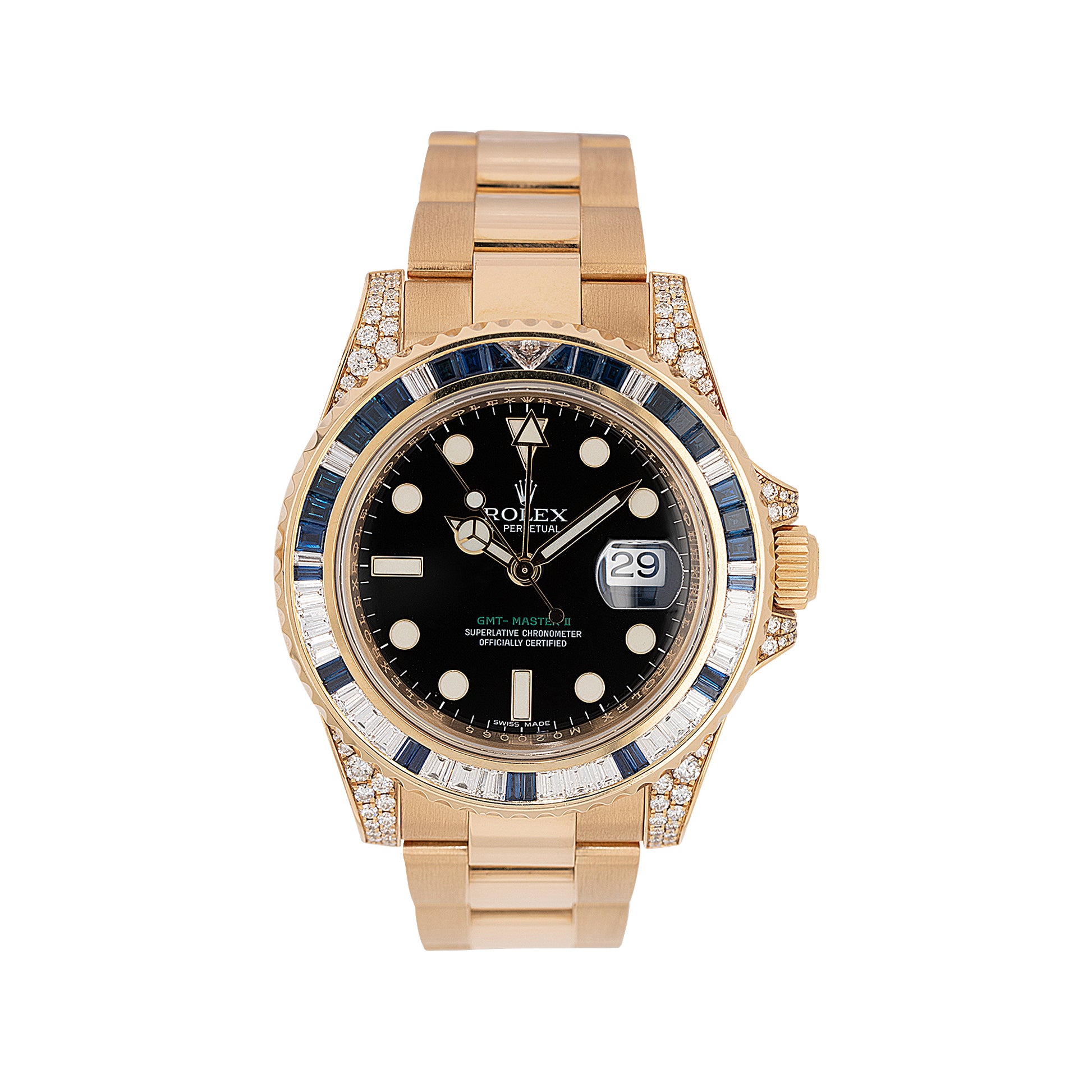 The Rolex GMT-Master II 116758SA is where professional functionality meets ultimate luxury. Crafted in solid 18k yellow gold, this masterpiece features a breathtaking factory-set bezel of baguette-cut diamonds and blue sapphires—an opulent twist on the iconic GMT design.