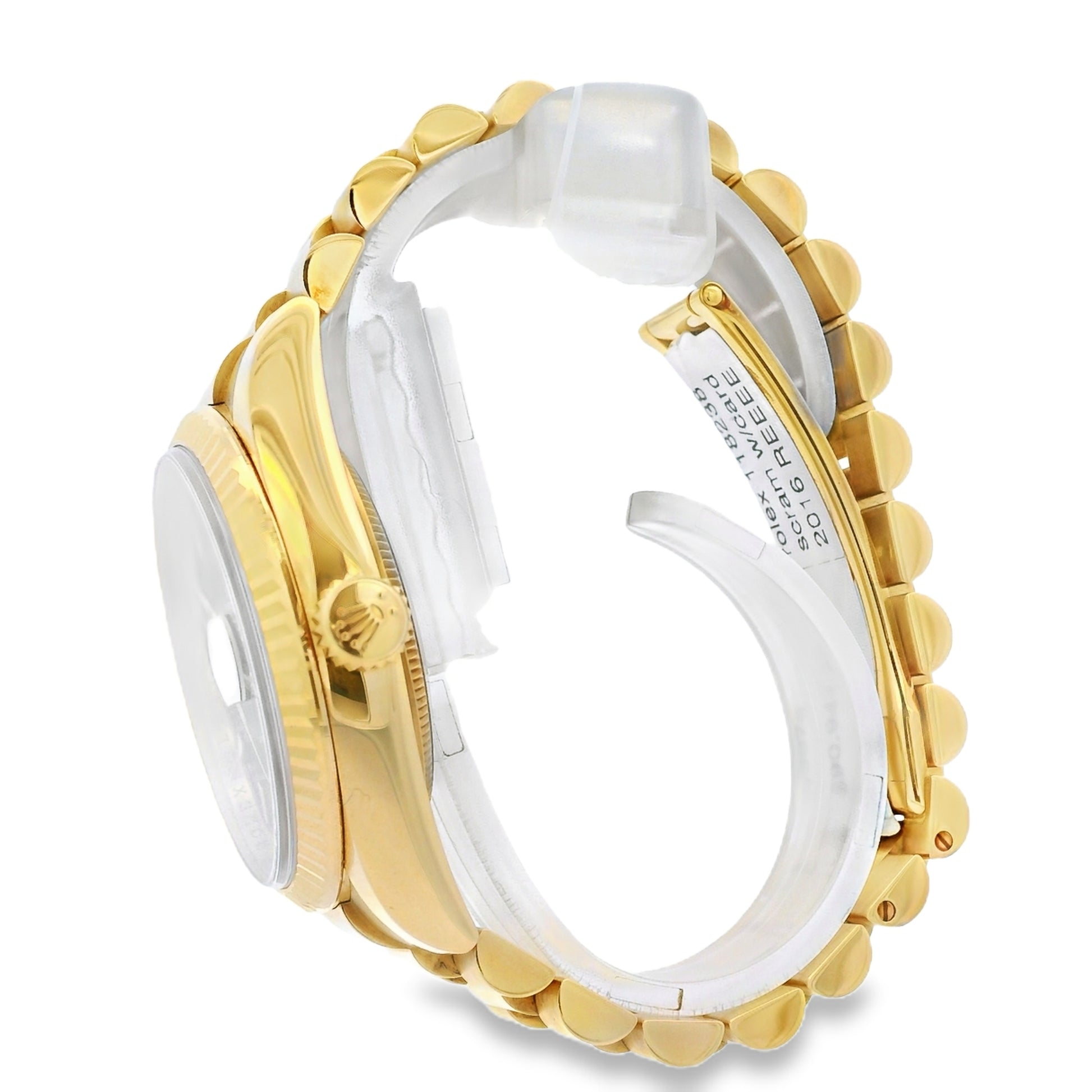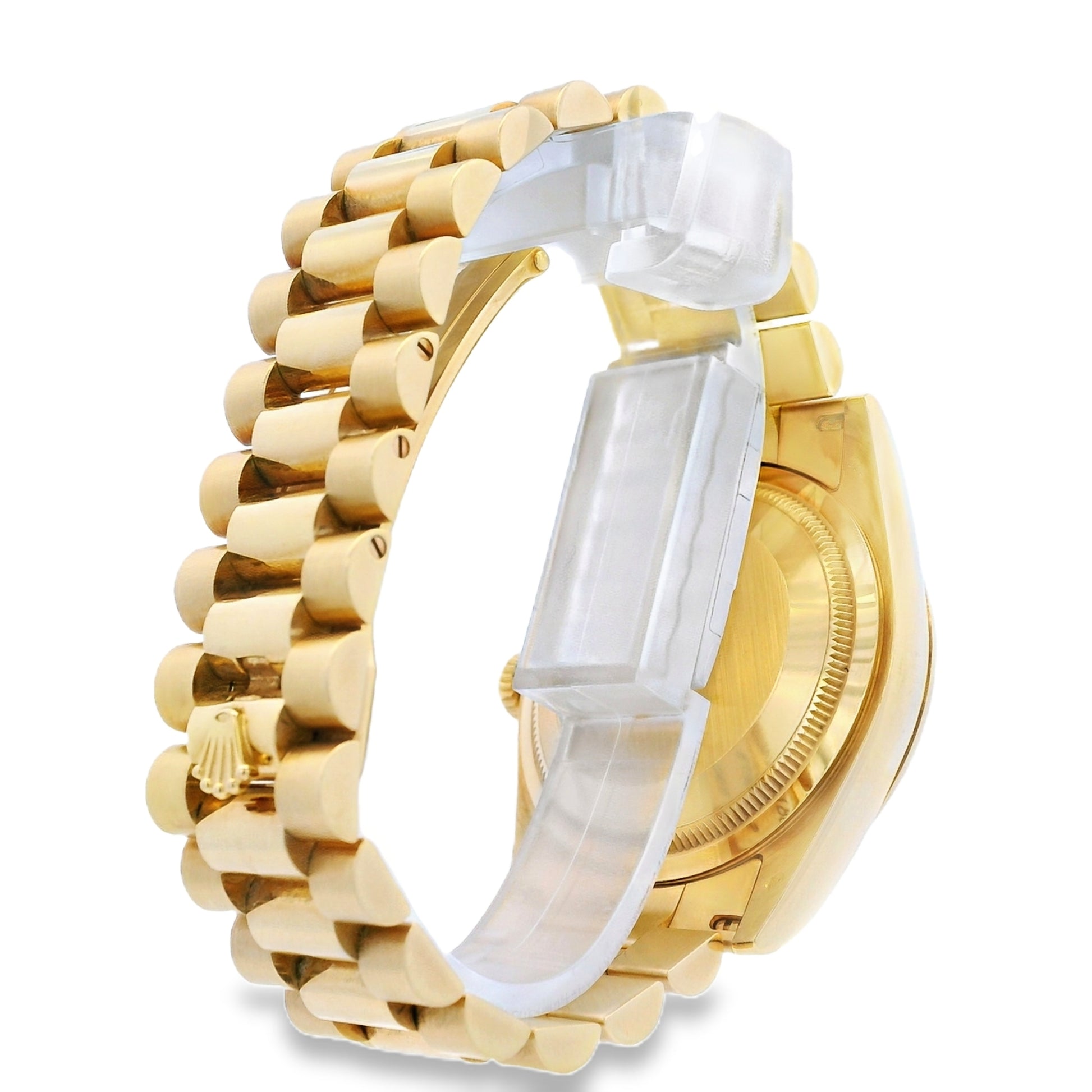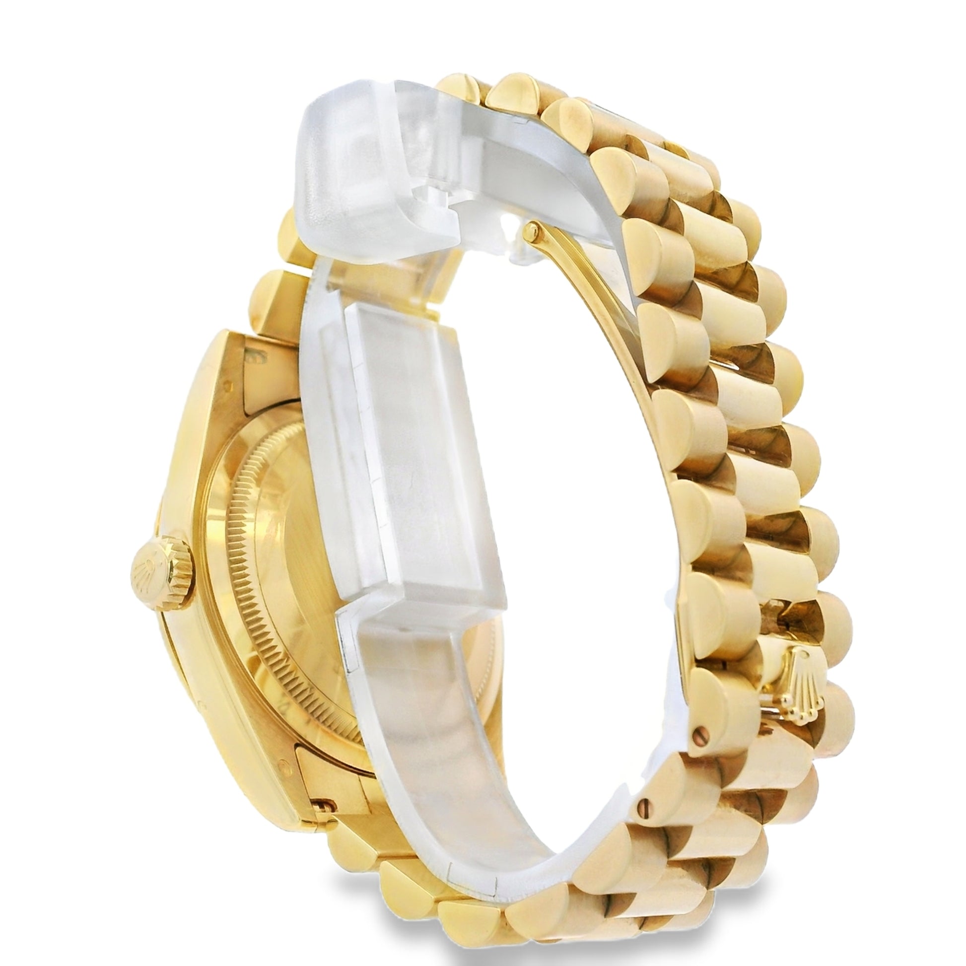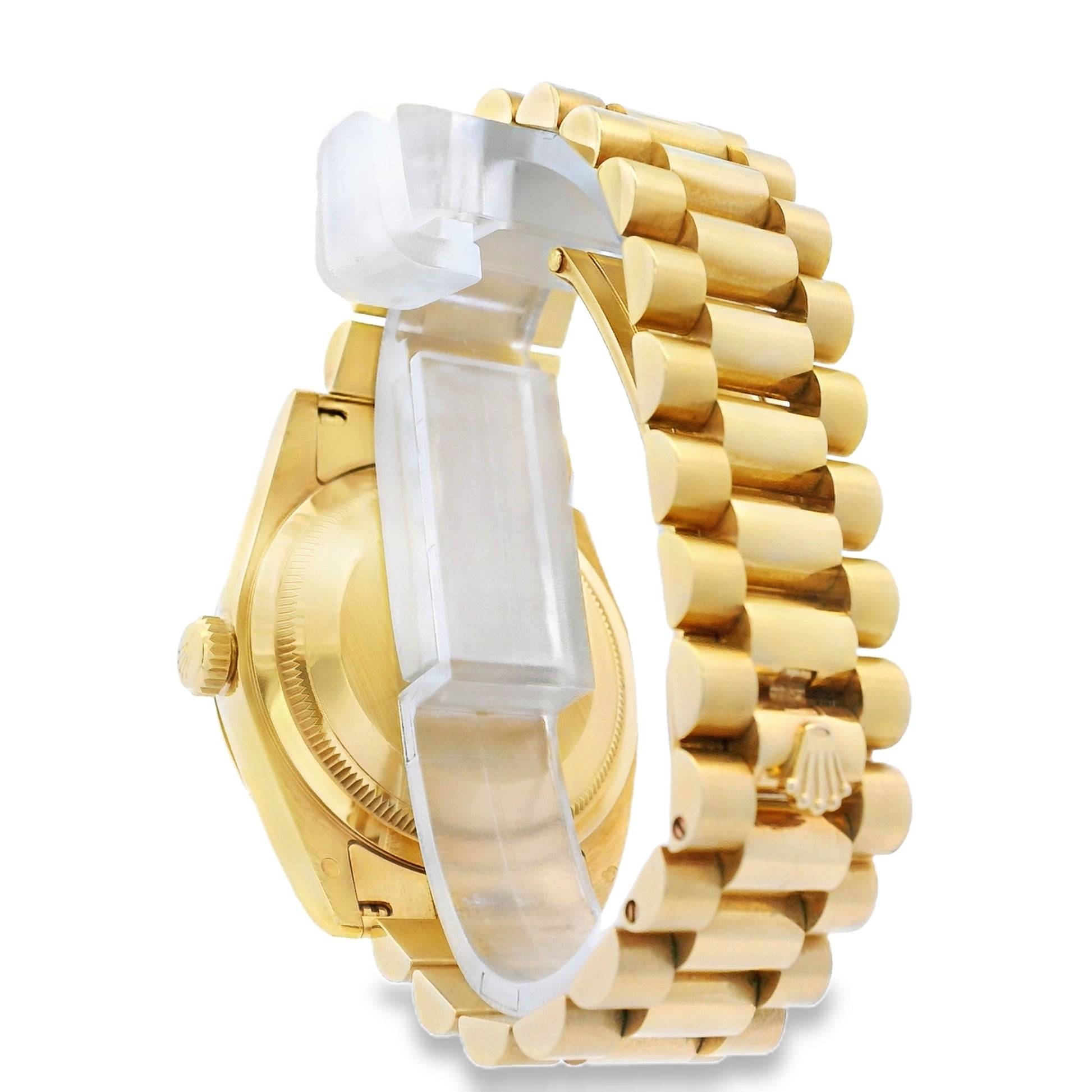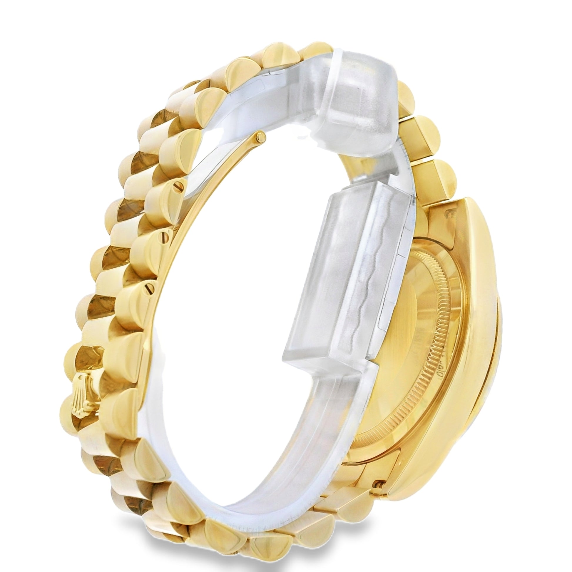 Powered by a Rolex automatic movement, the Day-Date delivers exceptional precision and reliability. The iconic President bracelet, crafted in matching 18k yellow gold, provides superior comfort and a seamless fit, secured with a fold-over clasp. This watch is sized to fit a 6.5-inch wrist and features a scrambled serial, reflecting a modern production era.