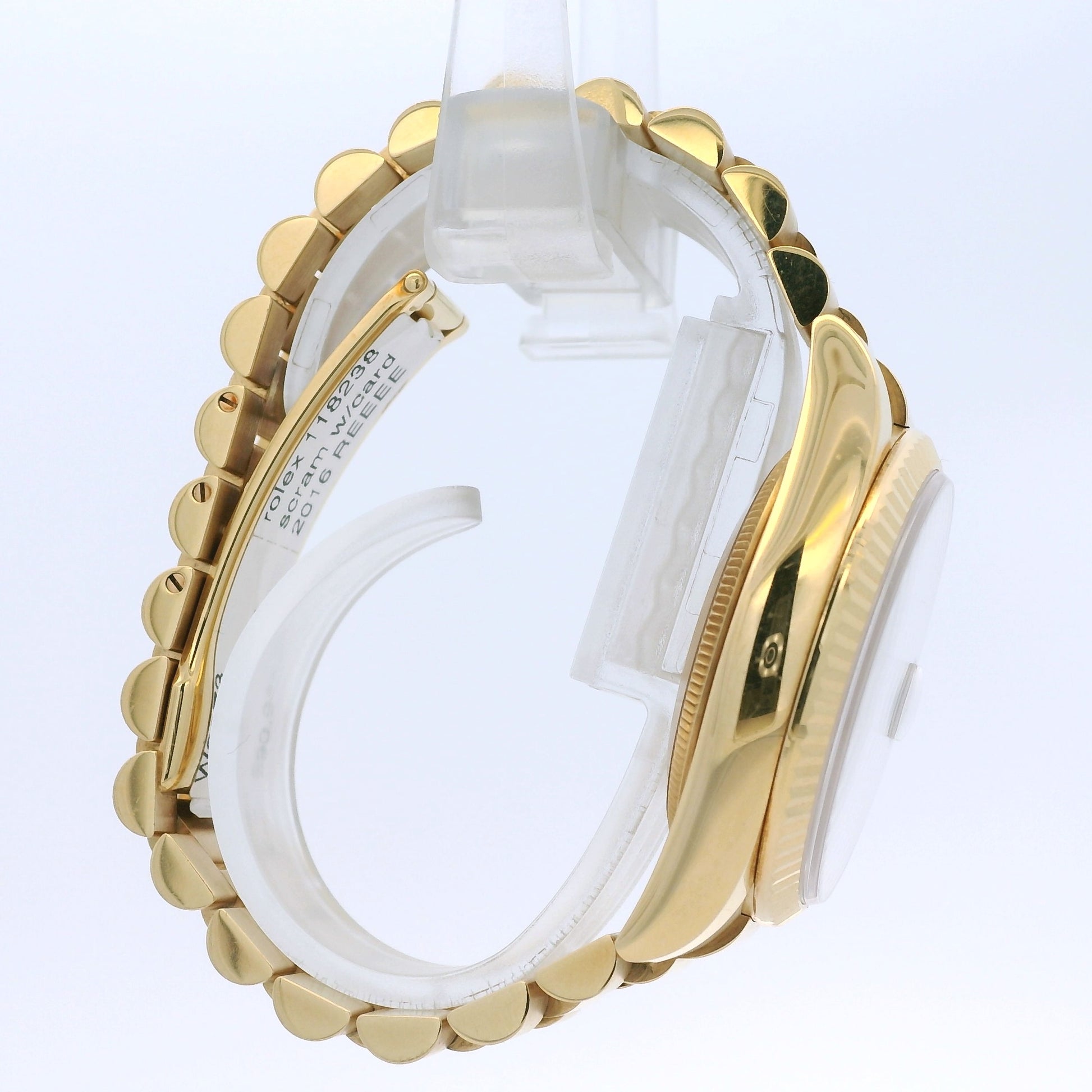 The Rolex Day-Date reference 118238 is an iconic symbol of prestige and timeless luxury, crafted entirely in 18k yellow gold. Featuring a classic 36mm case, this distinguished timepiece embodies the elegance and authority that have defined the Day-Date collection since its introduction.